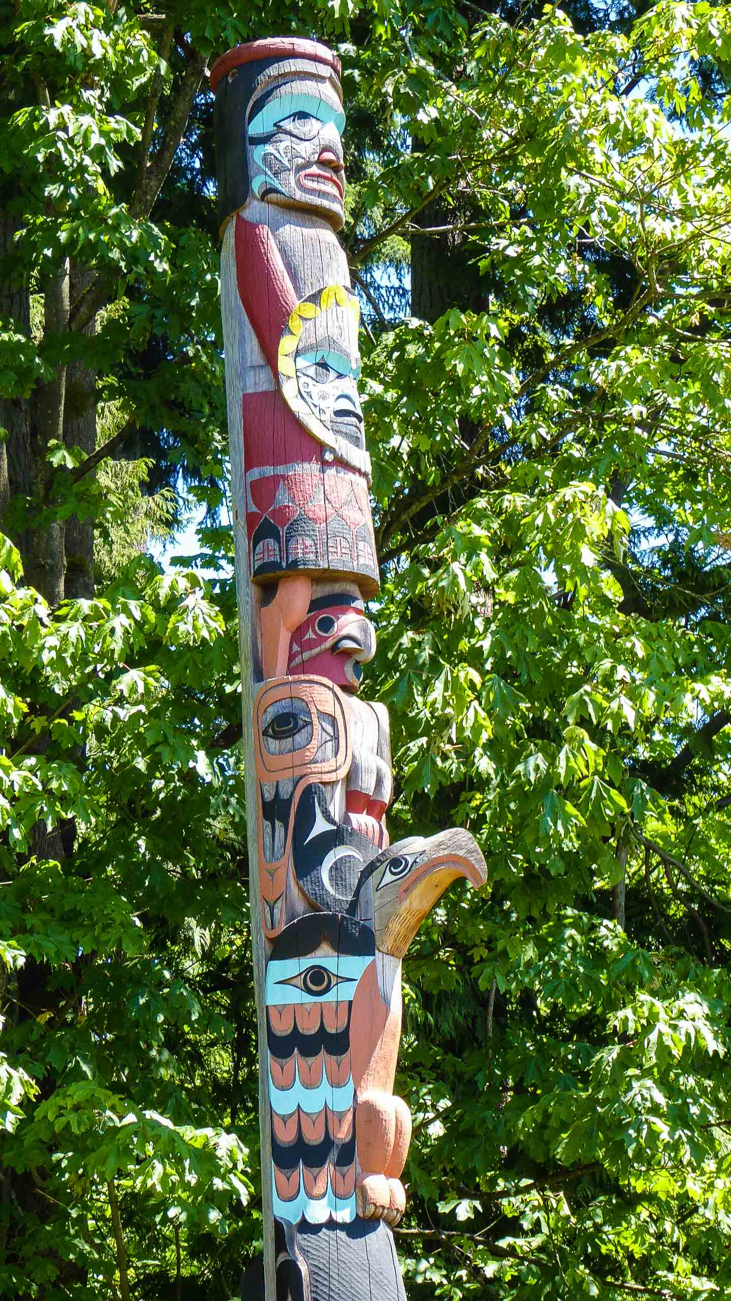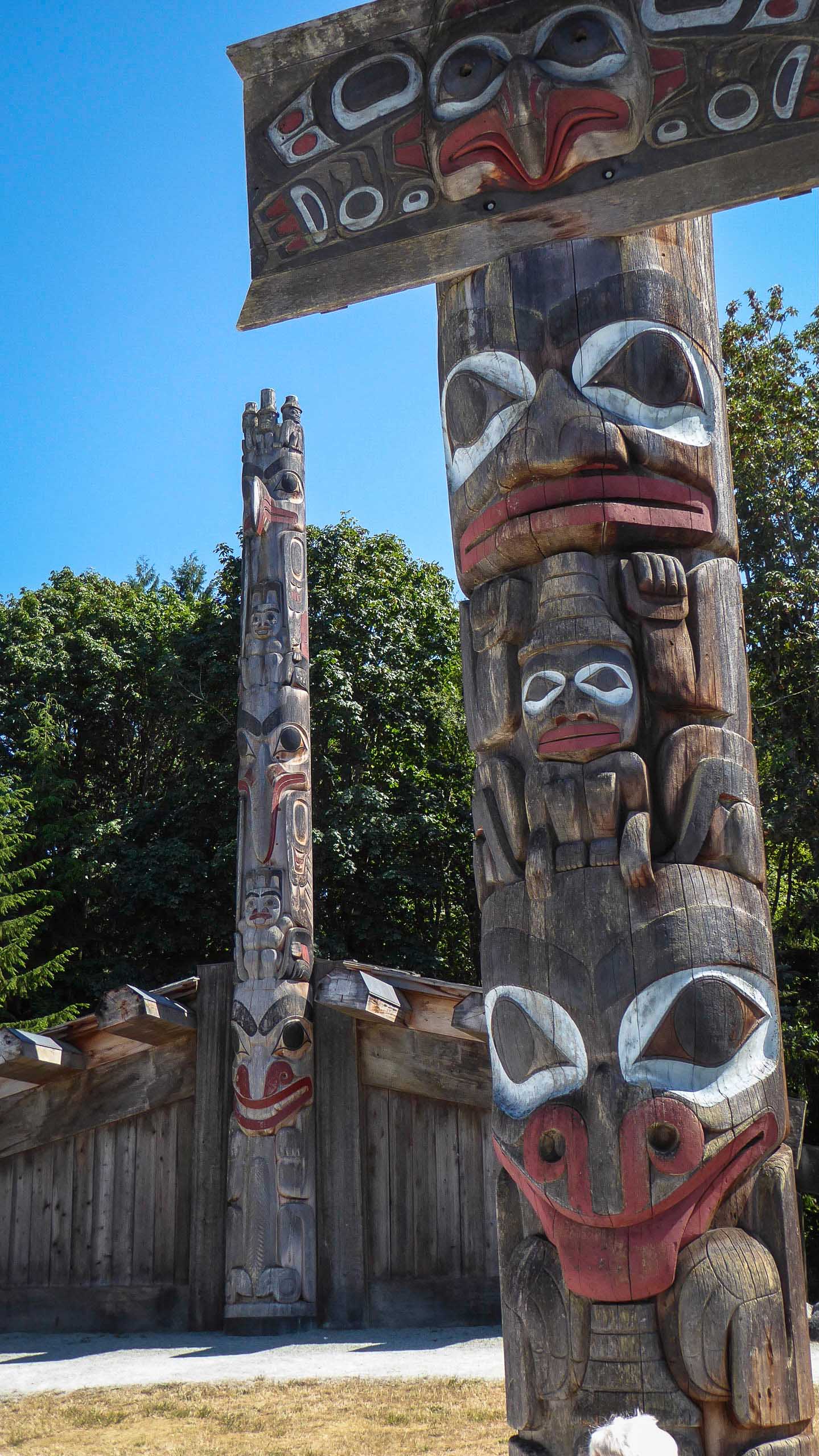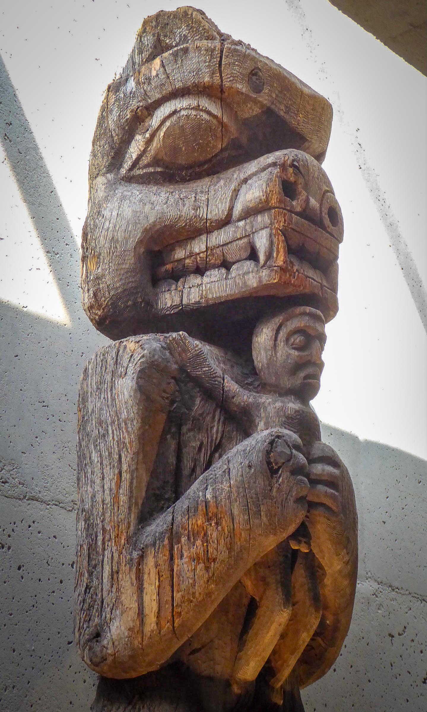 Then we spent a great day with Bob’s brother, Ted and Marg, and his sister, Linda at the Museum of Anthropology at UBC, founded in 1947, it is renowned for its displays of world arts and culture. It has a number of large sculptures, totem poles, and cultural artifacts. Although MOA’s focus is on the First Nations of the Northwest Coast. The most iconic object in the Museum is the yellow cedar sculpture The Raven and the First Men by Bill Reid, which was depicted on the Canadian $20 bill from 2004 to 2012. The Museum’s Great Hall contains many fragments of totem poles, my favorite area, from Haida and other First Nation villages along BC’s coast. The Haida houses outside the Museum, where we had a guided tour, were also built under the direction of Bill Reid. The new building designed by Arthur Erickson in 1976, was inspired by the post-and-beam architecture of the NW Coast First Nations people. This Museum is a must see when visiting Vancouver, and the surrounding campus of the University of BC.