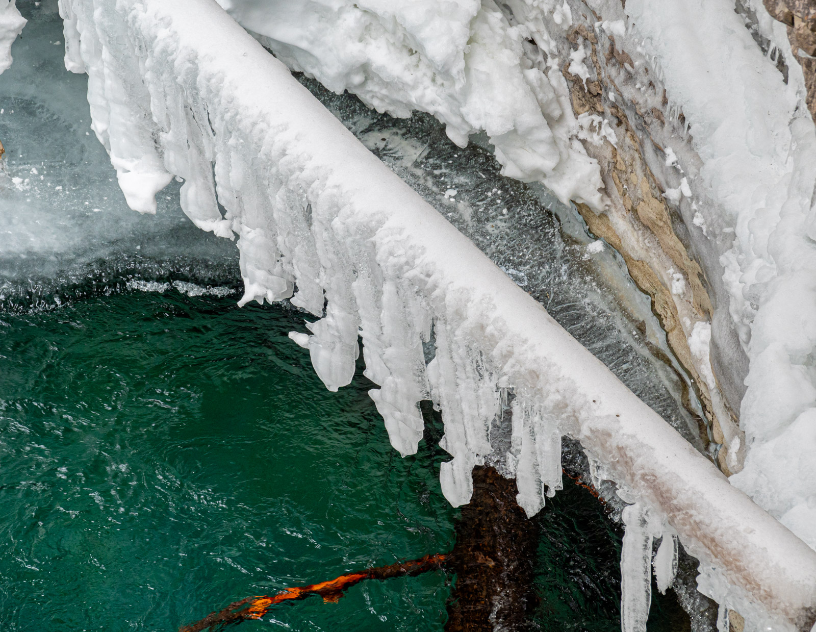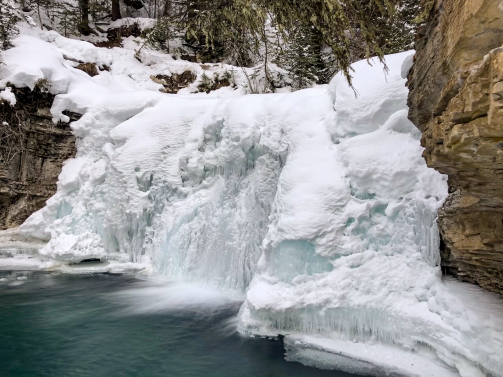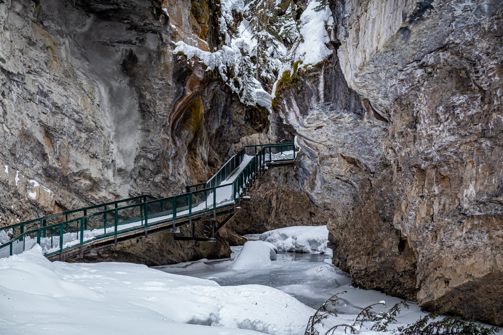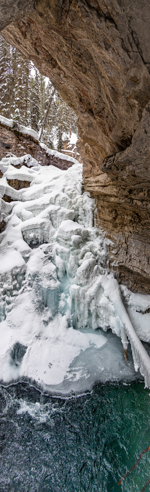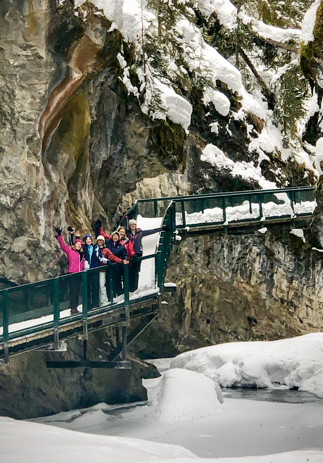 Johnston Canyon, carved steeply into the limestone bedrock by thousands of years of water erosion, is one of the most popular destinations in Banff National Park, and we decided to take a day off skiing to explore its beauty. We had to wear cleats on our boots in order to be able to walk along the icy trail. There were catwalks along the trail affixed to the limestone cliffs overhanging the creek to be able to go deeper into the Canyon, and we stopped at several viewing platforms to look at the cascading water. At the Upper Johnston Falls there is a platform overhanging the gorge and looks across to the top of the falls that drop a dramatic 40 meters, where we took several photos of the ice climbers on the ice wall. The trail is only a 3.1 mile round trip, and well worth the time and scenery to go the whole way to the Upper Falls. Click on thumbnail to view images