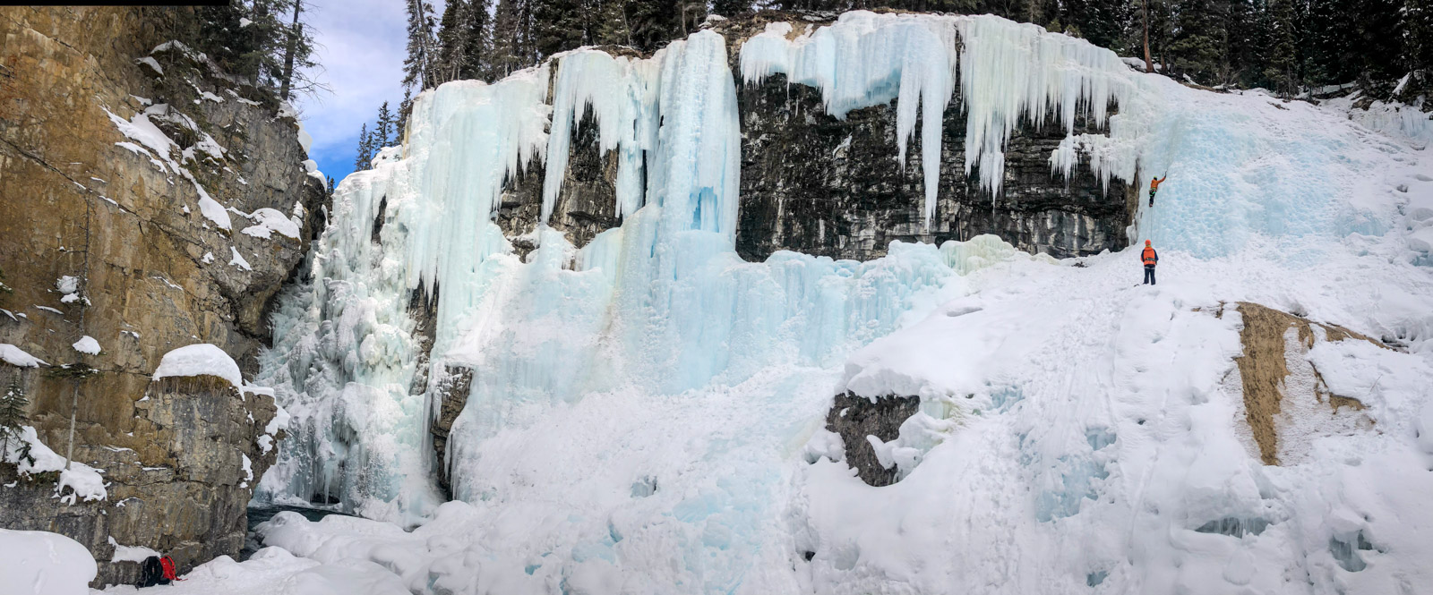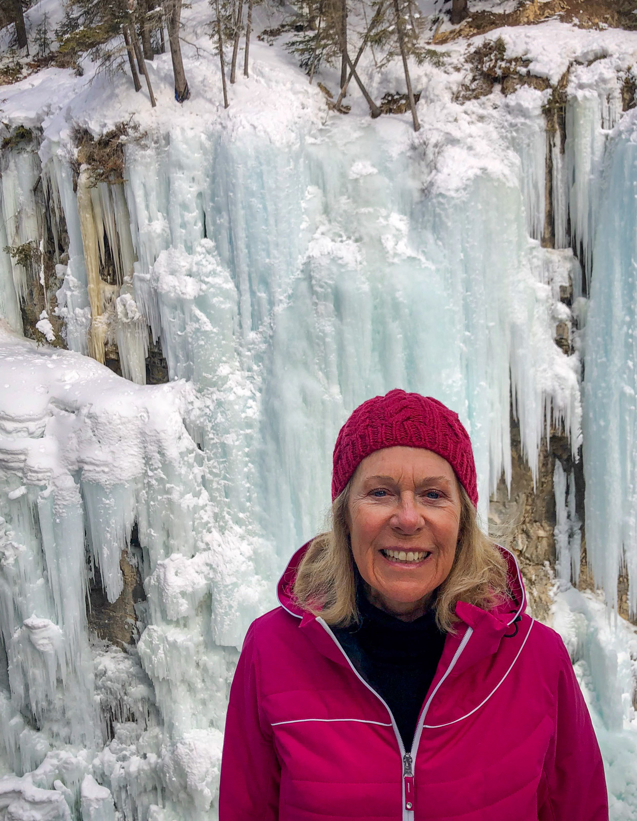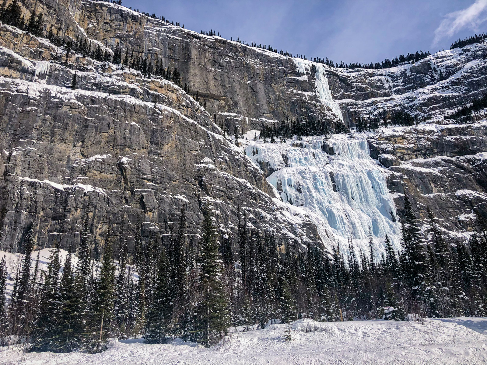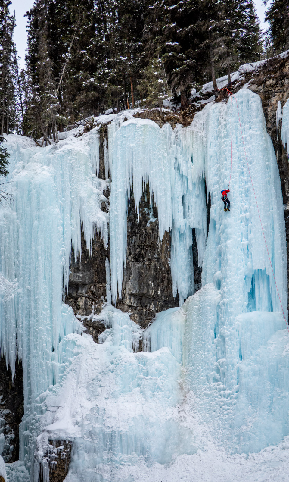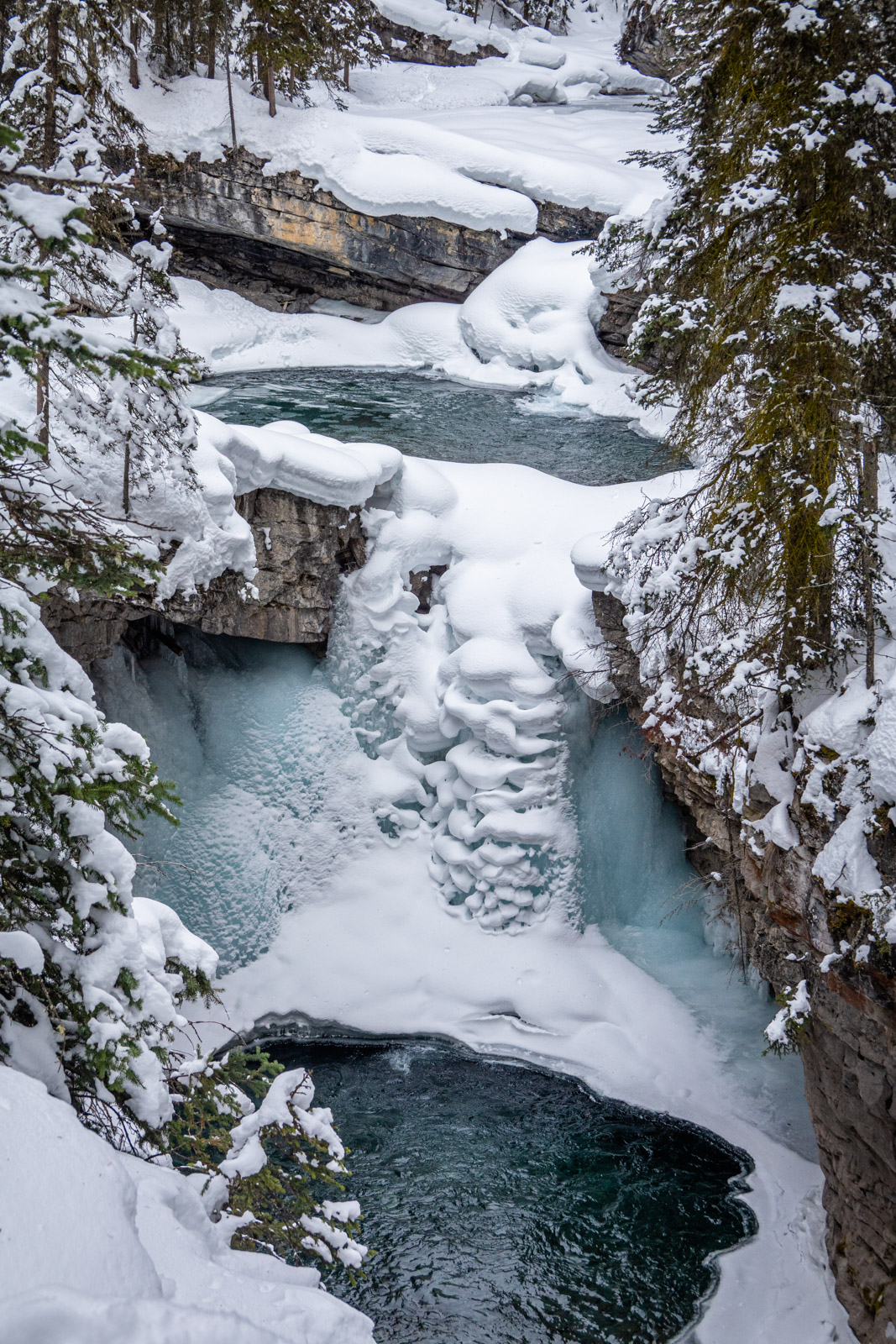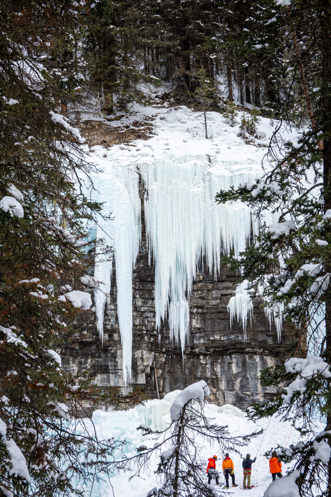 Johnston Canyon, carved steeply into the limestone bedrock by thousands of years of water erosion, is one of the most popular destinations in Banff National Park, and we decided to take a day off skiing to explore its beauty. We had to wear cleats on our boots in order to be able to walk along the icy trail. There were catwalks along the trail affixed to the limestone cliffs overhanging the creek to be able to go deeper into the Canyon, and we stopped at several viewing platforms to look at the cascading water. At the Upper Johnston Falls there is a platform overhanging the gorge and looks across to the top of the falls that drop a dramatic 40 meters, where we took several photos of the ice climbers on the ice wall. The trail is only a 3.1 mile round trip, and well worth the time and scenery to go the whole way to the Upper Falls. Click on thumbnail to view images