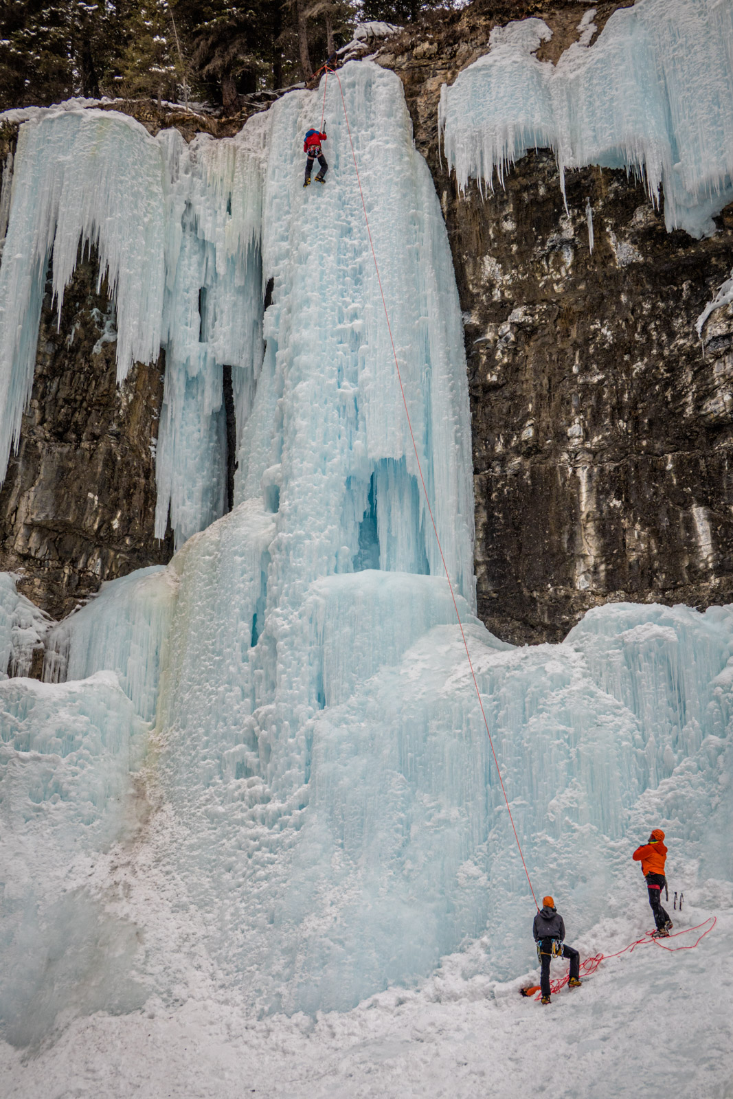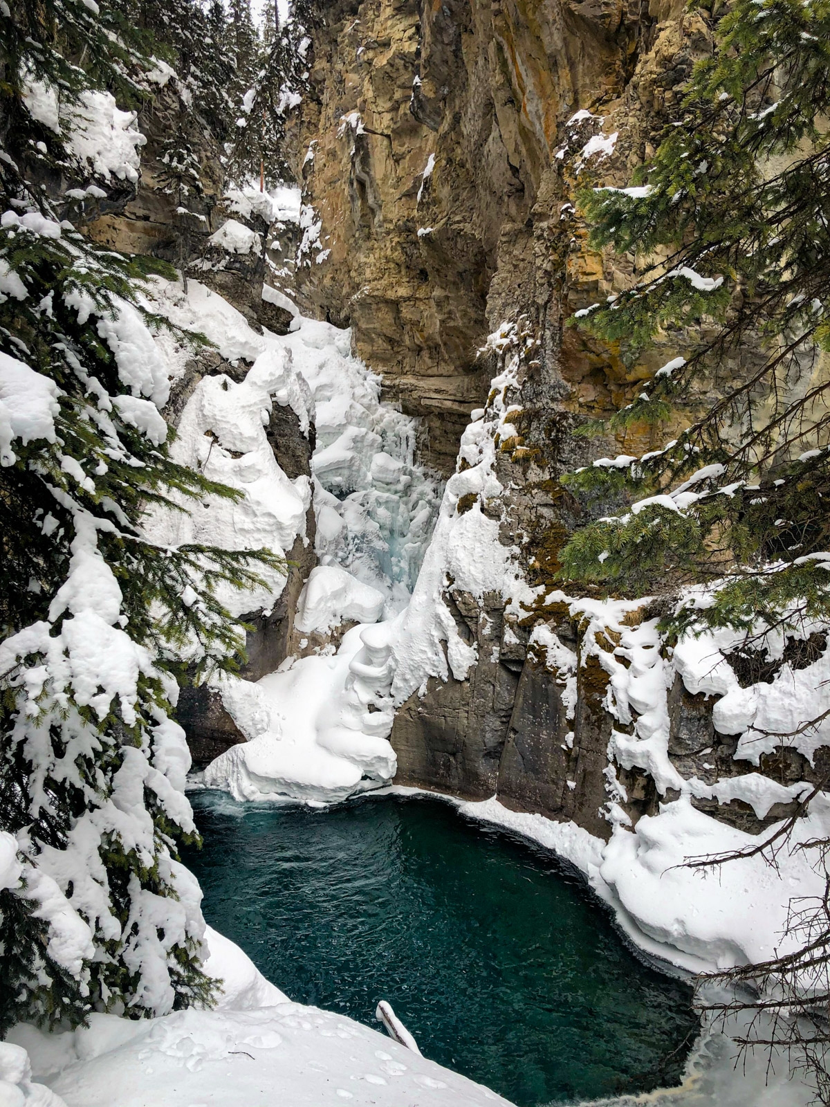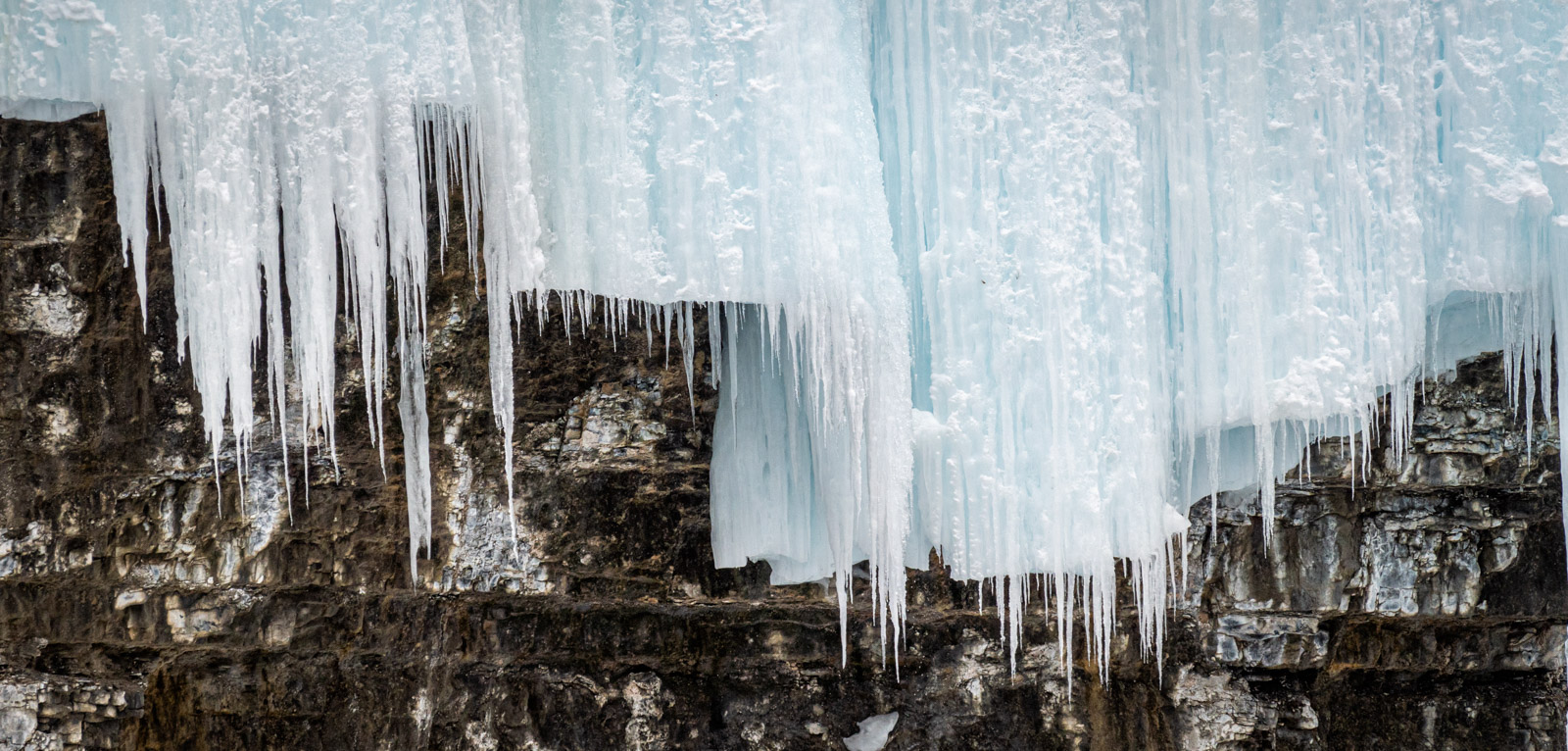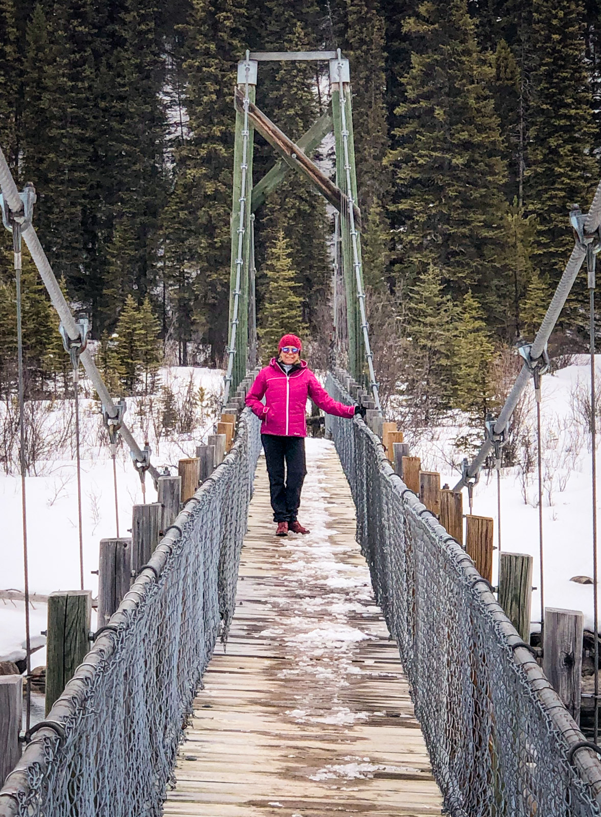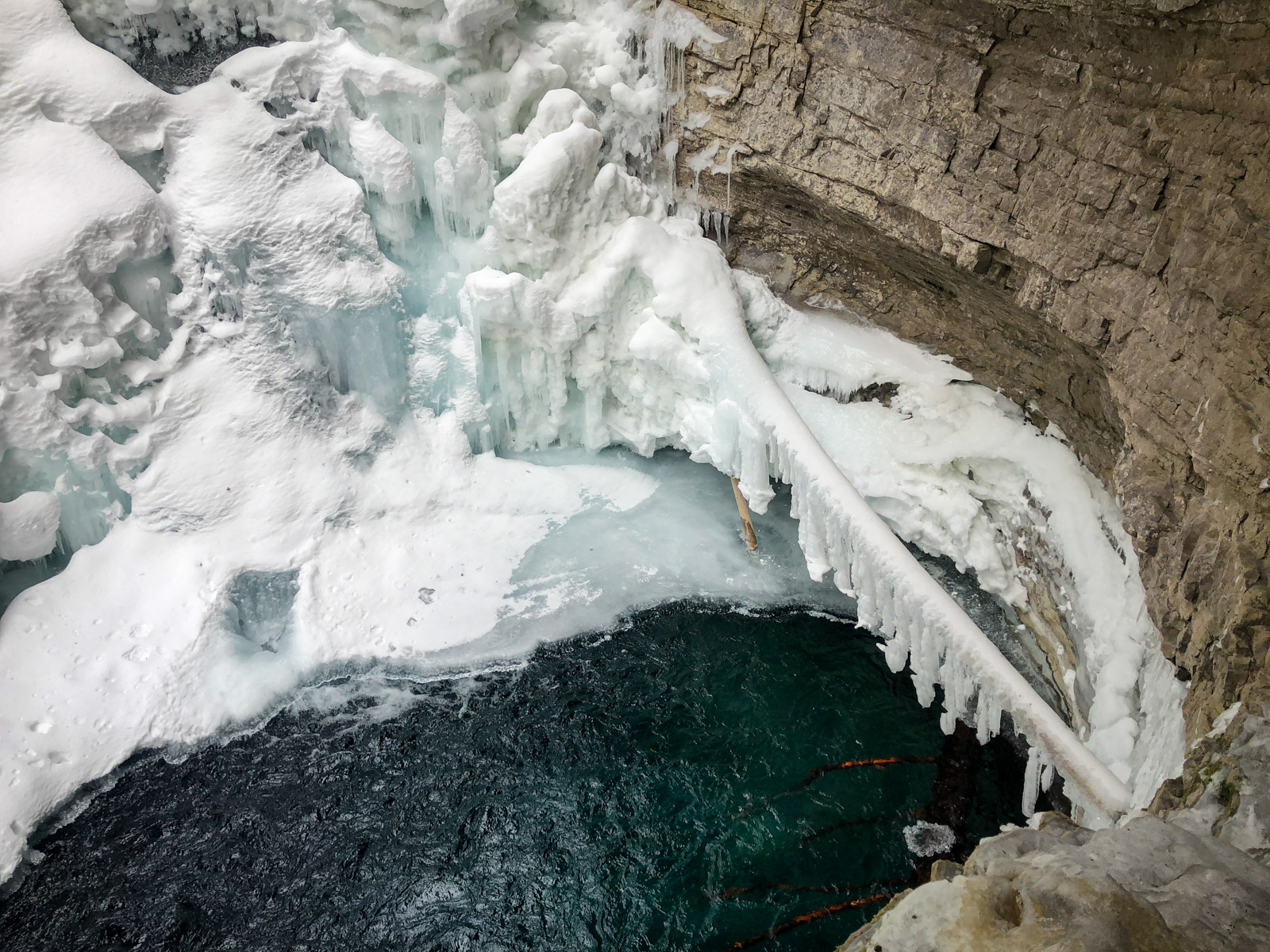 Johnston Canyon, carved steeply into the limestone bedrock by thousands of years of water erosion, is one of the most popular destinations in Banff National Park, and we decided to take a day off skiing to explore its beauty. We had to wear cleats on our boots in order to be able to walk along the icy trail. There were catwalks along the trail affixed to the limestone cliffs overhanging the creek to be able to go deeper into the Canyon, and we stopped at several viewing platforms to look at the cascading water. At the Upper Johnston Falls there is a platform overhanging the gorge and looks across to the top of the falls that drop a dramatic 40 meters, where we took several photos of the ice climbers on the ice wall. The trail is only a 3.1 mile round trip, and well worth the time and scenery to go the whole way to the Upper Falls. Click on thumbnail to view images