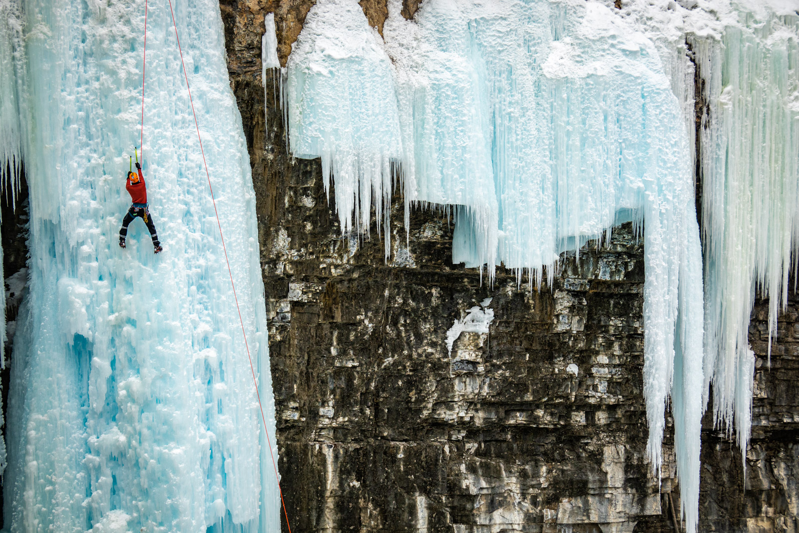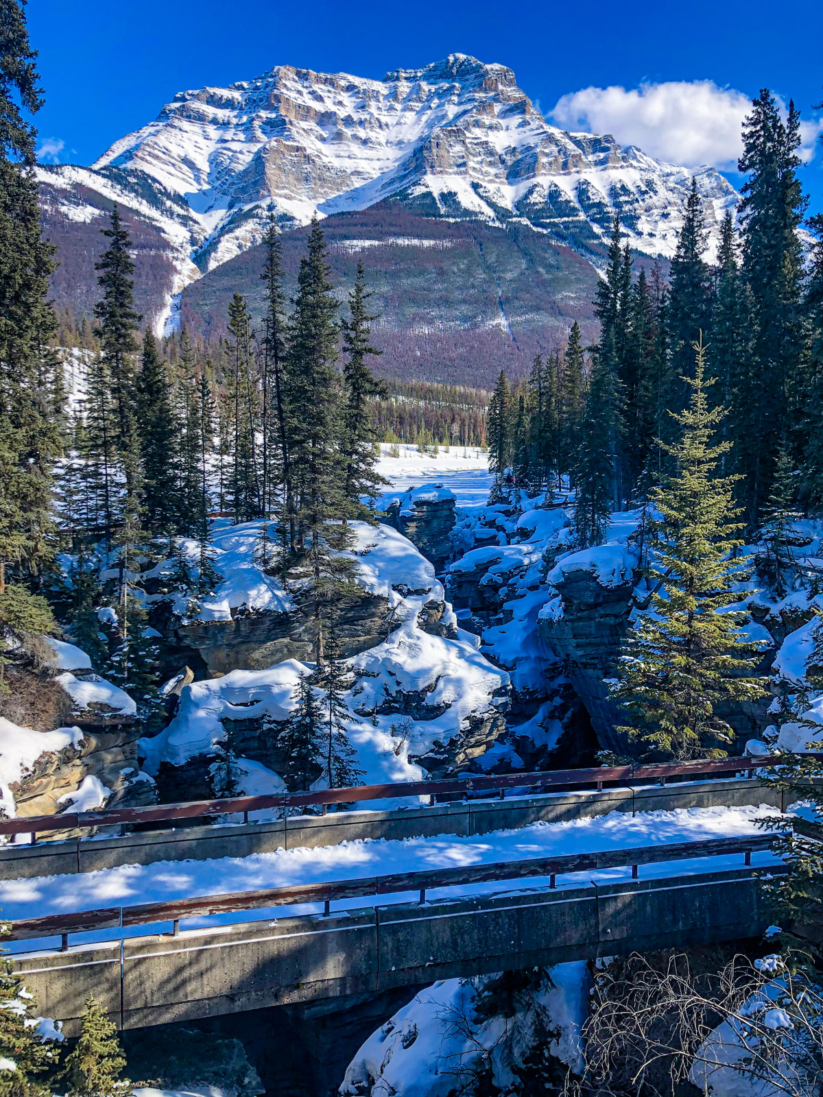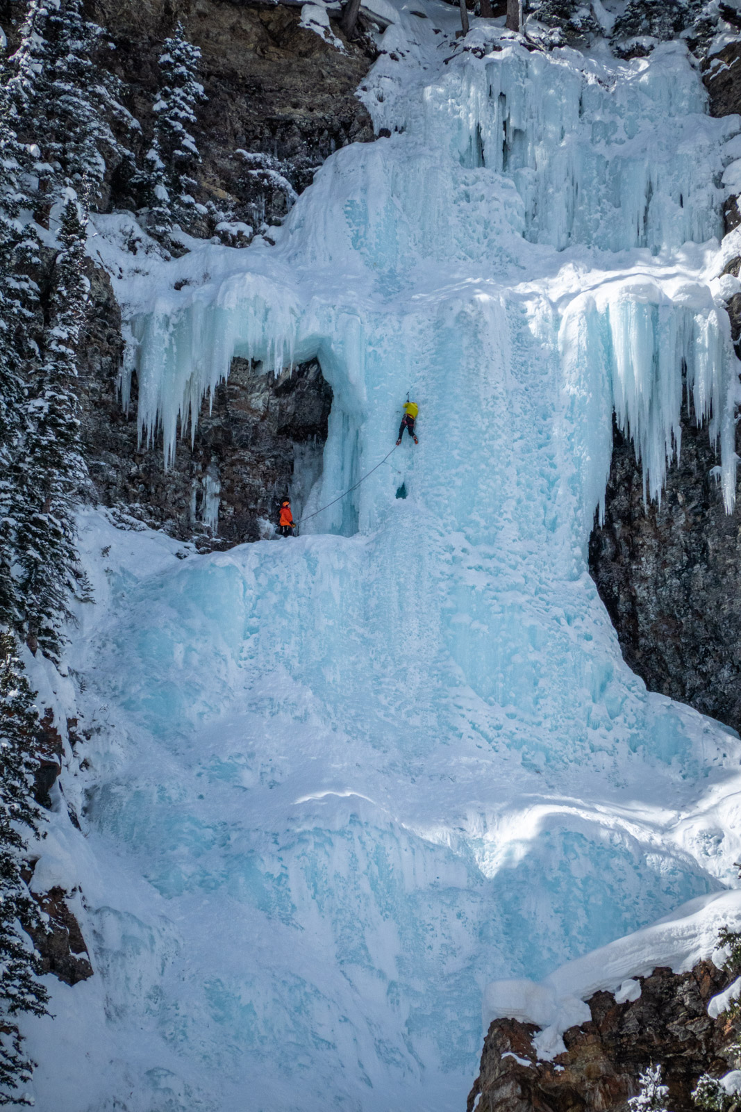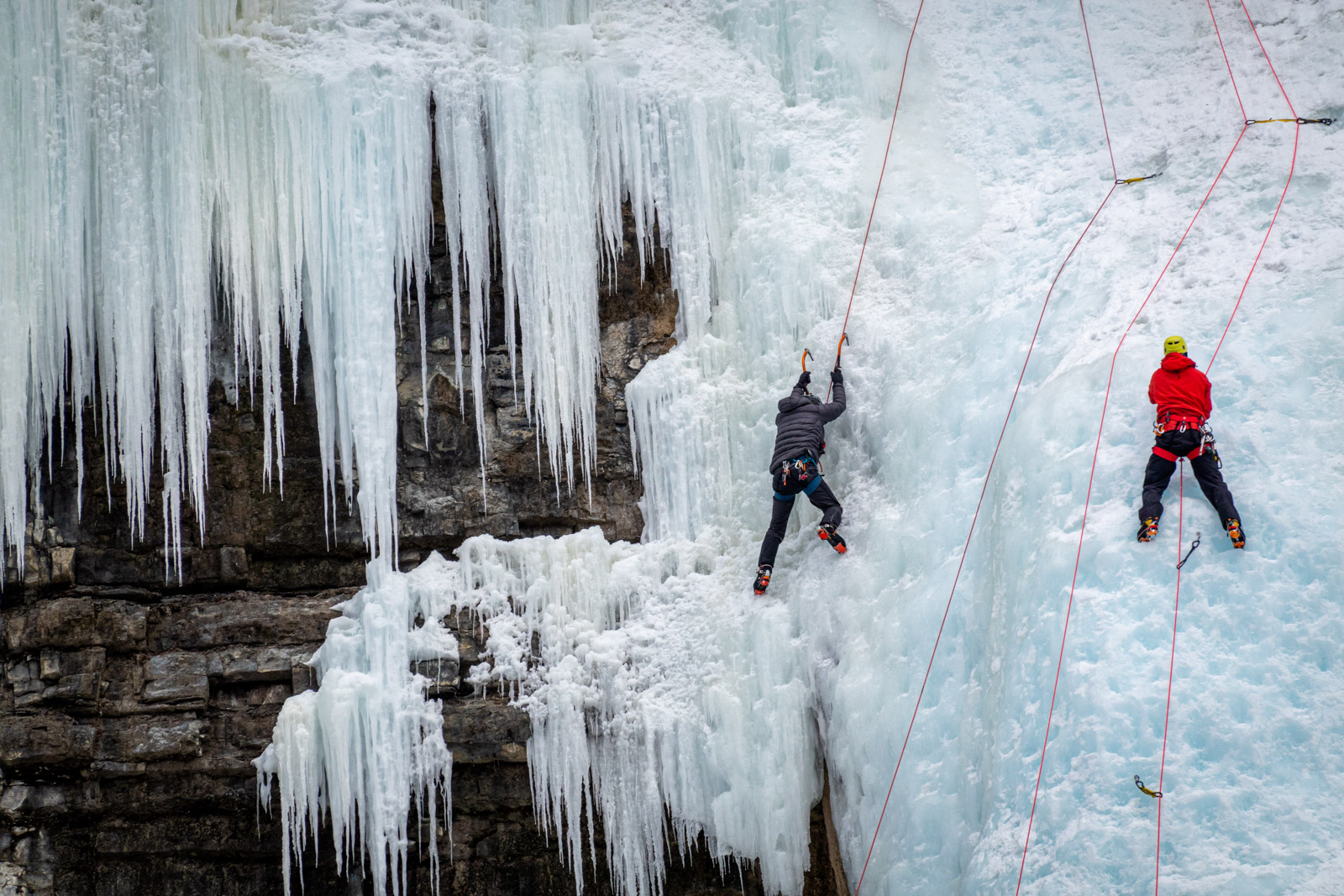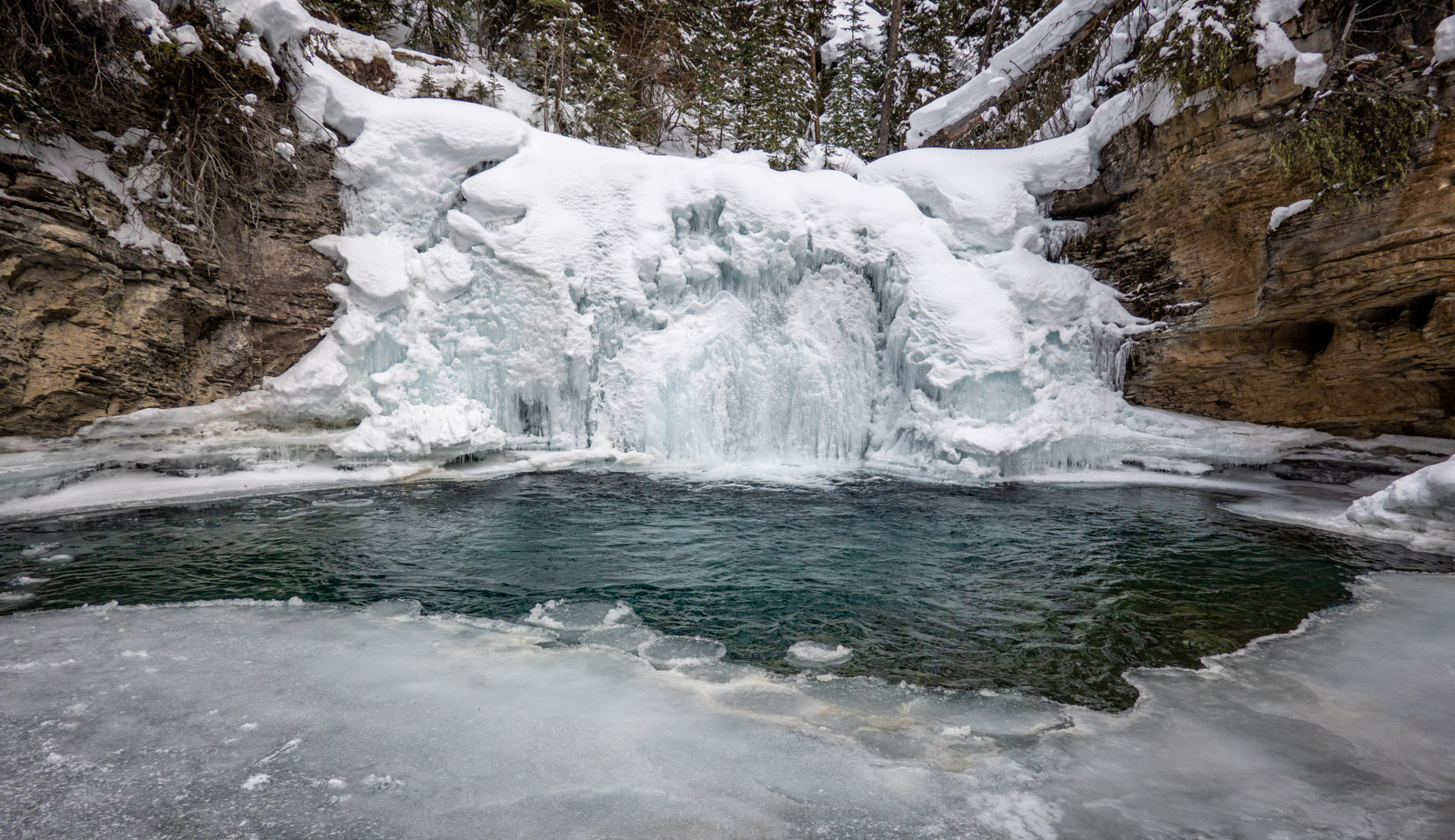 Johnston Canyon, carved steeply into the limestone bedrock by thousands of years of water erosion, is one of the most popular destinations in Banff National Park, and we decided to take a day off skiing to explore its beauty. We had to wear cleats on our boots in order to be able to walk along the icy trail. There were catwalks along the trail affixed to the limestone cliffs overhanging the creek to be able to go deeper into the Canyon, and we stopped at several viewing platforms to look at the cascading water. At the Upper Johnston Falls there is a platform overhanging the gorge and looks across to the top of the falls that drop a dramatic 40 meters, where we took several photos of the ice climbers on the ice wall. The trail is only a 3.1 mile round trip, and well worth the time and scenery to go the whole way to the Upper Falls. Click on thumbnail to view images