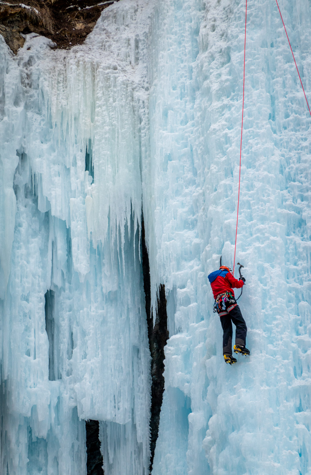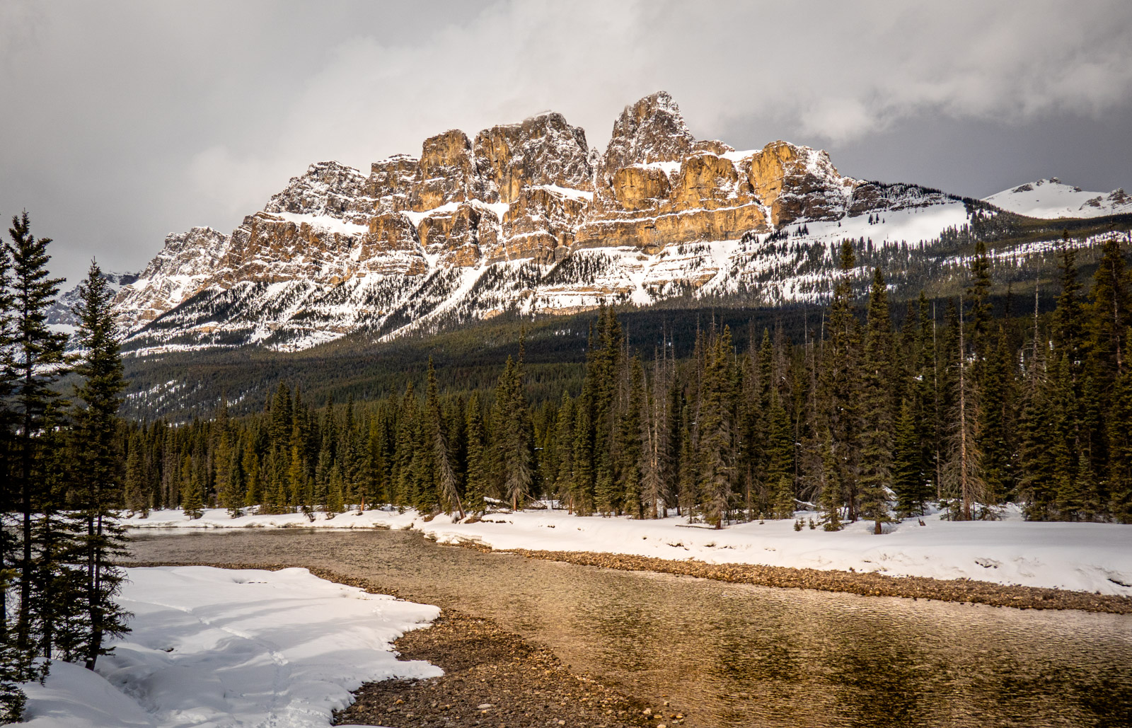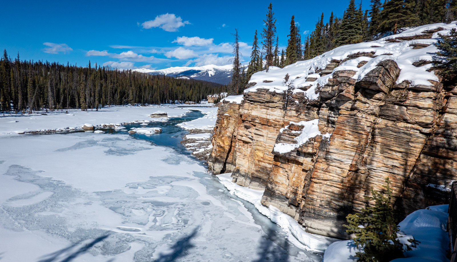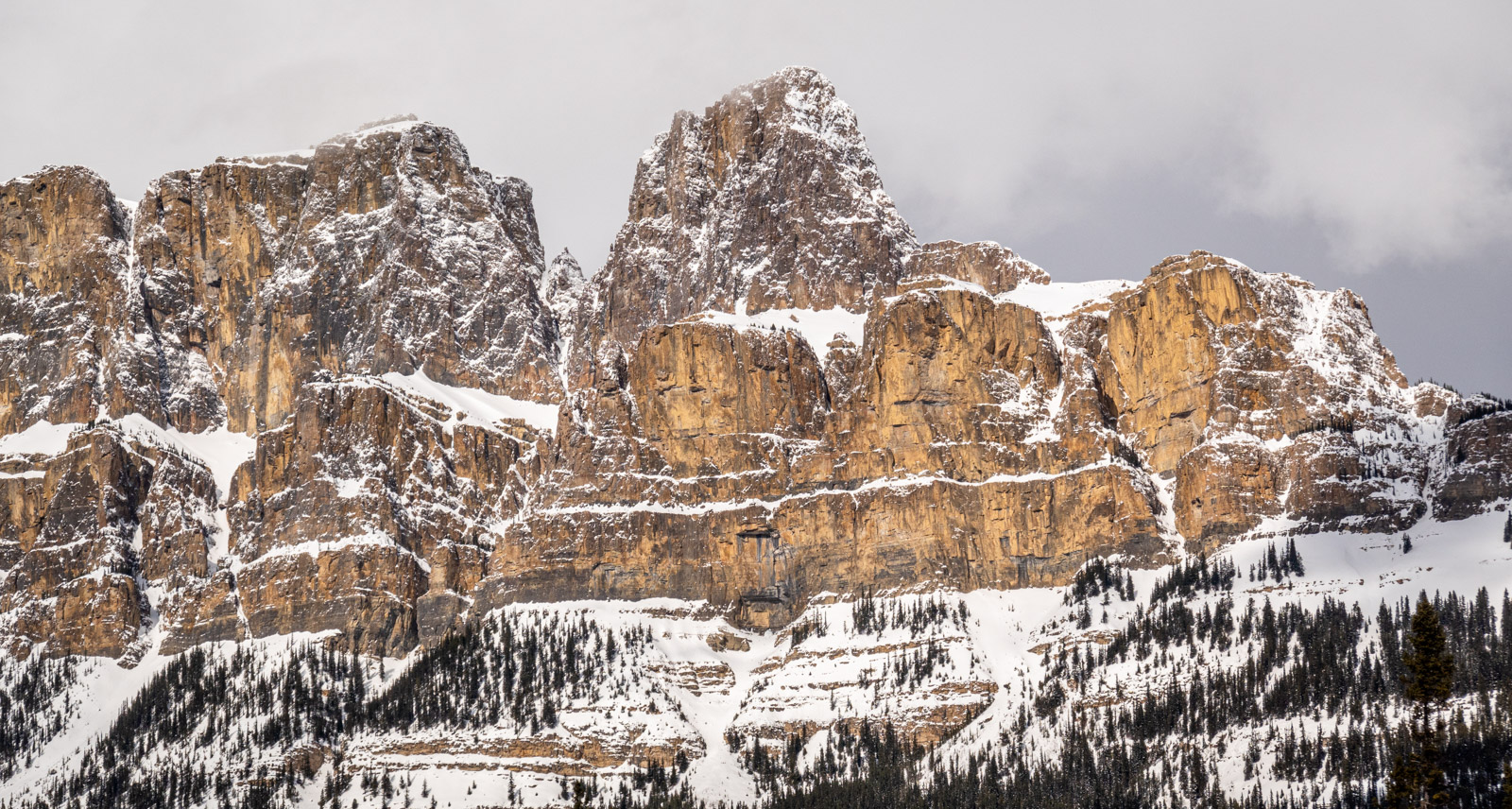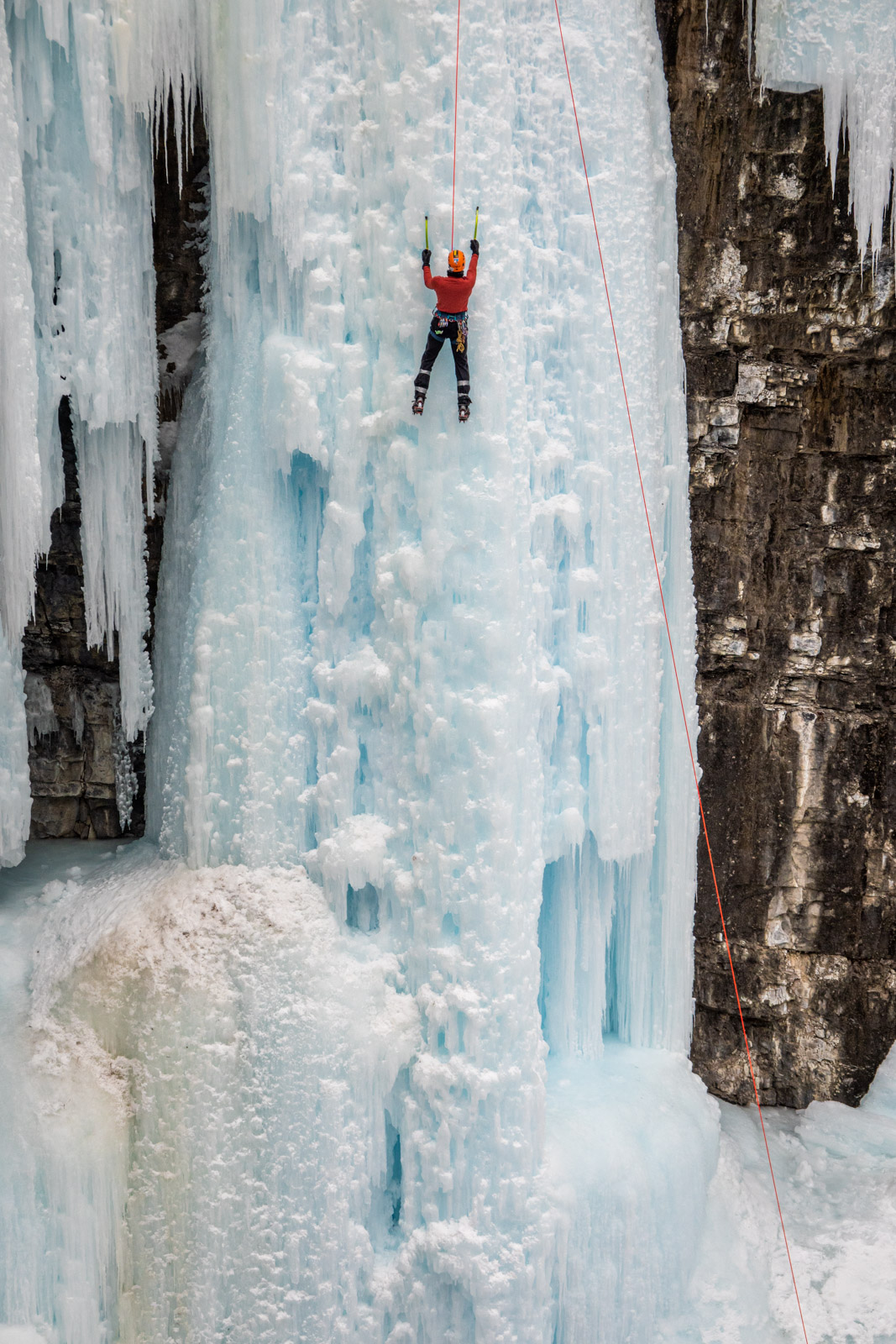 Johnston Canyon, carved steeply into the limestone bedrock by thousands of years of water erosion, is one of the most popular destinations in Banff National Park, and we decided to take a day off skiing to explore its beauty. We had to wear cleats on our boots in order to be able to walk along the icy trail. There were catwalks along the trail affixed to the limestone cliffs overhanging the creek to be able to go deeper into the Canyon, and we stopped at several viewing platforms to look at the cascading water. At the Upper Johnston Falls there is a platform overhanging the gorge and looks across to the top of the falls that drop a dramatic 40 meters, where we took several photos of the ice climbers on the ice wall. The trail is only a 3.1 mile round trip, and well worth the time and scenery to go the whole way to the Upper Falls. Click on thumbnail to view images