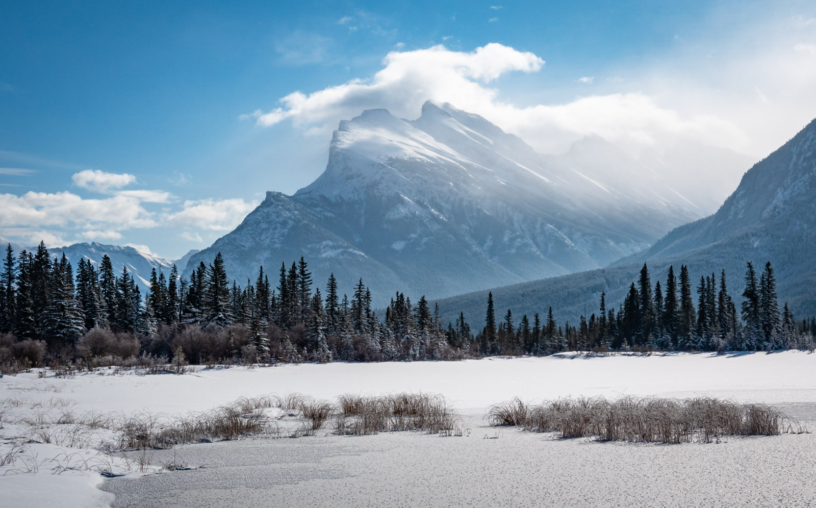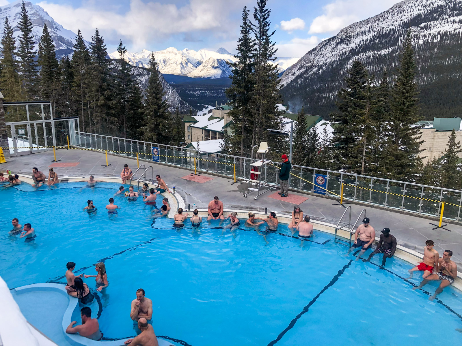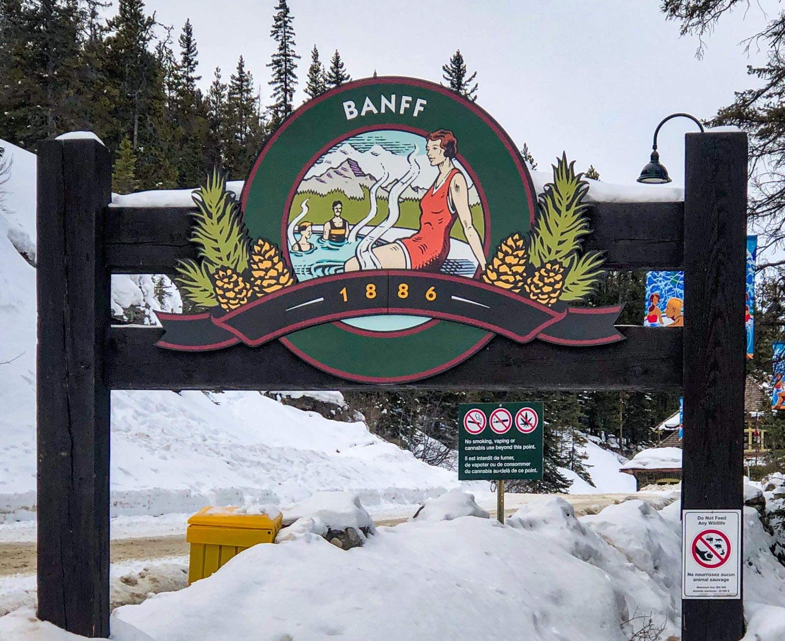 Karen, Bob and I went to visit the Banff Hot Springs, founded in 1883 by three rail workers who stumbled across hot water and steam flowing out of a cave on the lower slopes of what is now known as Sulphur Mountain. The water in the Banff Upper Hot Springs is heated geothermally, bubbling up to the surface from 1.8 miles into the earth’s crust. The natural temperature of the water that emerges at the Upper Hot Springs outlet varies depending on the season. In the winter, the temperature is as hot as 116 degree F., and it was magical to sit in the pools watching the snow fall on the surrounding peaks.