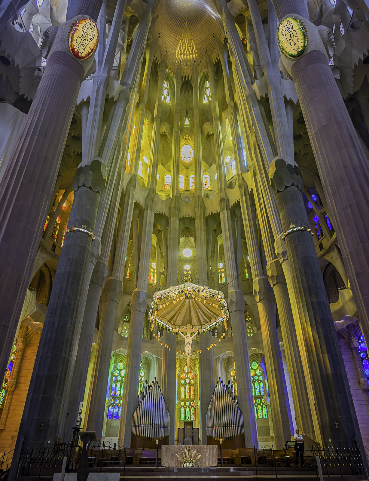 Inside, the basilica’s soaring columns branch like trees, supporting vaults shaped by geometric forms found in nature. Light pours through expansive stained-glass windows designed by artist Joan Vila-Grau, bathing the interior in shifting colors that change with the time of day. When complete, the Sagrada Família will feature 18 towers, including the central Jesus Tower, which will make it the tallest church in the world.