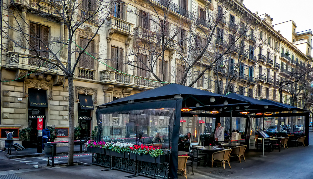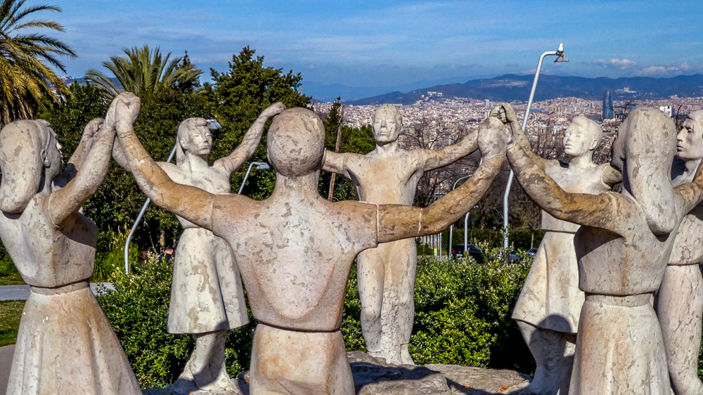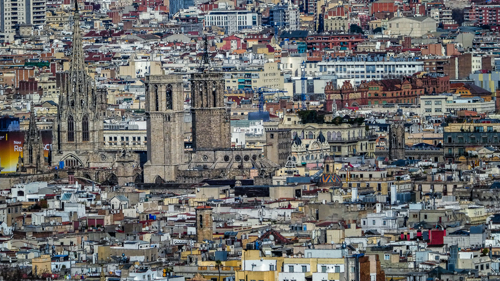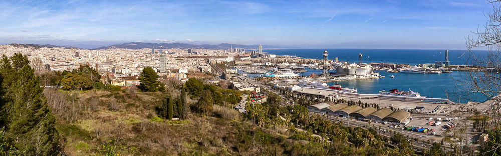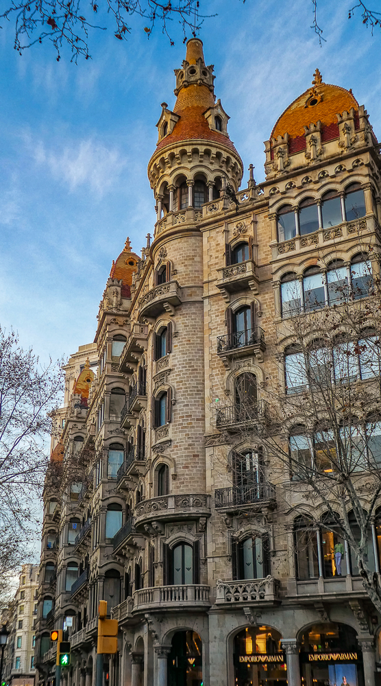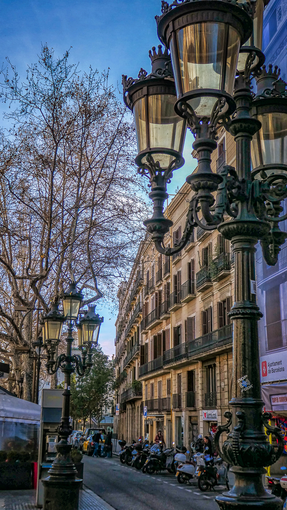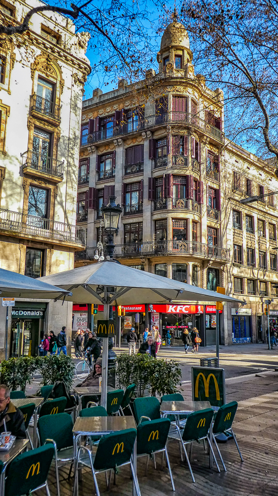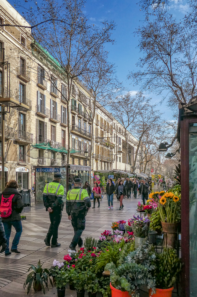 Our first visit to Barcelona, Spain, after our ski trip to Chamonix, France, was such an amazing cultural and architecturally mind-blowing experience. We stayed in a beautiful hotel in the center of the city with easy walking distance to all the sights. The first day we joined the ski group on a bus tour of Barcelona. After seeing the famous Sagrada Familia Basilica (described in a separate post) we drove up to the Parc de Montjuic for great views overlooking the city and the harbor. The park itself was nice to walk around as it offers a lovely green space in the heart of Barcelona. Then we walked the bustling central promenade, La Rambla, a tree-lined pedestrian mall for 1.2 kilometers. It is lined with cafes, shops, market, and breathtaking medieval architecture everywhere.