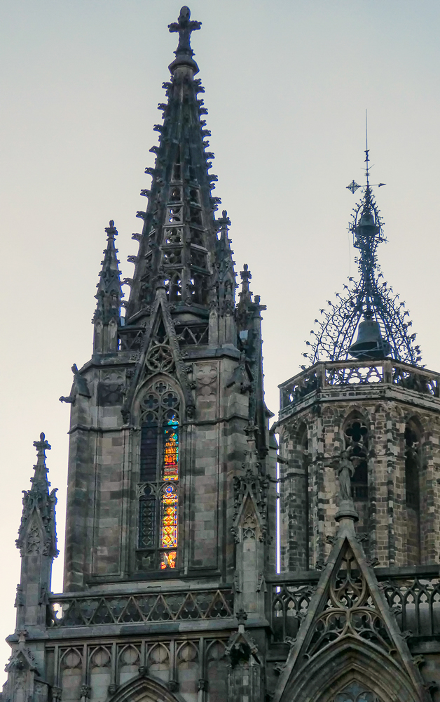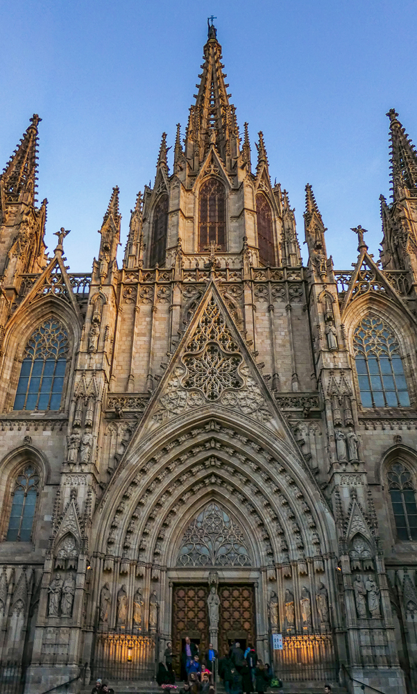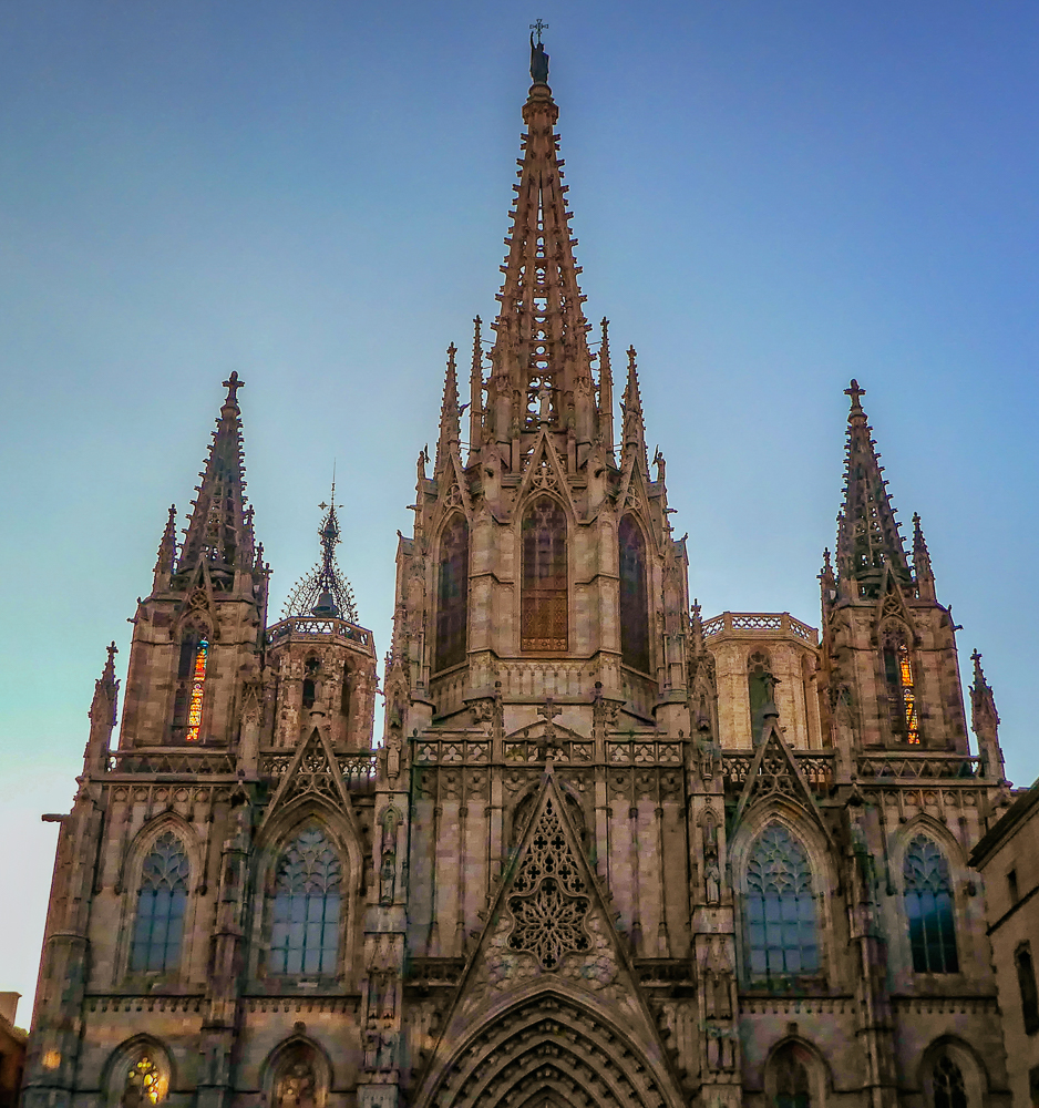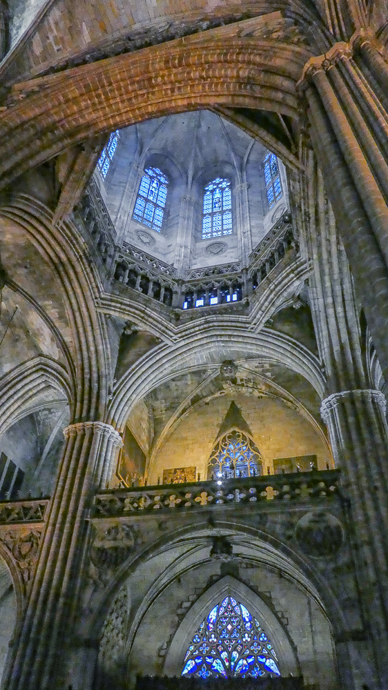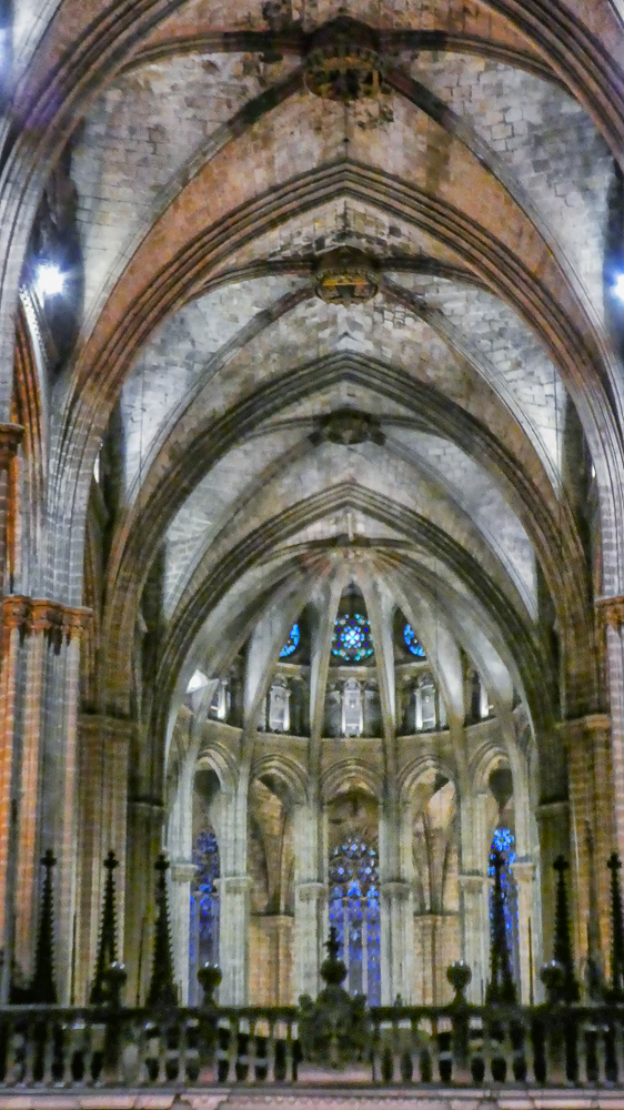 Today we walked the streets of Barcelona, enjoying the beautiful old architecture of the Gothic Quarter. We stopped at the Cathedral of Santa Eulalia, or Barcelona Cathedral, constructed from the 13th to the 15th centuries, it is the Gothic cathedral and seat of the Archbishop of Barcelona. The roof is notable for its gargoyles, featuring a wide range of animals. Inside the cathedral the high altar is raised allowing a clear view into the crypt. The cathedral is dedicated to Eulalia of Barcelona, who suffered martyrdom during the Roman times in the city.