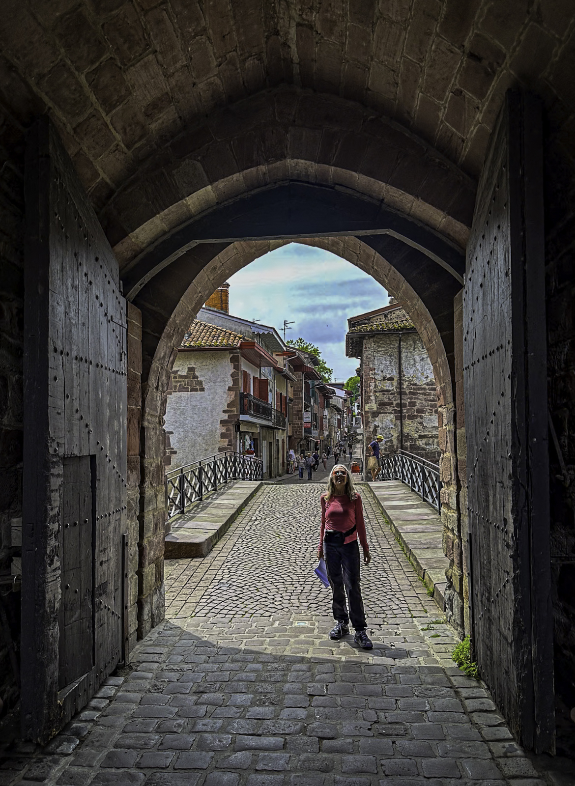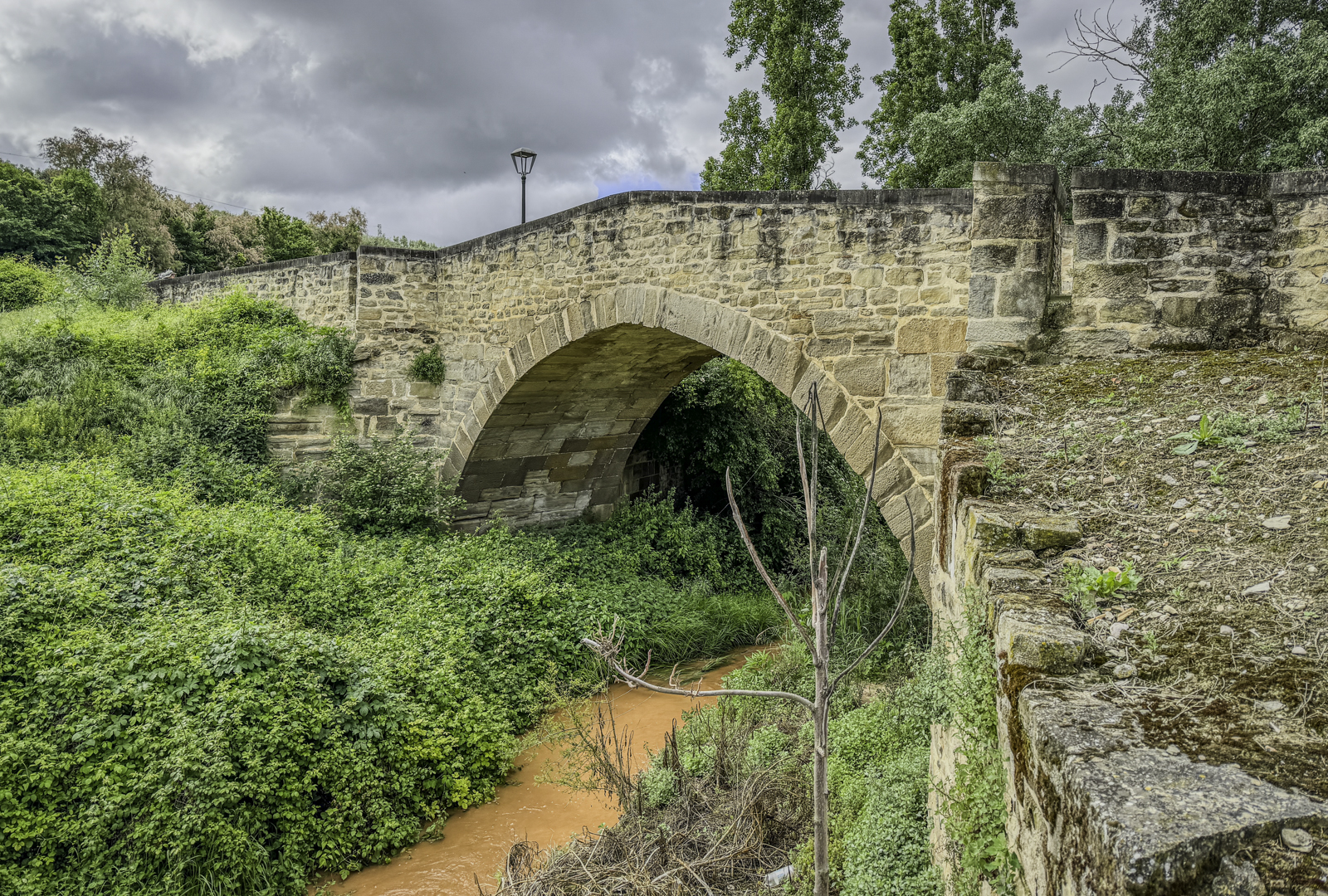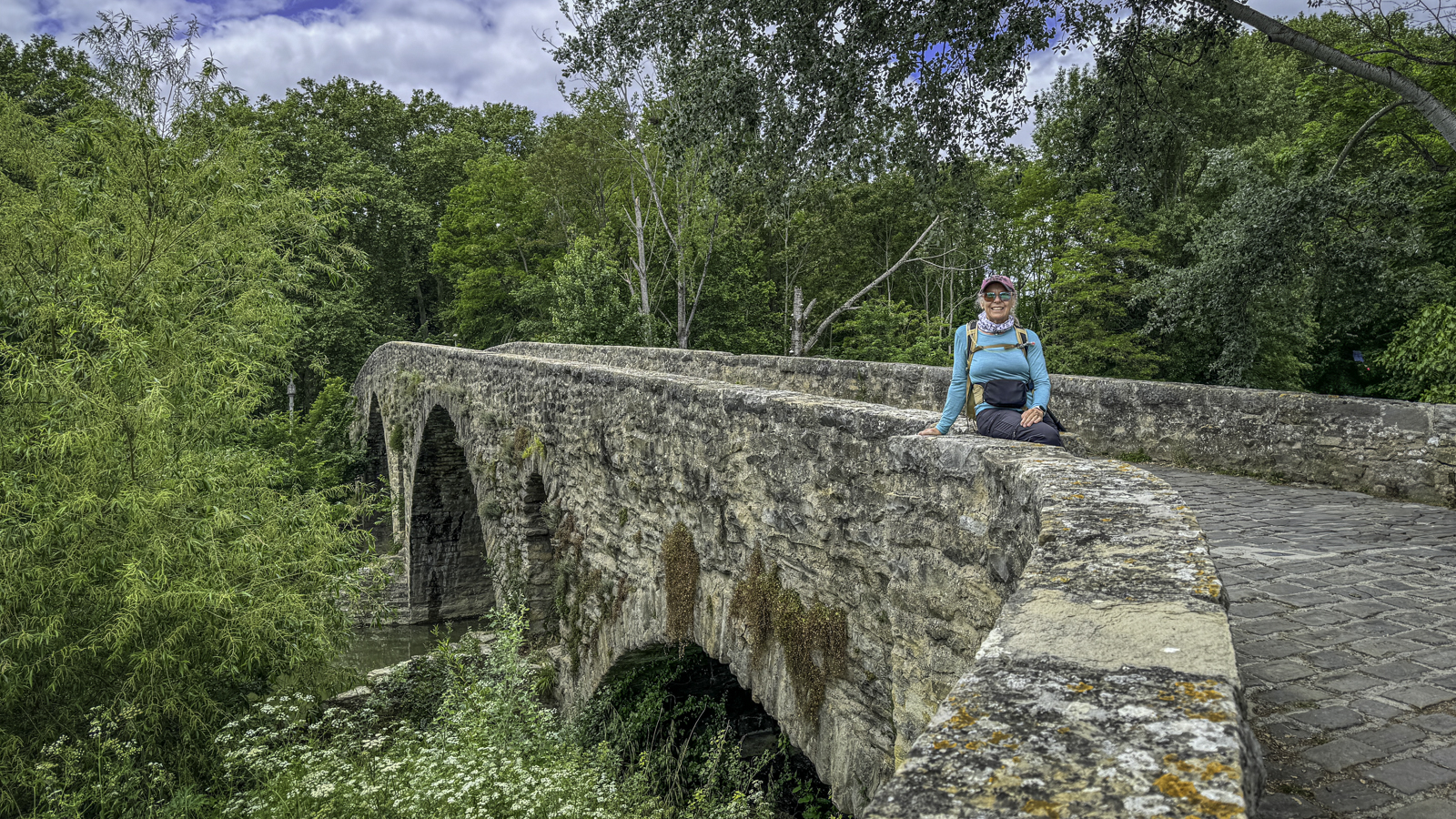 We continued on our way and came to the beautiful Puente de la Trinidad de Arre, 12th century, historic stone bridge located in Villava. This medieval bridge spans the Arga River and is a key entry point for pilgrims as they approach the city of Pamplona. We came to another historic, medieval bridge, Puente de Magdalena, that crosses the Arga river in a beautiful setting, the Parque de la Tejera, and is the last bridge we cross before reaching the city’s ancient fortifications. It’s Romanesque in style and dates from the 11th and 12th centuries, with five large, slightly pointed arches. After crossing Magdalena Bridge we reached the towering city walls and the Portal de Francia (Gate of France), with its fortress-like appearance, with thick walls and a towering archway that gives a grand sense of arrival. Above the portal, there are battlements and a shield featuring the coat of arms of Pamplona. Just in front of the Portal de Francia, is an old drawbridge, which spans a moat-like section that was once part of the city’s defense system. The drawbridge, now fixed in place, was once raised to protect the city from invaders.