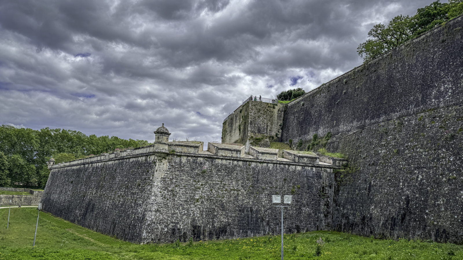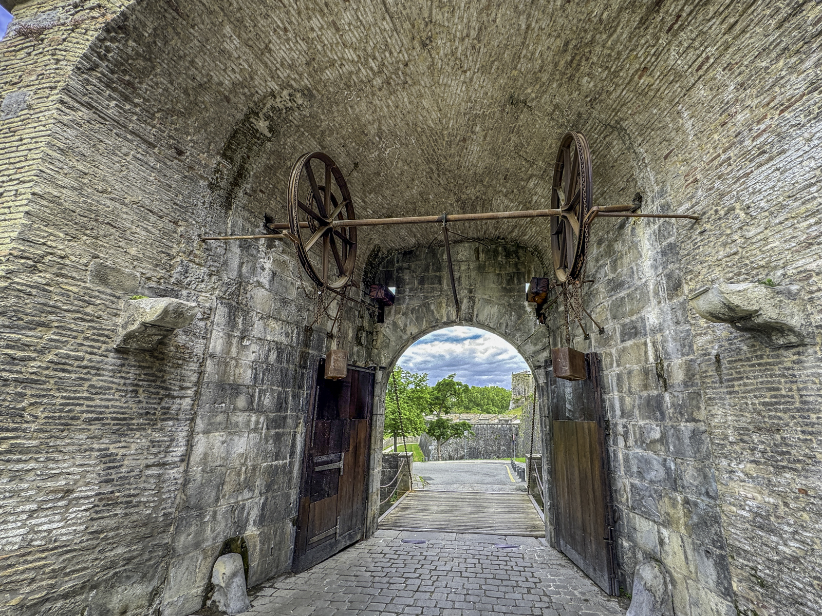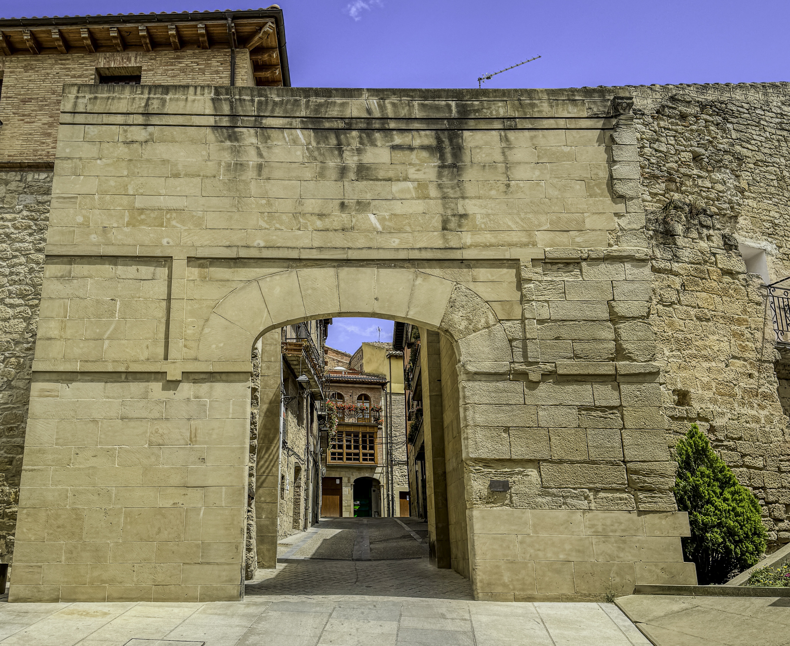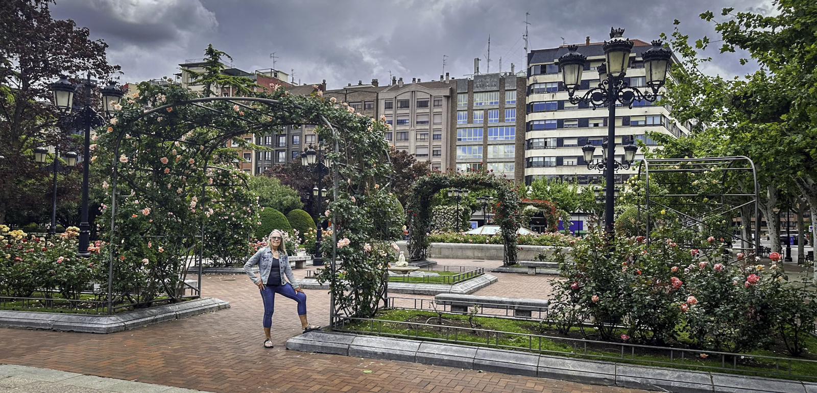 We continued on our way and came to the beautiful Puente de la Trinidad de Arre, 12th century, historic stone bridge located in Villava. This medieval bridge spans the Arga River and is a key entry point for pilgrims as they approach the city of Pamplona. We came to another historic, medieval bridge, Puente de Magdalena, that crosses the Arga river in a beautiful setting, the Parque de la Tejera, and is the last bridge we cross before reaching the city’s ancient fortifications. It’s Romanesque in style and dates from the 11th and 12th centuries, with five large, slightly pointed arches. After crossing Magdalena Bridge we reached the towering city walls and the Portal de Francia (Gate of France), with its fortress-like appearance, with thick walls and a towering archway that gives a grand sense of arrival. Above the portal, there are battlements and a shield featuring the coat of arms of Pamplona. Just in front of the Portal de Francia, is an old drawbridge, which spans a moat-like section that was once part of the city’s defense system. The drawbridge, now fixed in place, was once raised to protect the city from invaders.