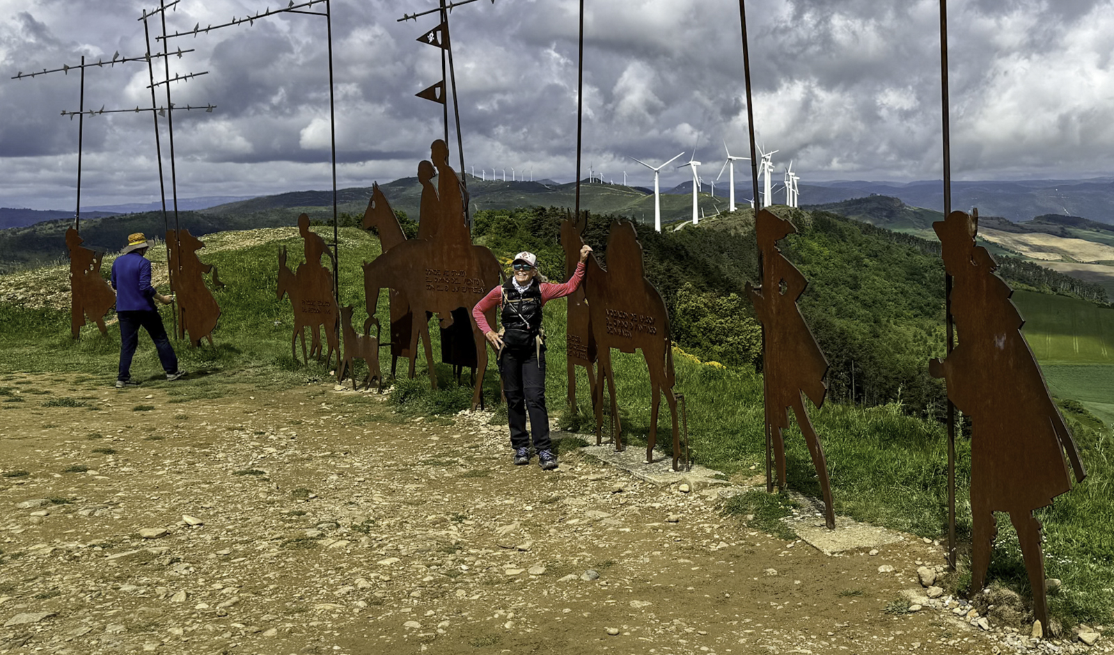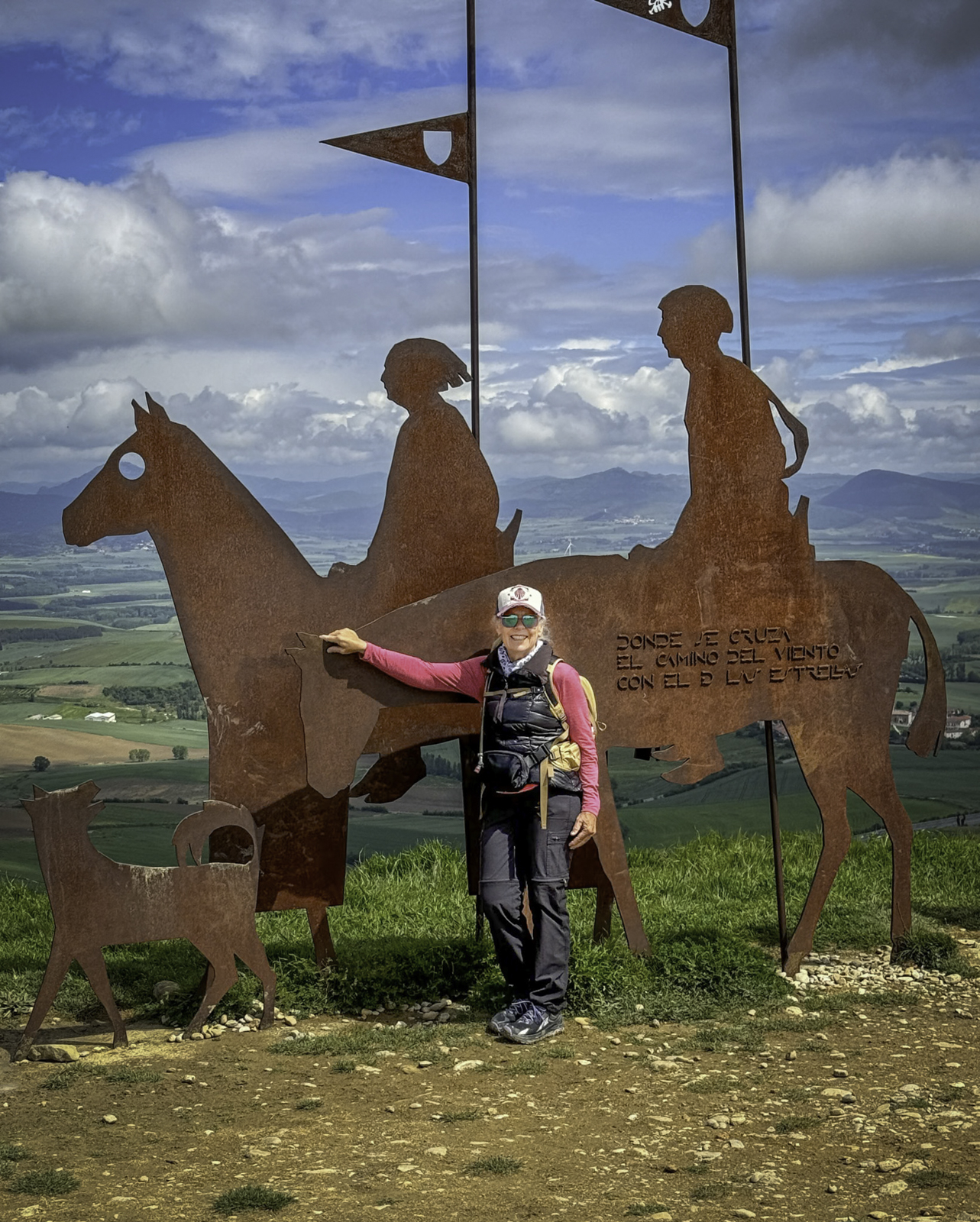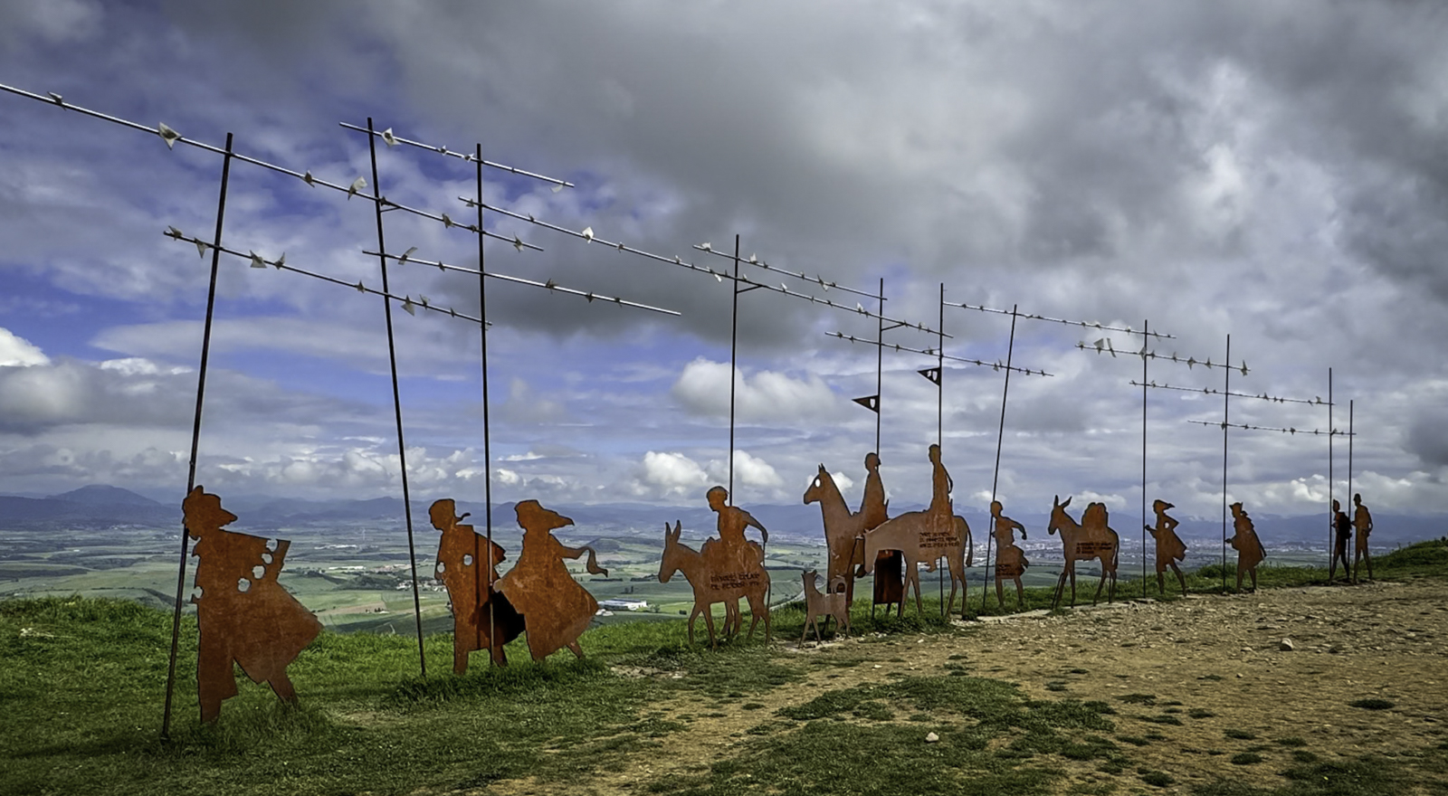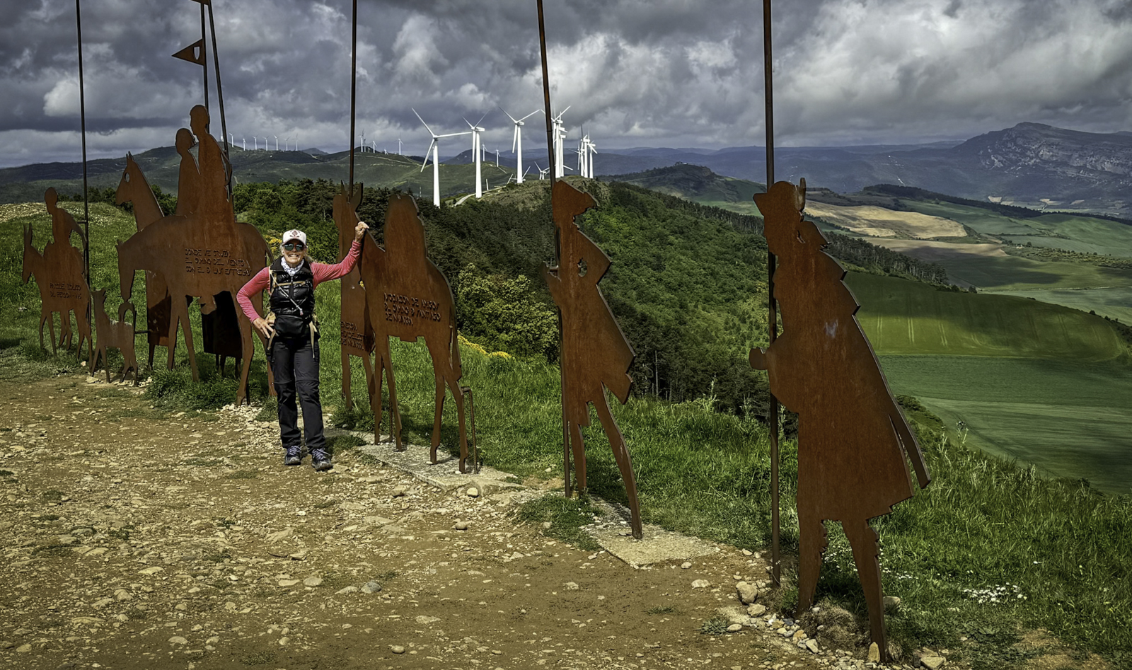 Today I started walking at 7:30 am, alone, but soon met a couple from Vancouver, WA, Michelle and Dennis; we walked the first 5 km mostly via city pavements and suburban roads together. Then the pathway became a gradual incline until the ascent to Alto del Perdon, which can be challenging, but reaching the summit is rewarding. The iron sculptures on Alto del Perdon (Mount of Forgiveness) are one of the most iconic and symbolic landmarks along the Camino de Santiago Frances, and the vistas looking back towards Pamplona and the surrounding countryside are well-worth the climb. Created by artist Vincente Galbete in 1996, the sculptures depict a group of pilgrims from different eras walking along the Camino. The figures, made from rusted iron, include both men and women, some on foot and others on horseback, representing the long history of pilgrimage along this ancient route. Each figure carries a distinctive style of clothing or gear, reflecting the various periods in history during which people have made this journey. A well-known inscription at the site, written on one of the horses, reads: “Donde se cruza el camino del viento con el de las estrellas”, which translates to “Where the path of the wind crosses that of the stars,” referring to the open, windy ridge where the sculptures stand and the Camino’s connection to the Milky Way, which historically helped guide pilgrims. The site also marks a symbolic point, as it is said that here, pilgrims are “forgiven” for their sins before continuing their journey. After a nice long break here with Maggie and Gordon, we continued down the hill together.
