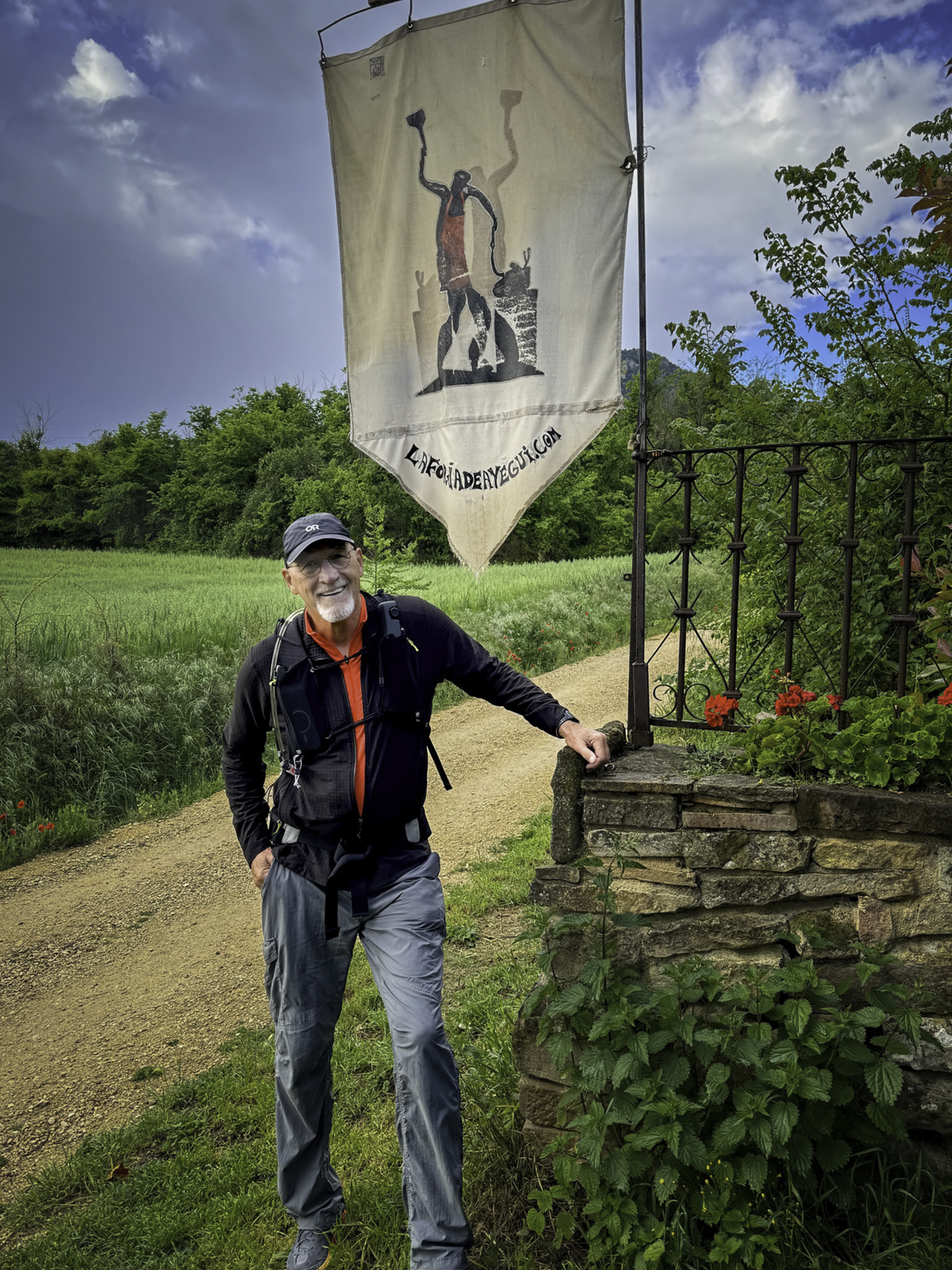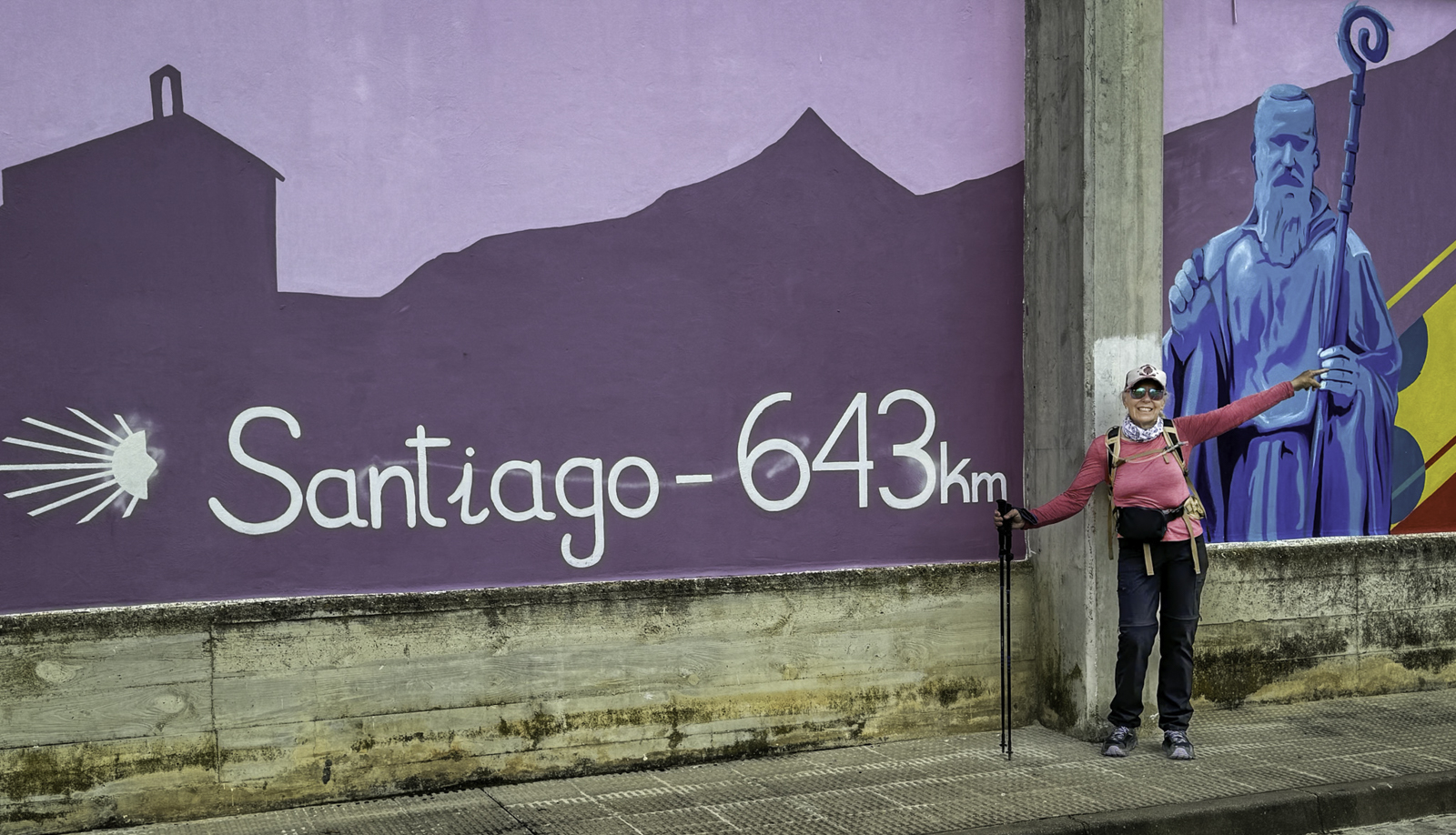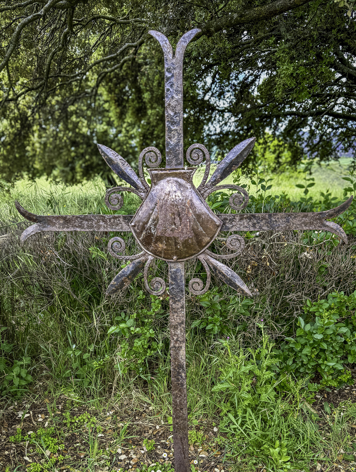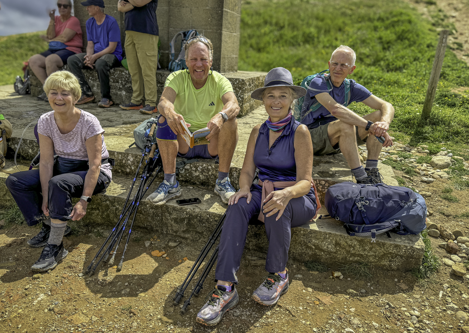 Today I started walking at 7:30 am, alone, but soon met a couple from Vancouver, WA, Michelle and Dennis; we walked the first 5 km mostly via city pavements and suburban roads together. Then the pathway became a gradual incline until the ascent to Alto del Perdon, which can be challenging, but reaching the summit is rewarding. The iron sculptures on Alto del Perdon (Mount of Forgiveness) are one of the most iconic and symbolic landmarks along the Camino de Santiago Frances, and the vistas looking back towards Pamplona and the surrounding countryside are well-worth the climb. Created by artist Vincente Galbete in 1996, the sculptures depict a group of pilgrims from different eras walking along the Camino. The figures, made from rusted iron, include both men and women, some on foot and others on horseback, representing the long history of pilgrimage along this ancient route. Each figure carries a distinctive style of clothing or gear, reflecting the various periods in history during which people have made this journey. A well-known inscription at the site, written on one of the horses, reads: “Donde se cruza el camino del viento con el de las estrellas”, which translates to “Where the path of the wind crosses that of the stars,” referring to the open, windy ridge where the sculptures stand and the Camino’s connection to the Milky Way, which historically helped guide pilgrims. The site also marks a symbolic point, as it is said that here, pilgrims are “forgiven” for their sins before continuing their journey. After a nice long break here with Maggie and Gordon, we continued down the hill together.