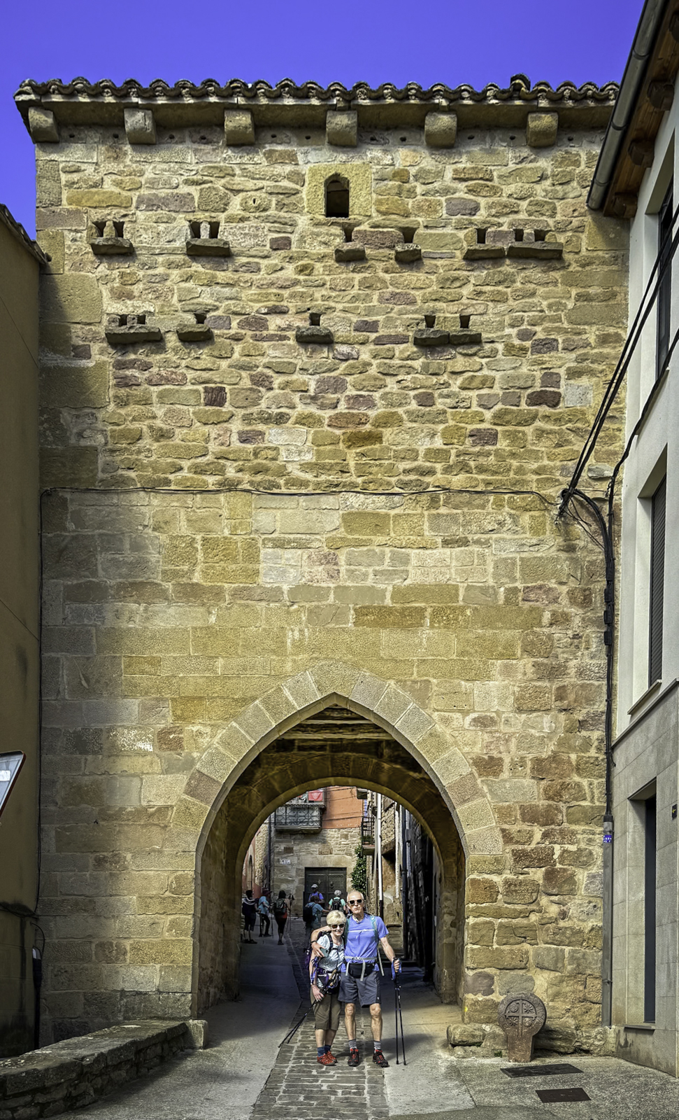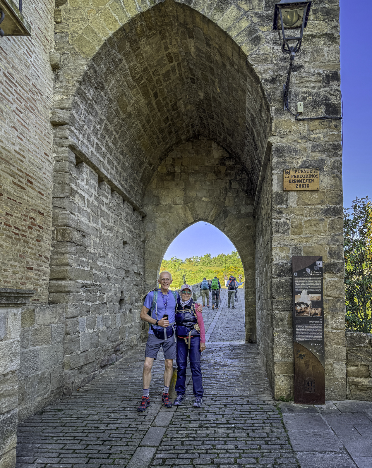 We left Zubiri to walk the 6 km to our destination for the night, however, Bob was feeling really tired and it took us a very long time. Fortunately, we met Maggie and Gordon White from Scotland along the Way and became instant friends when Maggie said to Bob, “You look like you are dying”! We stayed together at the Hotel Akerreta. This 300 year old beautiful caserio (typical Basque residence), built in 1723, the stone-wall house still conserves its original Pyrenees-style kitchen and its bread oven. The enormous oak wood beams, webbed to create the structure of the house, reveal the historical power of the homestead. A perfect location to enjoy the best of Navarre’s scenery from our room and right on the Camino de Santiago. The Hotel Akerreta is the hotel in the movie “The Way” where the famous actor Martin Sheen meets the American lady in her travel. After a long hot bath and a rest we went for dinner at 8 pm with Maggie and Gordon, whom we became good friends with for life. We enjoyed another Pilgrim meal of cod stew, salad, dessert and of course wine for $27 euros. Click on thumbnail to view images