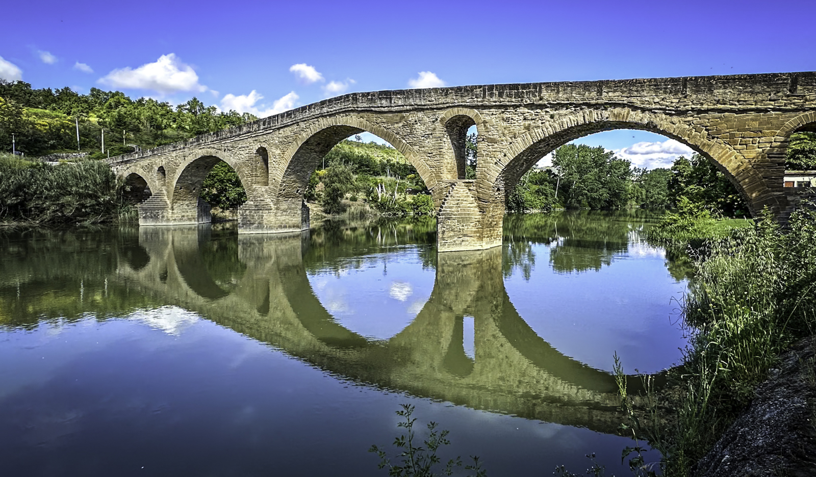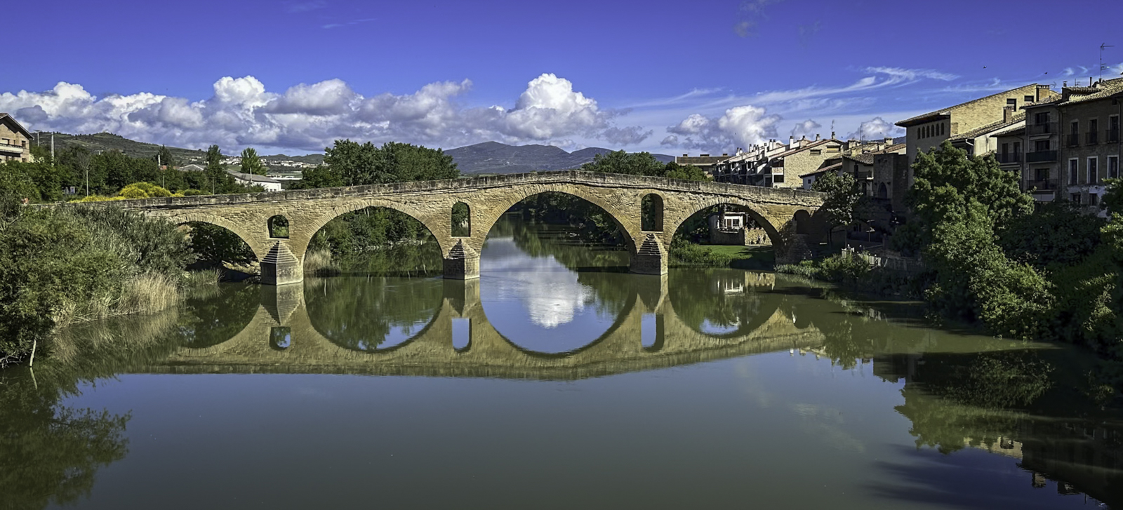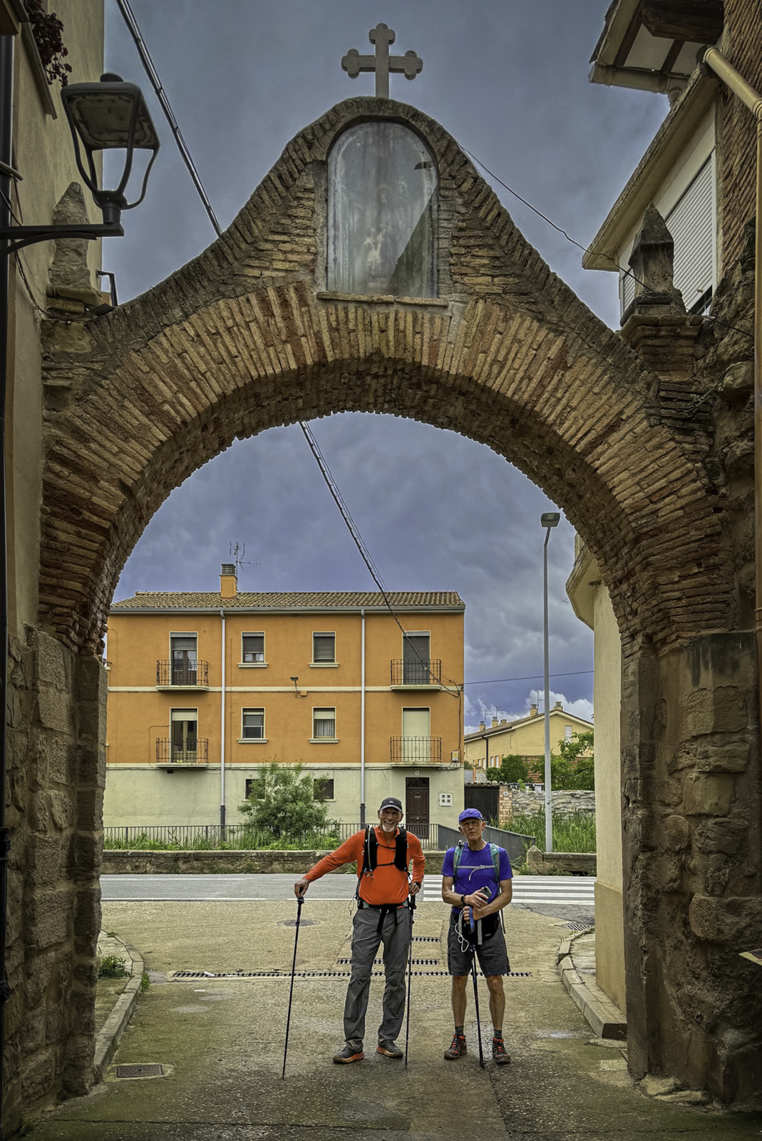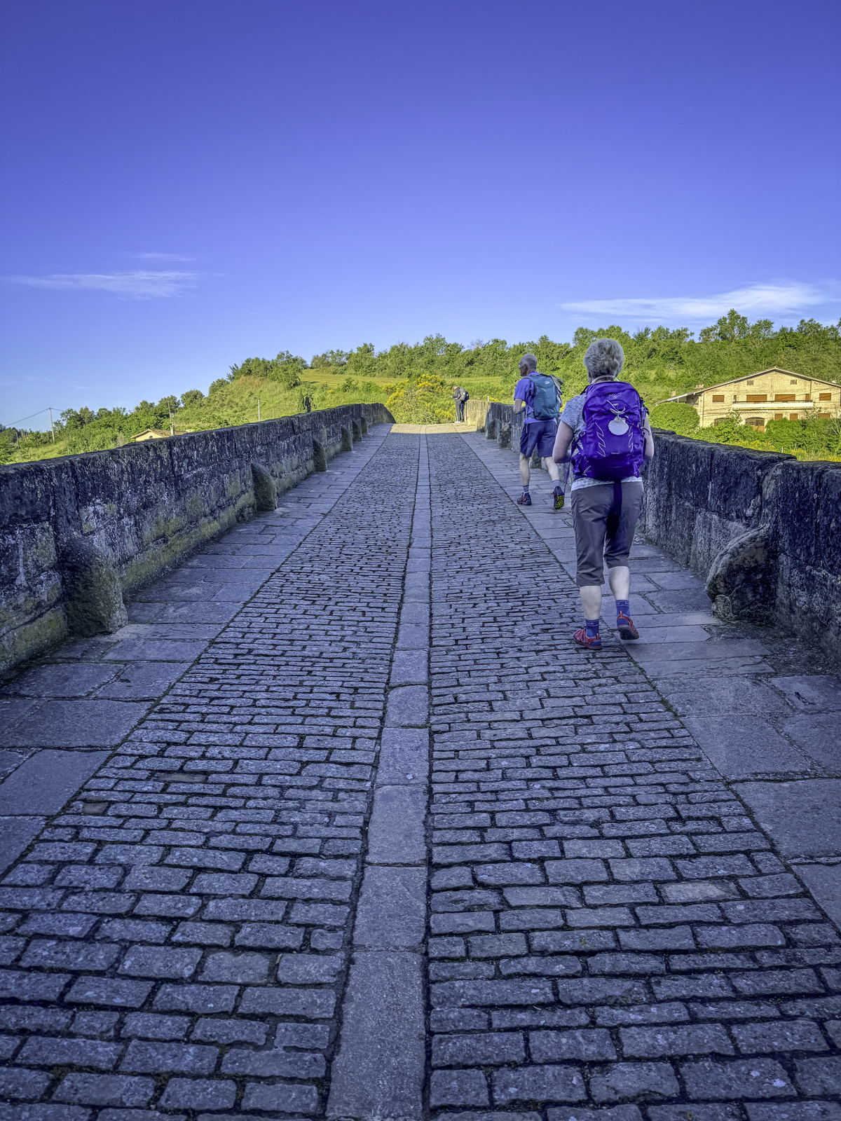 Leaving the Jakue Hotel with Maggie and Gordon we pass under the connecting arch of Iglesia del Crucifijo and Padres Reparadores, and past the beautiful 12th century Iglesia de Santiago. Then we crossed the famous XIIthC “Queen’s Bridge”, Puente la Reina, one of the most beautiful and historically significant bridges on the Camino, connecting pilgrims traveling from both the French and Aragonese routes. The bridge spans the Arga River with six graceful arches, each varying slightly in size, giving it a distinctive, uneven yet elegant profile. Its construction is Romanesque, with large, well-cut stone blocks forming the arches and piers, which have withstood centuries of use by pilgrims, merchants and locals. The view from the bridge is picturesque, with the reflections in the calm river below and the charming medieval town on either side.