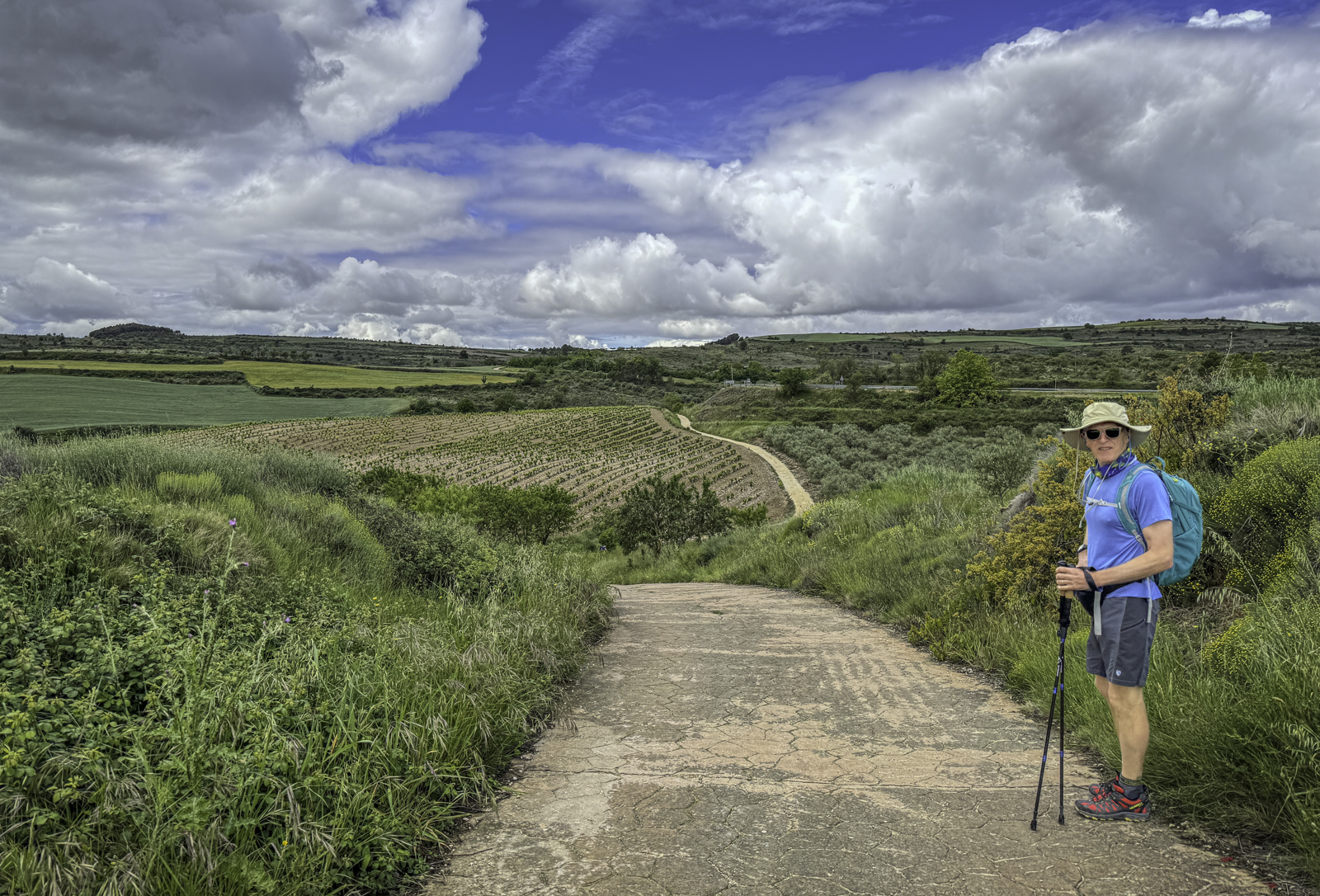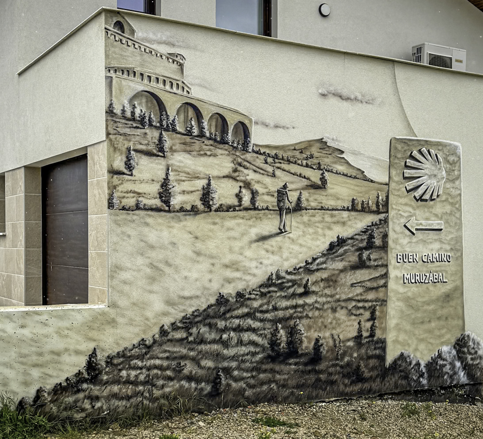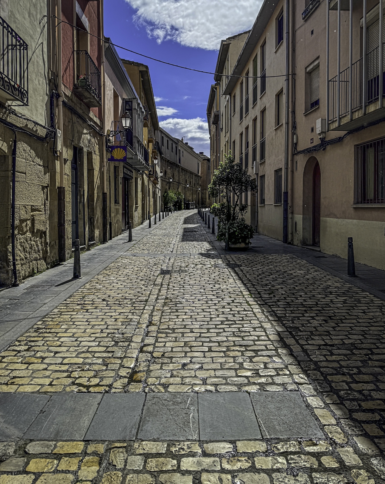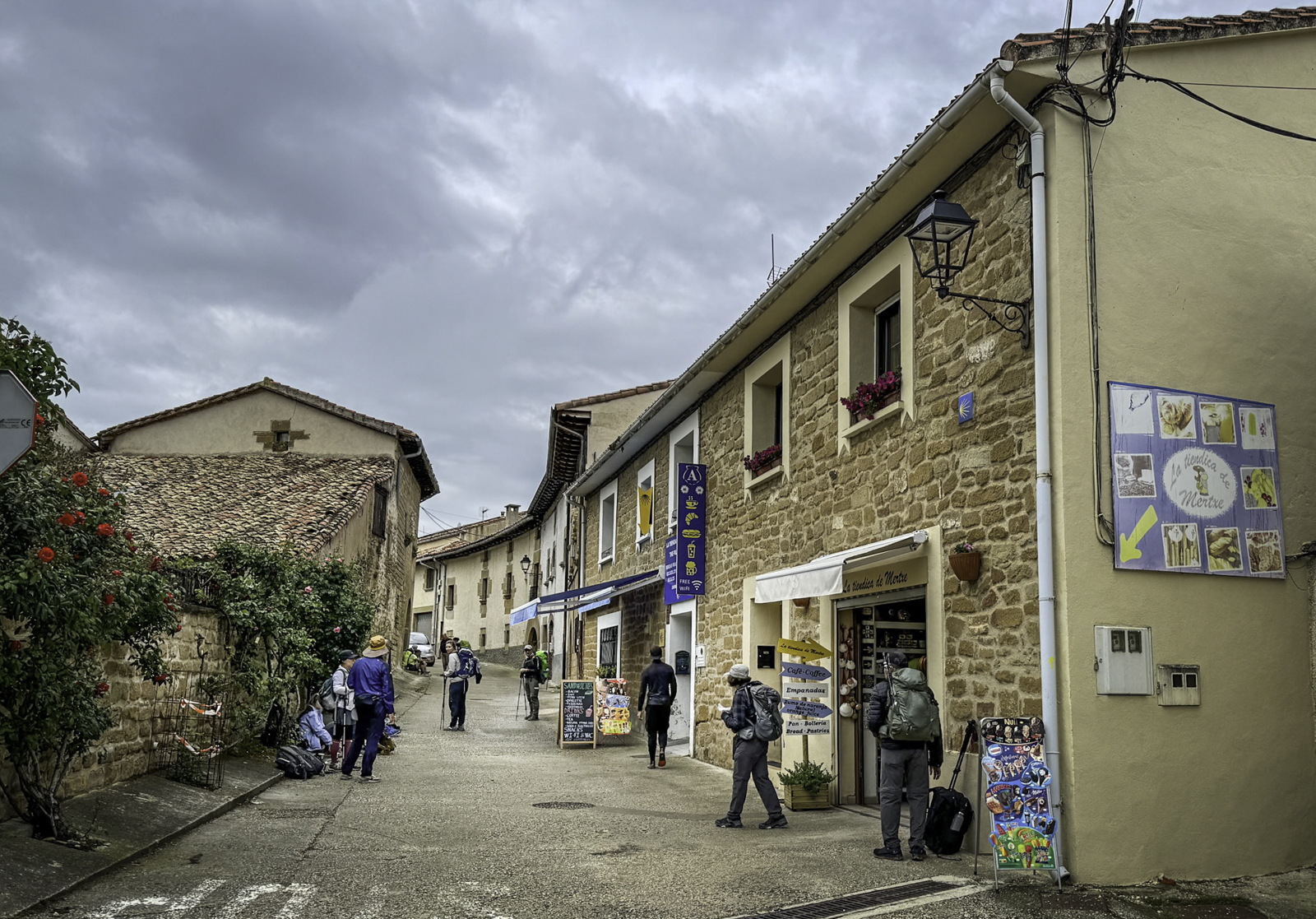 Todays route is along gently rolling farmland and vineyards with few trees and little shade, passing fields of barley and the red sea of poppies lining the path. We arrived at Cirauqui, a medieval hilltop village beautifully preserved with narrow winding streets and houses bearing armorial crests and ornate balconies. We stopped here for a tea/coffee break while enjoying this historical setting. Leaving the village we passed through an arch off the main square and out to one of the best examples of a Roman road on the Camino continuing over a single span Roman bridge. The road, though weathered, still shows the original stonework and features such as embedded grooves from Roman carts, offering a glimpse into the ancient world. This section of the Camino Frances is one of the few places where pilgrims walk on an authentic Roman road, giving it a special historical significance. Walking through this village and Roman road, you can’t help but feel the layers of history, from Roman times to the medieval period, blending into the present. The experience of traversing Cirauqui’s Roman road, surrounded by narrow streets and old stone buildings, is a highlight for pilgrims, connecting them directly to the past.