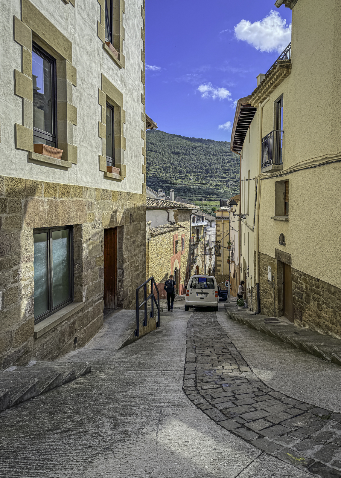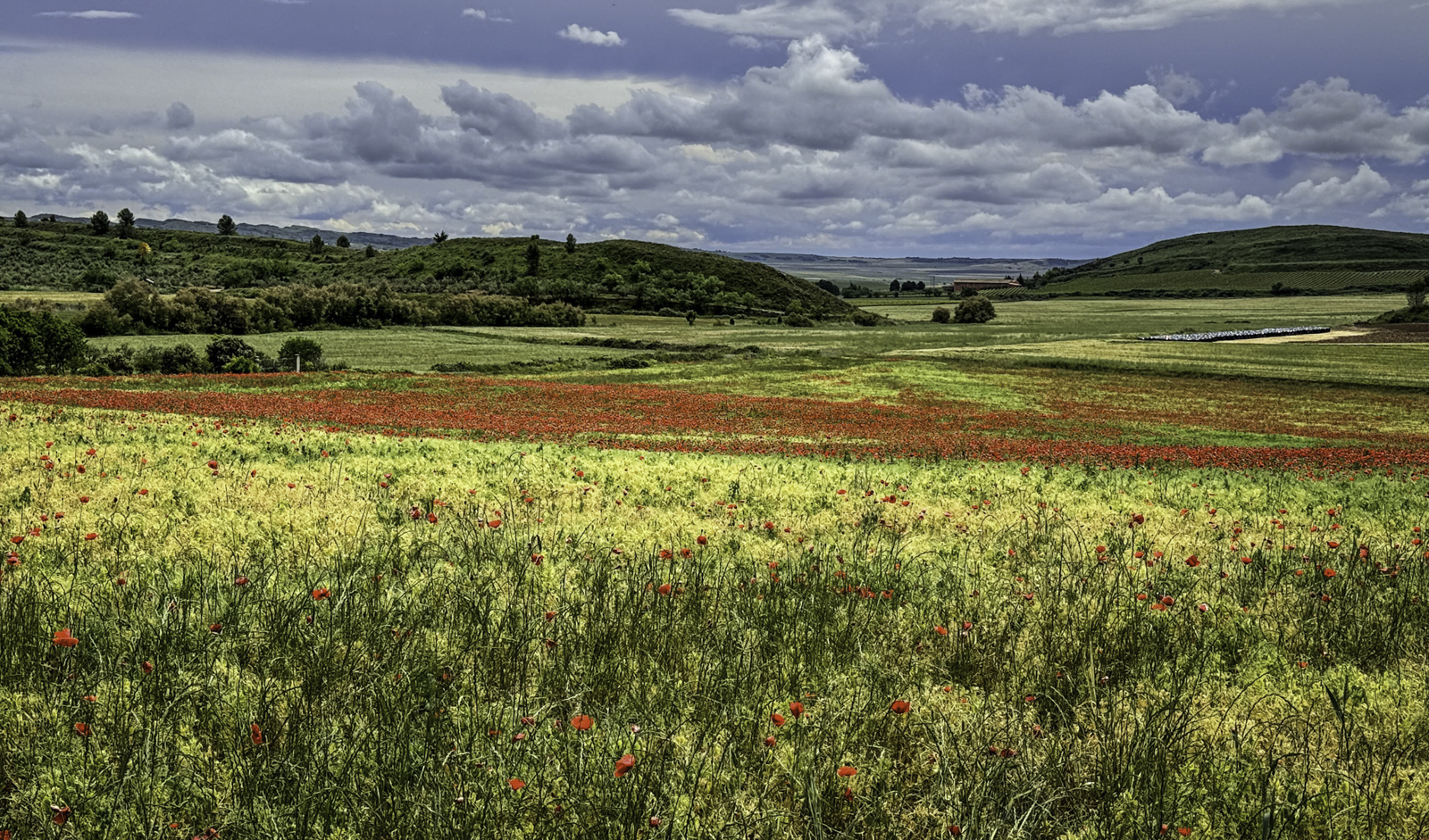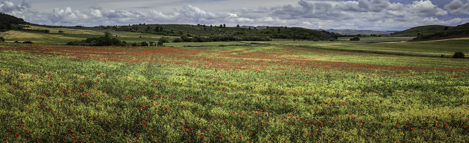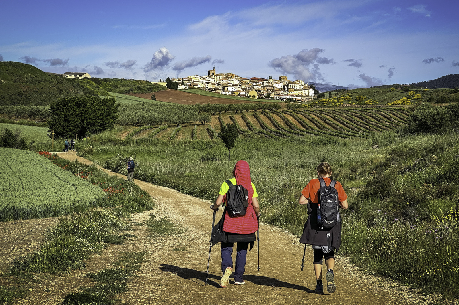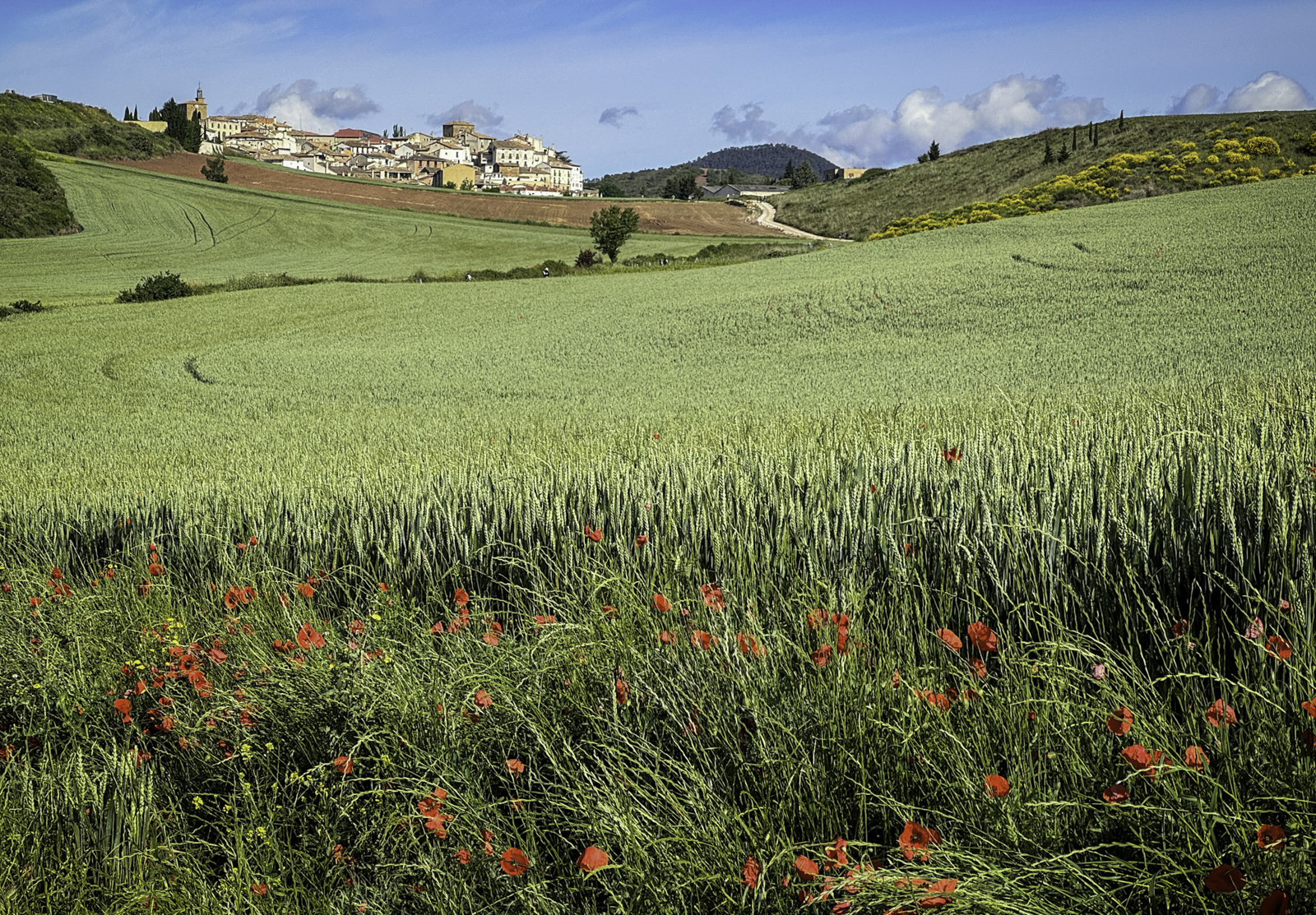 Todays route is along gently rolling farmland and vineyards with few trees and little shade, passing fields of barley and the red sea of poppies lining the path. We arrived at Cirauqui, a medieval hilltop village beautifully preserved with narrow winding streets and houses bearing armorial crests and ornate balconies. We stopped here for a tea/coffee break while enjoying this historical setting. Leaving the village we passed through an arch off the main square and out to one of the best examples of a Roman road on the Camino continuing over a single span Roman bridge. The road, though weathered, still shows the original stonework and features such as embedded grooves from Roman carts, offering a glimpse into the ancient world. This section of the Camino Frances is one of the few places where pilgrims walk on an authentic Roman road, giving it a special historical significance. Walking through this village and Roman road, you can’t help but feel the layers of history, from Roman times to the medieval period, blending into the present. The experience of traversing Cirauqui’s Roman road, surrounded by narrow streets and old stone buildings, is a highlight for pilgrims, connecting them directly to the past.