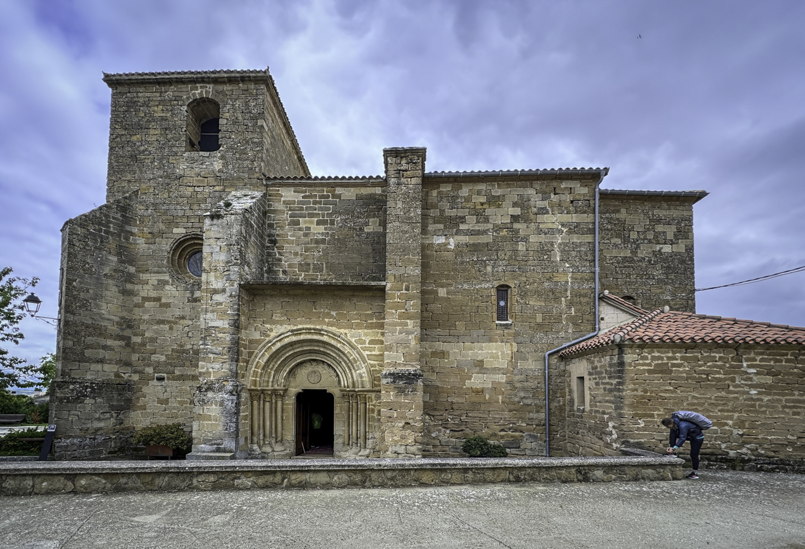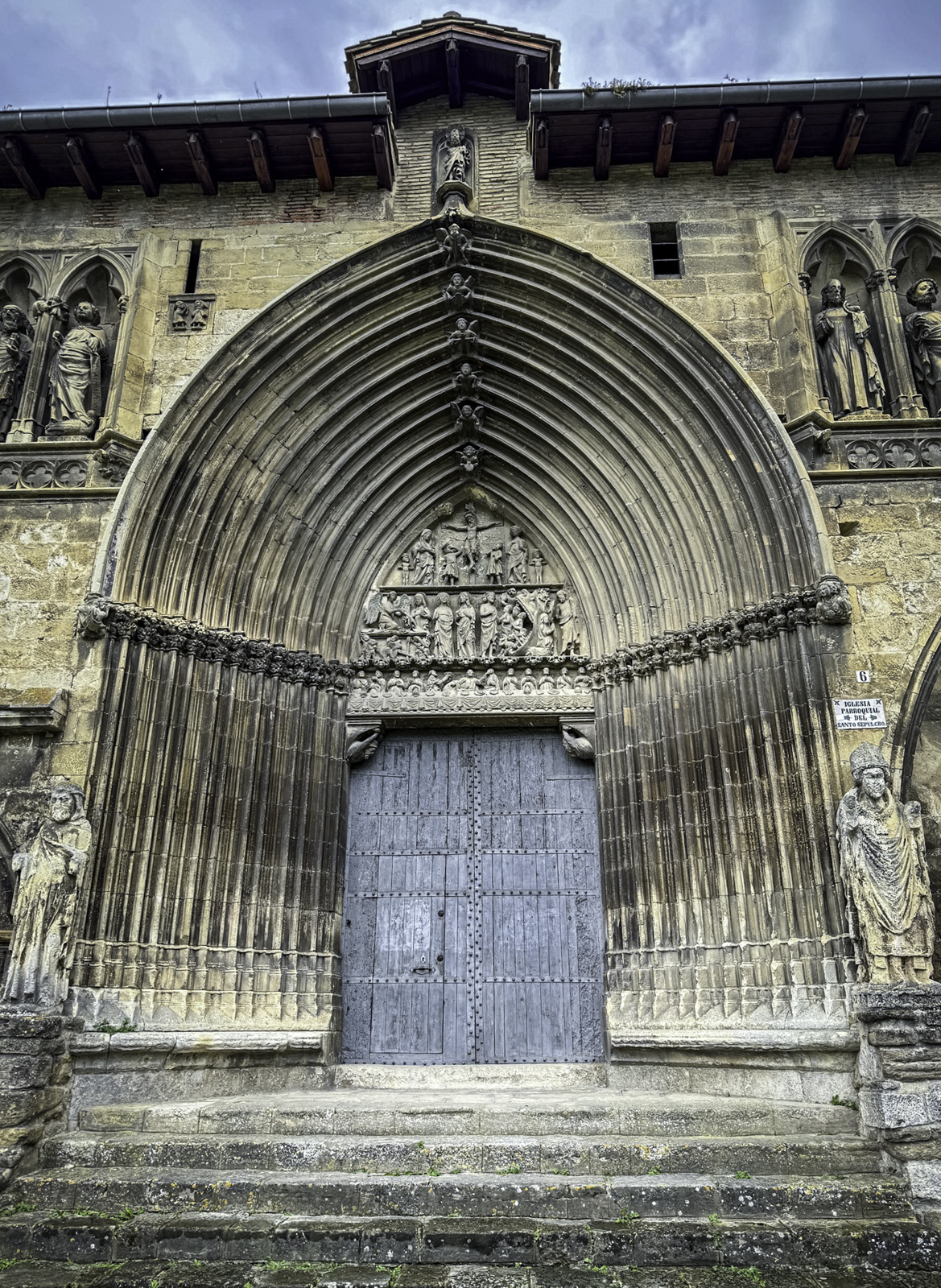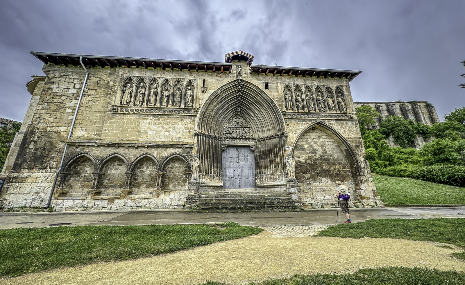 We stopped for lunch in the quaint village of Lorca and enjoyed a fabulous bowl of lentil soup. Arriving in Estella, our destination, we passed by the Church of the Holy Sepulchre, one of the oldest parish churches in the village. Iglesia del Santo Sepulcro is a striking example of Gothic architecture, the church dates back to the 12th and 13th centuries. The most remarkable part of the church is its elaborately sculpted Gothic facade, that features a series of beautifully detailed carvings, depicting biblical scenes such as the Last Judgement and various saints. The figures are life-like and dynamic, showcasing the craftsmanship of the time. We could not go inside the church as it is no longer in use for regular worship. We continued to our destination for the night, the town of Estella, known as Estella-Lizarra in Basque, a historic and vibrant town, founded in 1090 by King Sancho Ramirez of Navarre to serve the growing number of pilgrims traveling to Santiago de Compostela. The town’s layout is picturesque, with cobblestone streets, medieval bridges, and well-preserved buildings that give it a charming, old-world feel. We made our way to the Hotel Maisoneuve in the heart of the historic town. After settling in to our room we went out for dinner with Maggie and Gordon to a quaint restaurant on the river. Click on thumbnail to view images