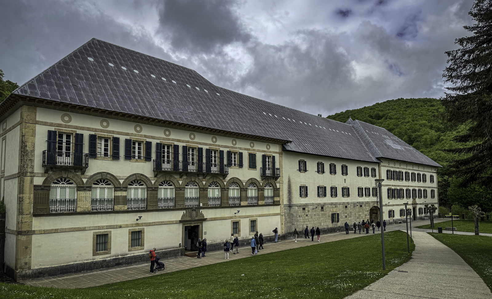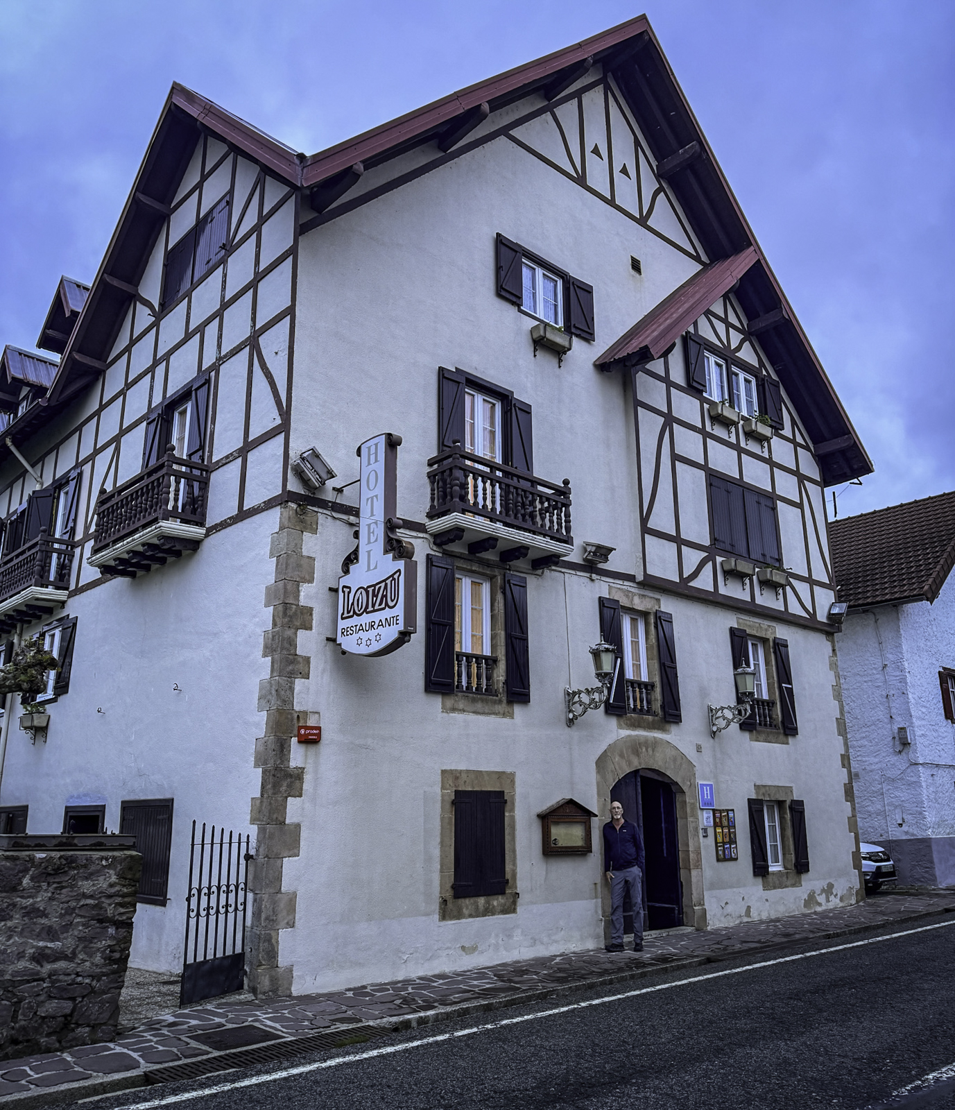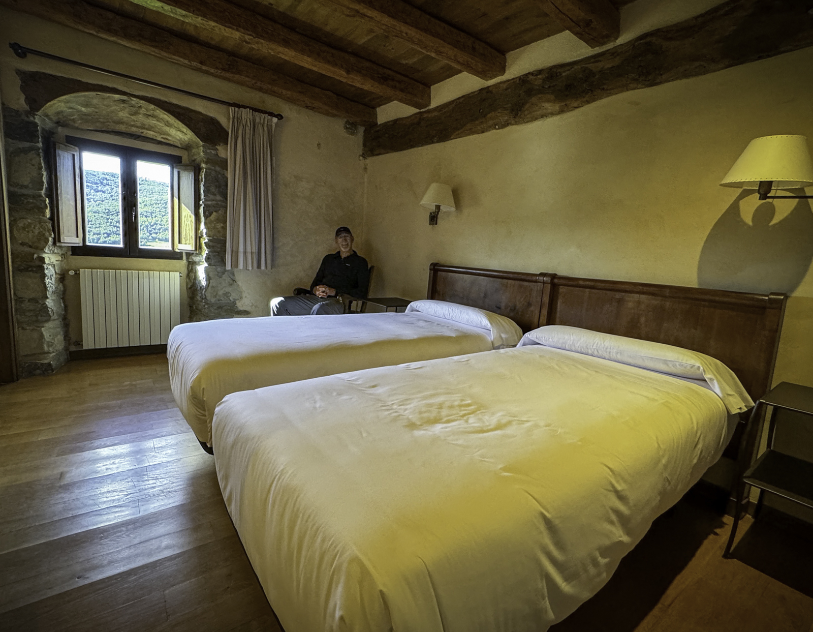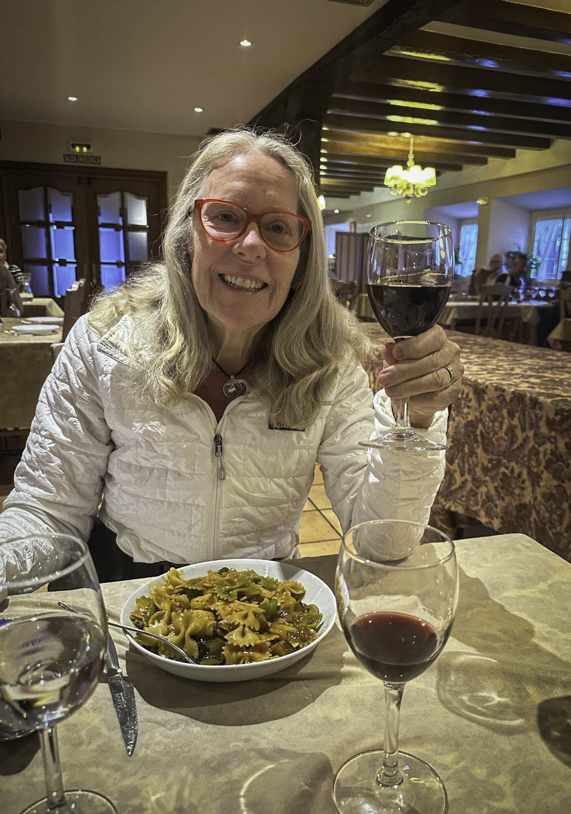 We still gained significant elevation as we ascended into the woods, but it’s more gradual compared to the more rigorous high route. Along the way, we passed small chapels and shrines, and views of the Pyrenean peaks rising above the valleys through the mist. Upon reaching Roncevalles, we were greeted by the historic monastery, a significant landmark for pilgrims, where we stopped to get our passports stamped. Since the Middle Ages, this collegiate church of Santa Maria de Orreaga/Roncevalles has been a resting place for Pilgrims along the French Way path. We were transported (3 km) to our accommodation tonight at Hotel Rural Loizu in Burguete. This hotel blends modern amenities with the charm of traditional Basque architecture, offering a cozy, restful environment after a long day, 8.5 hours, walking the Camino. This charming seasonal hotel in a half-timbered building dating from the 1900s, has been an inn for pilgrims since the 19th Century, and is located on the St James Way. We enjoyed our first Pilgrim meal of pasta, salad, dessert and wine for 24 euros. What a wonderful start to our journey on the Camino Frances. Click on thumbnail to view images
