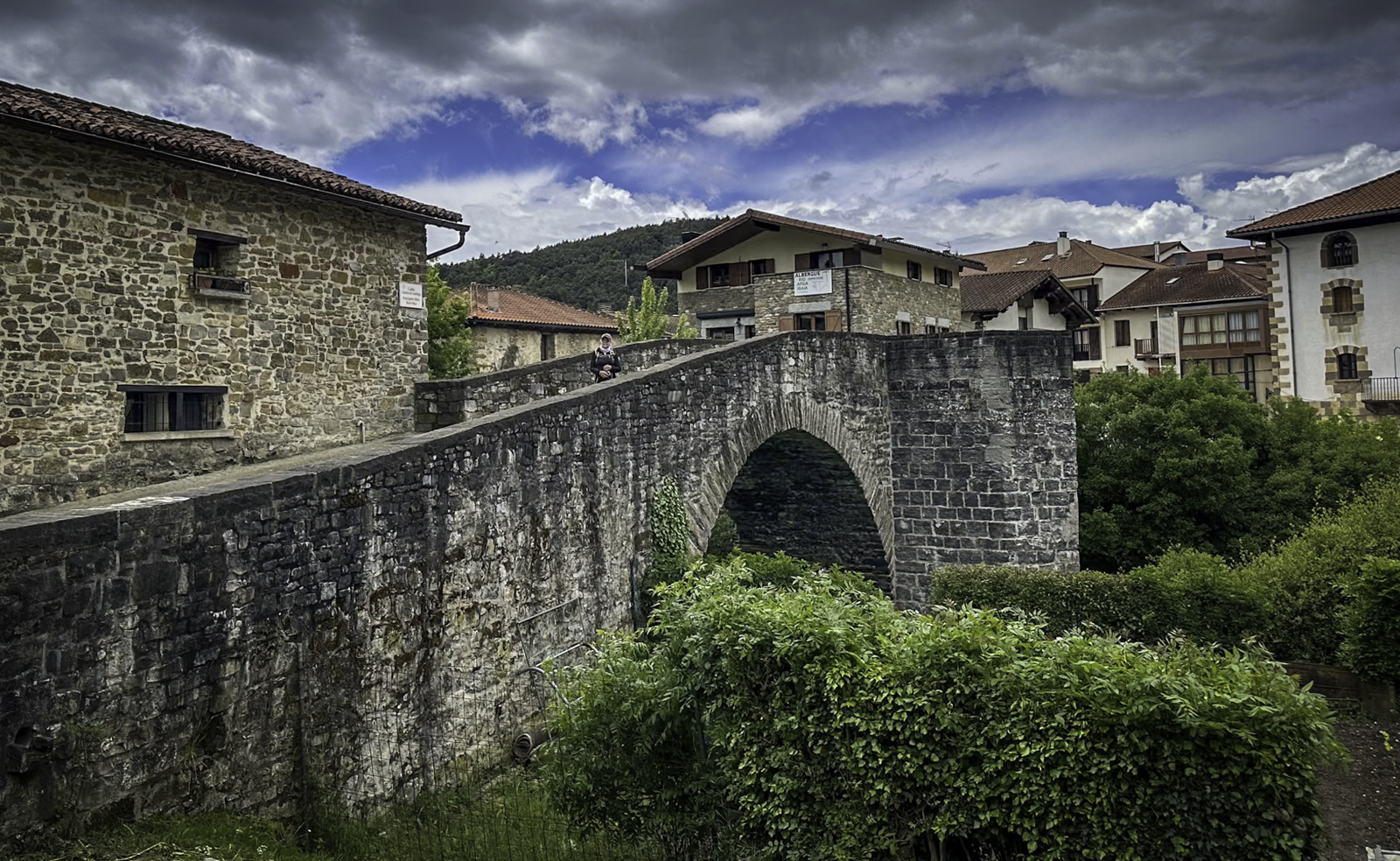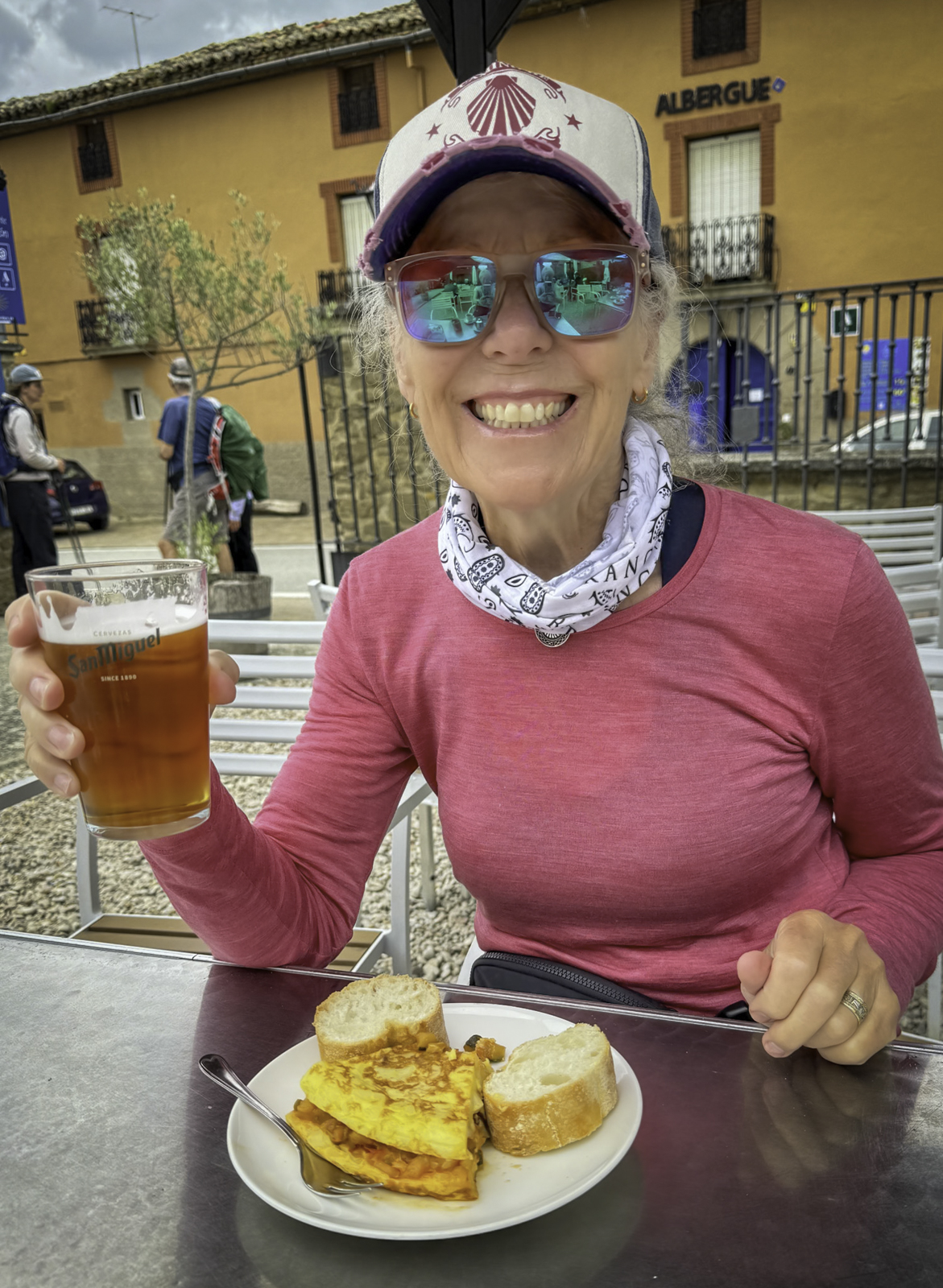 Today we started meeting pilgrims from many different countries. It was a chilly start to our day but a very pleasant walk on the Camino, stopping to take photos of all the new pilgrims we met along the Way. Walked mostly downhill across the fertile plain of the rio Erro, then ascended to the Alto de Erro that forms the ridge that separates the Erro from the Arga river valley. The scenery was very pastoral with lots of cows, horses and pigs grazing in the fields. We stopped for lunch at a beautiful view point and ate our sandwiches gazing across at the green plains in the distance. We continued walking to Zubiri crossing over the Zubiri Puente de la Rabia, a medieval bridge over the rio Arga, into the village. “Named Rabia from the legend that any animal led 3 times around the central arch would be cured of rabies.” We went into a quaint cafe full of pilgrims and ordered a delicious tortilla and a beer, my first beer on the Camino.