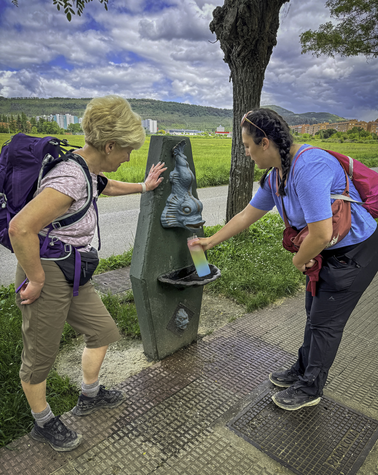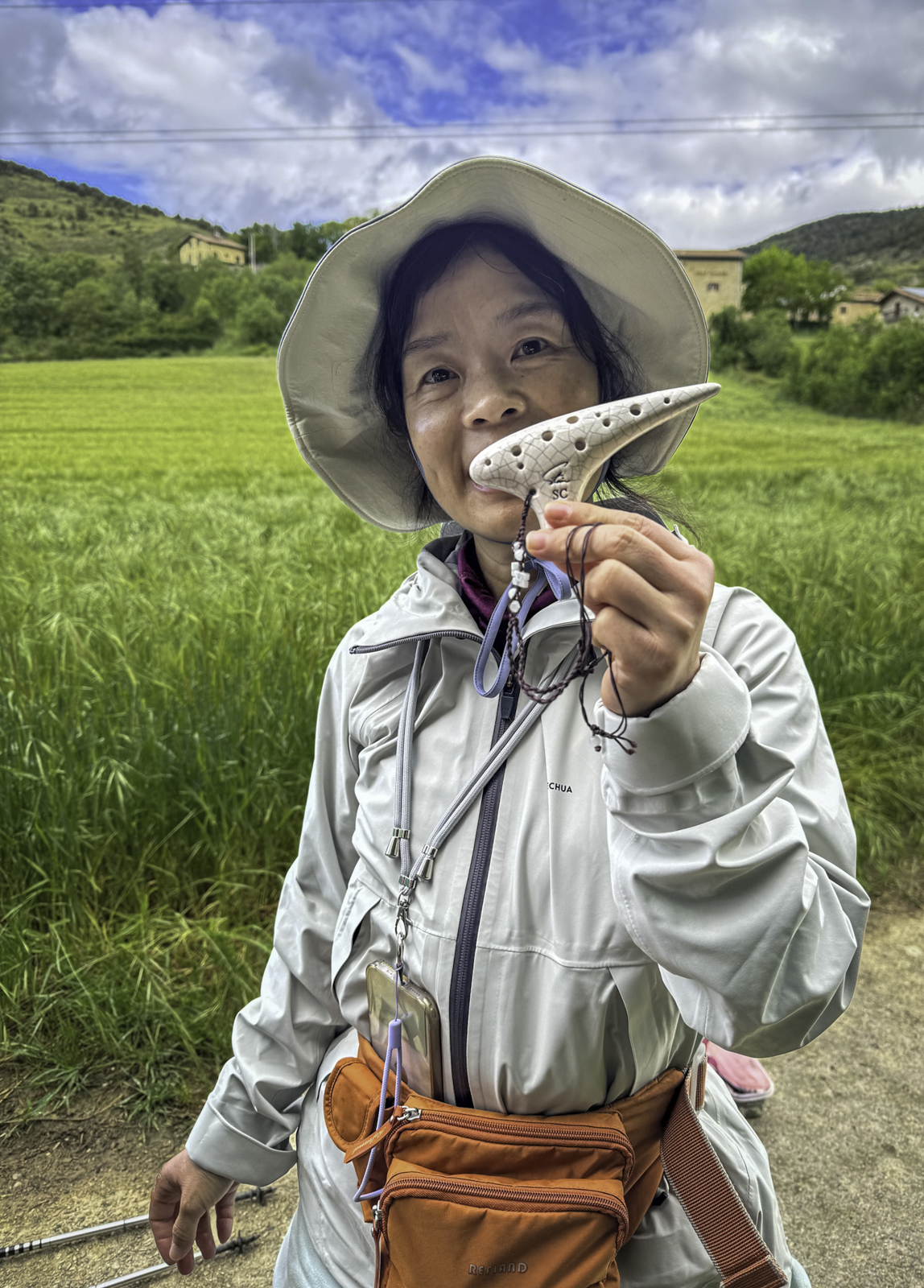 We enjoyed breakfast with Maggie and Gordon before leaving on our walk today to Pamplona. I left with them while Bob stayed back to catch a taxi to Pamplona. The first half of the walk is a tranquil path parallel to the rio Arga. There is plenty of shade along the tree-lined riverbanks and a number of drinking fonts along the Way. I enjoyed walking with Maggie and Gordon, the time pssed by quickly as we talked together most of the way. Soon we met 3 Chinese ladies from Wuhan who were on the path and we stopped to talk with them, only one could speak English. One of the ladies played a small recorder made from bone. She had burned her hand and had a terrible blister. Maggie, who is a very caring nurse, reached into her pack for her first aid kit, and cleaned the wound, put a bandage on it and told her to keep it covered. The lady was so thankful that she played Edelweiss for us, bringing us to tears as we listened to the beautiful sound coming from her instrument. It was so surreal; the music and the setting, the Camino provides when you least expect it.