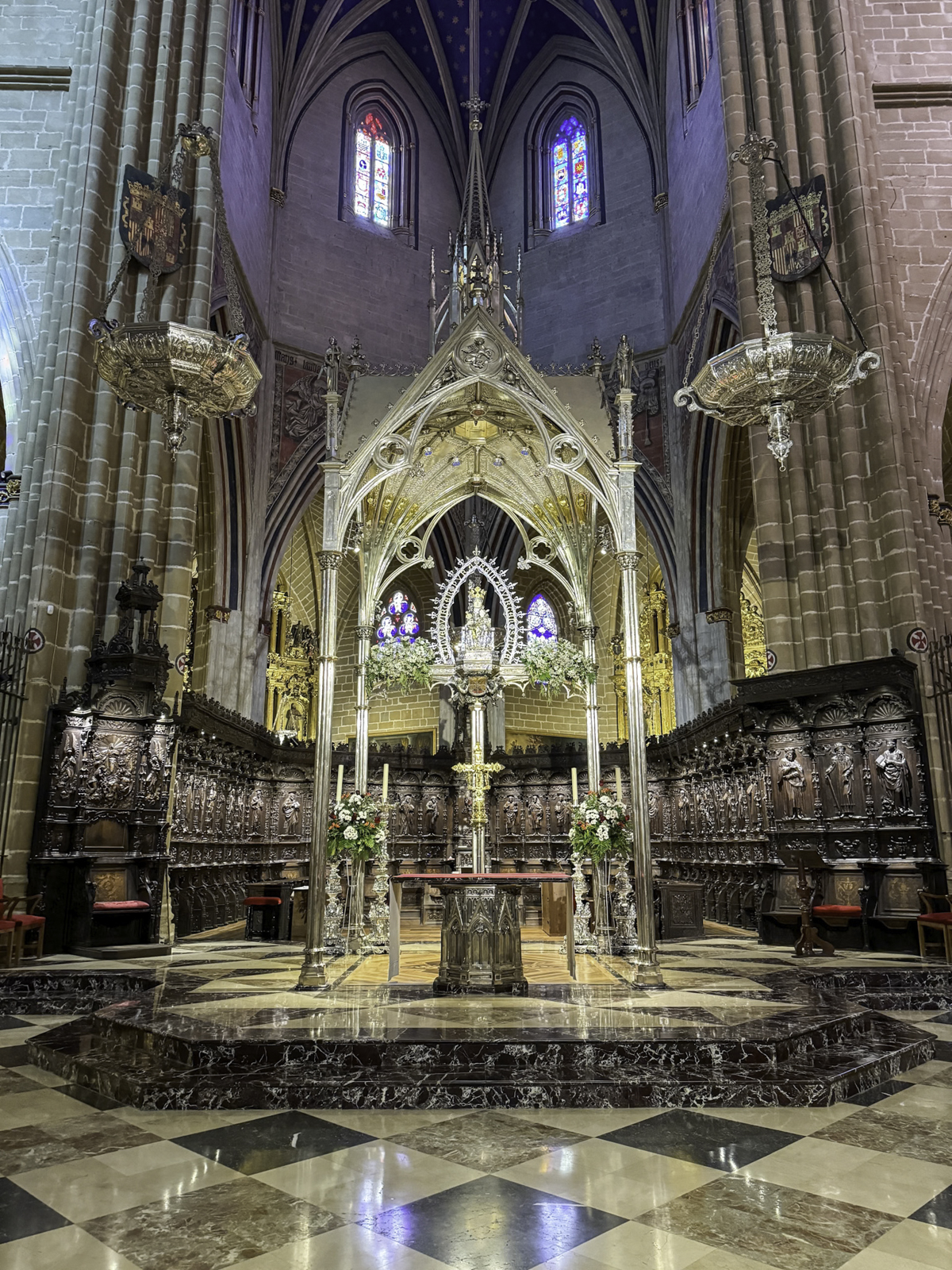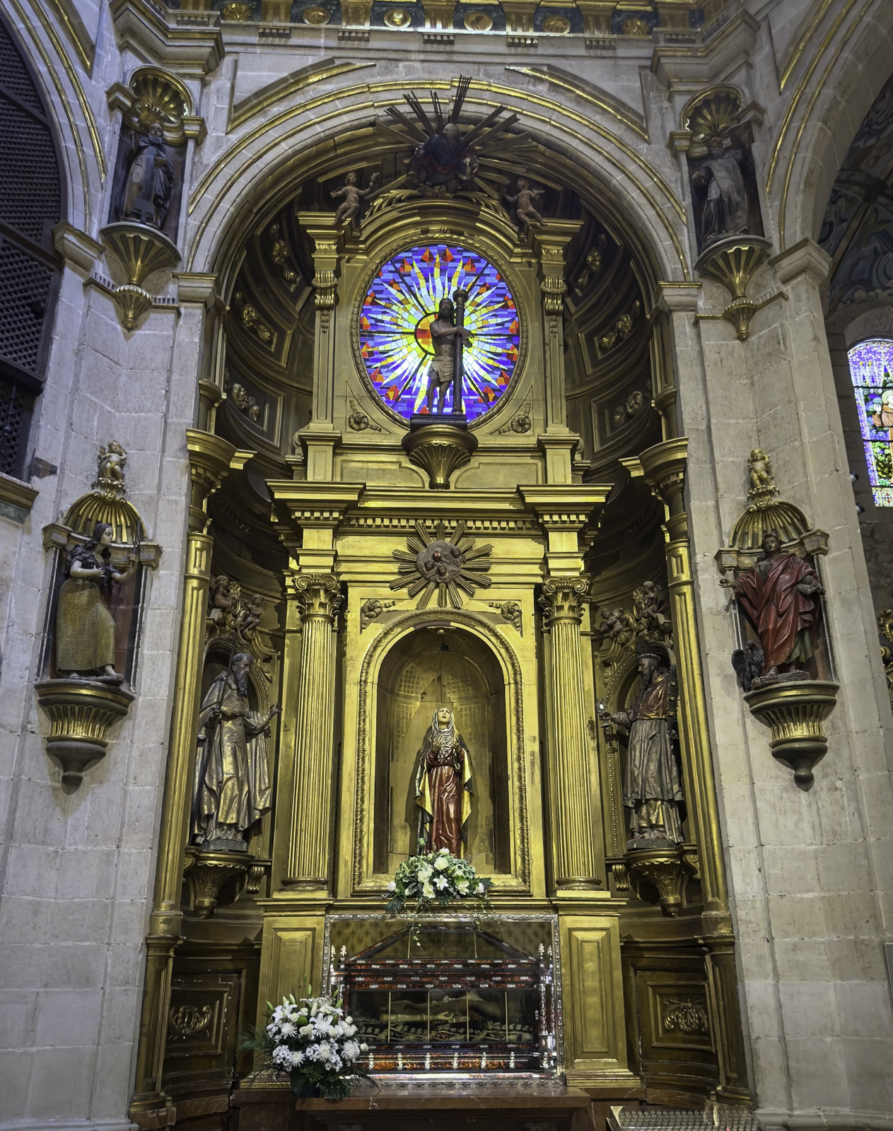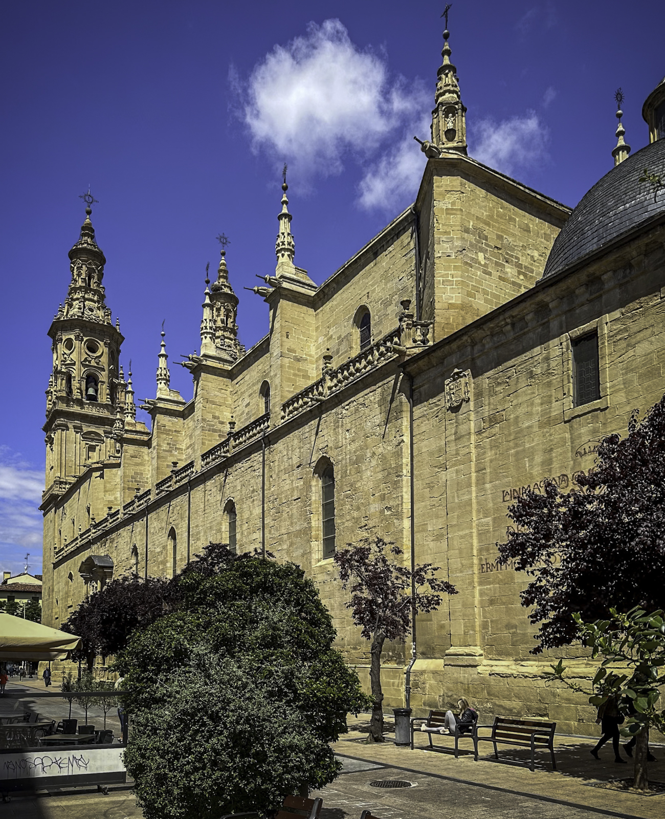 Logrono, the capital of the La Rioja region in northern Spain, famous for its wine, particularly the renowned Rioja wines, Logrono offers a rich blend of history, culture, and gastronomy. This was a perfect place to take our first rest day on the Camino. Slept in until 8:30, breakfast at 9 and got my hair done at a salon near by. Then we walked to the heart of old town, the Plaza del Mercado, to see the Gothic church, Catedral de Santa Maria de la Redonda XIIthC, its impressive twin towers Las Gemelas (the twins) were a later addition. As we stepped inside, we are greeted by a large, spacious nave lined with elegant columns that rise toward a high vaulted ceiling, typical of Baroque architecture’s emphasis on height and grandeur.