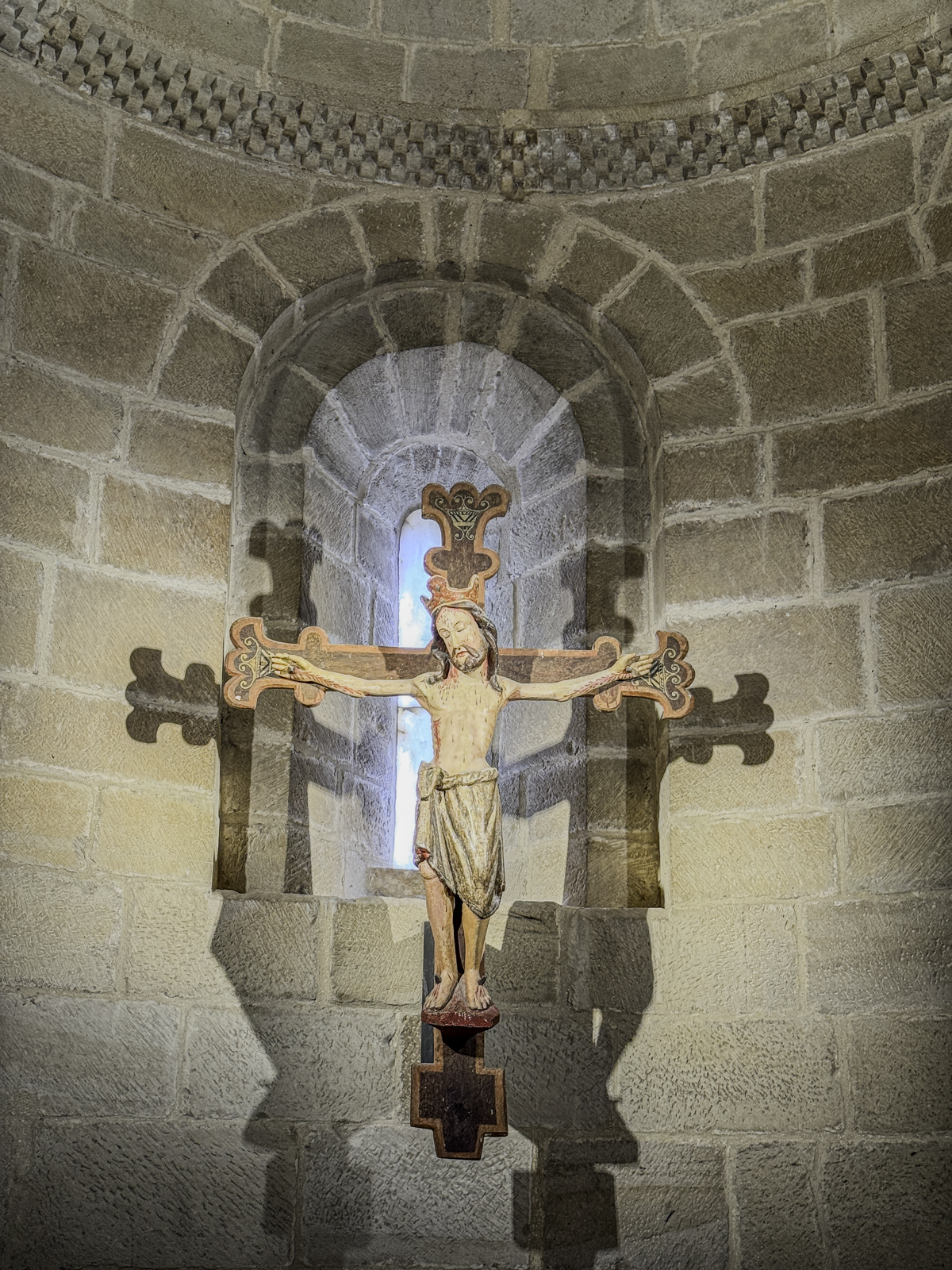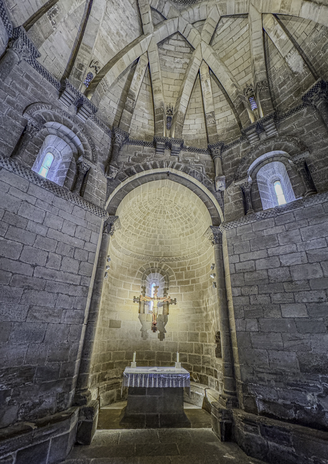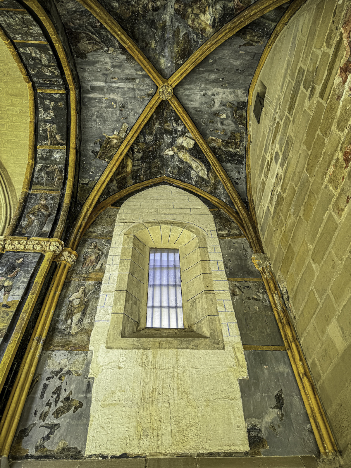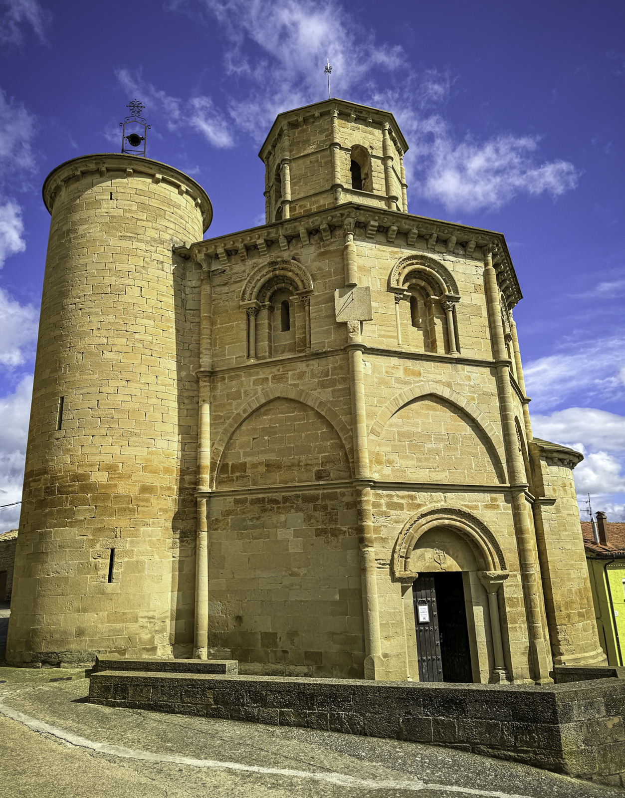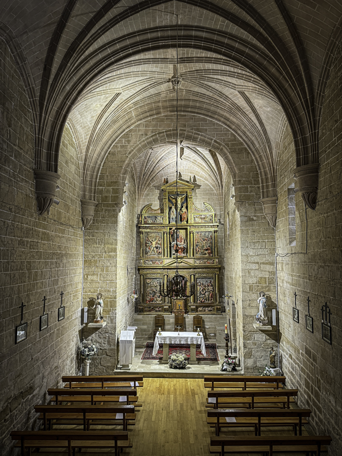 At 8 am the four of us set off on our walk along natural paths through open farmland. Todays walk is very long and there are some short but very steep sections into the Torres del Rio, and when we arrived at Sansol for a break Bob decided to take a taxi to Logrono. We were sitting enjoying our drinks when a taxi passed by the cafe, luckily the driver was stopping for a coffee as well. Bob went in the taxi and Maggie and Gordon and I continued down the path. After walking just 1 km we arrived in Torres del Rio and stopped for lunch at 10:30 am. We also visited the Iglesia de Santo Sepulcro XIIth C linked to the Knights Templar, and stands out for its unique octagonal shape, reminiscent of the Church of the Holy Sepulchre in Jerusalem, which influenced its name. The interior is simple yet striking, featuring an elaborate stone cupola with intricate arches and ribs that create a sense of height and lightness, and a XIIIthC crucifix on the altar.