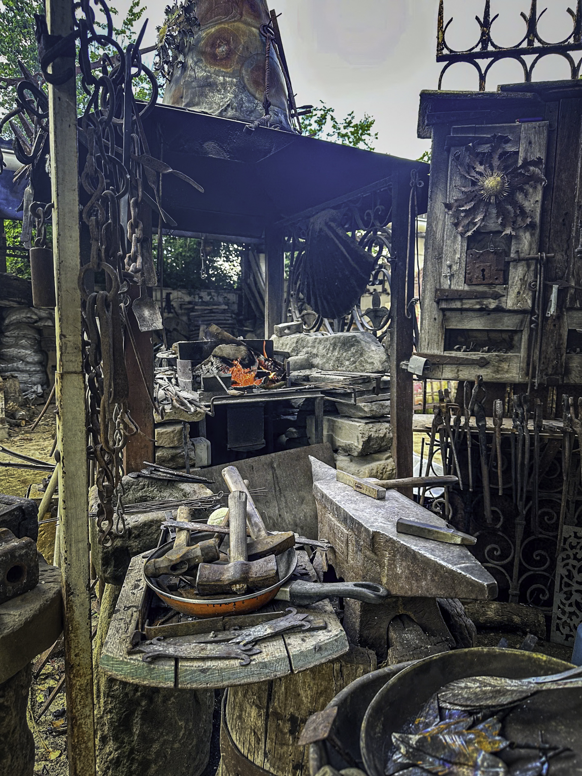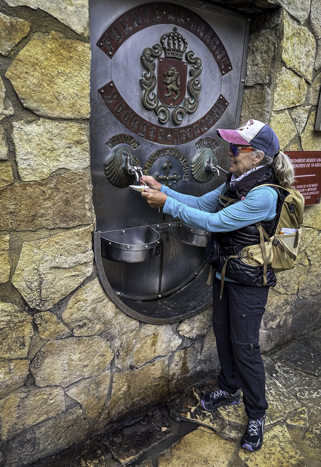 Leaving the Hotel we stopped to look at the Iglesia de San Miguel across the street, built between the 12th and 13th centuries, the church is perched on a hillside overlooking the town and the Ega River. We made our way through the cobblestone streets and across the Ega River on the medieval bridges until we came to an old Blacksmith Shop. This traditional herreria (blacksmith shop) is known for its role in creating custom metalwork, particularly the beautiful bronze bull on display. Next is a must stop on the Camino, the Bordegas Irache and the Wine Fountain. I enjoyed a few sips of the red wine from the Wine Fountain even though it was 8 am in the morning.