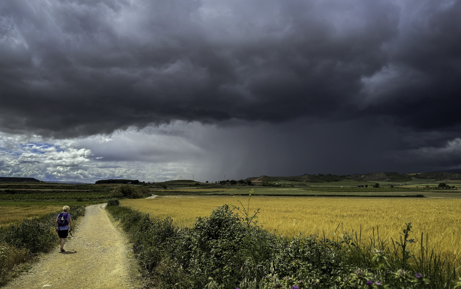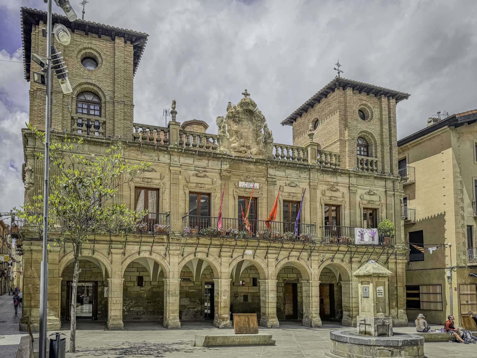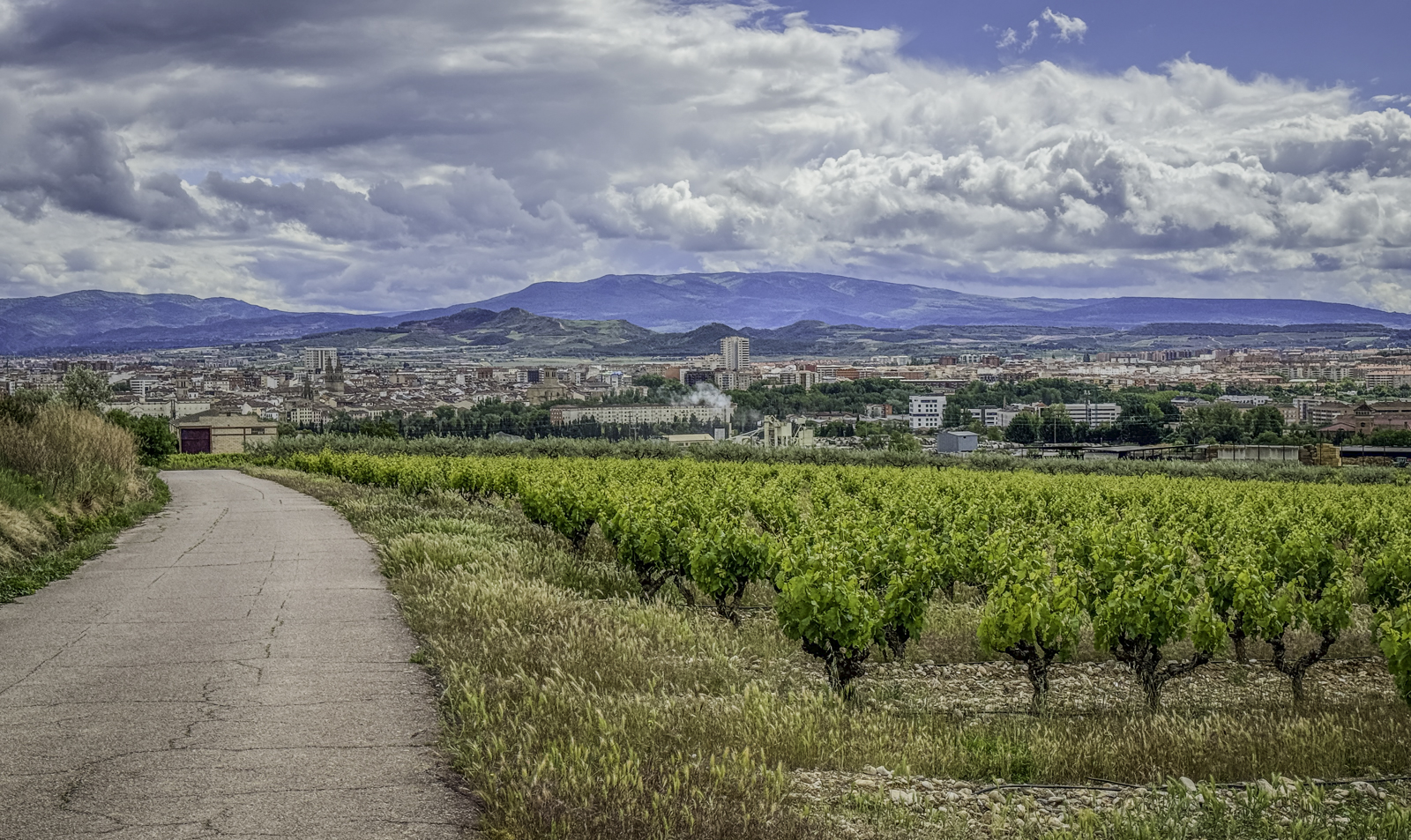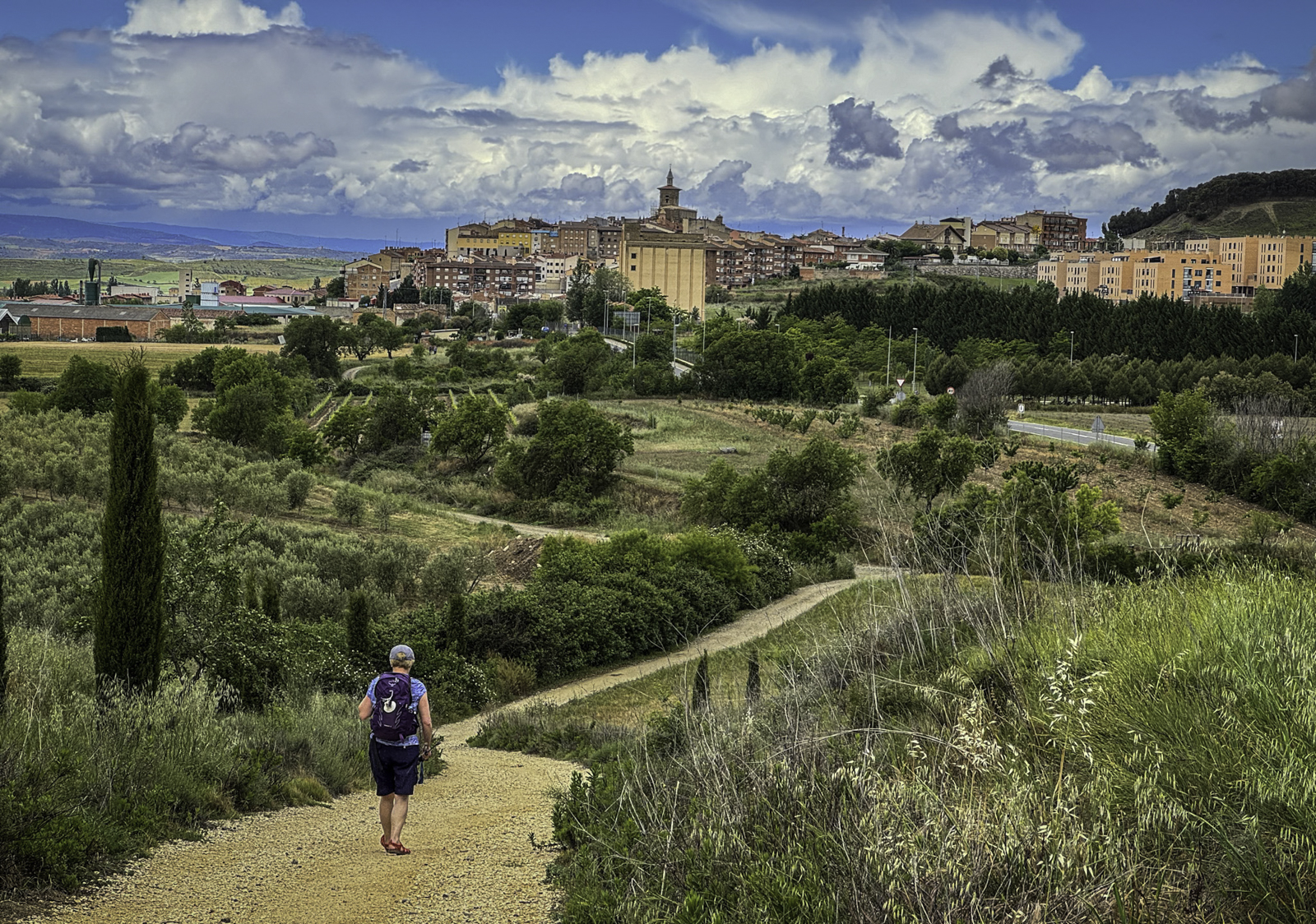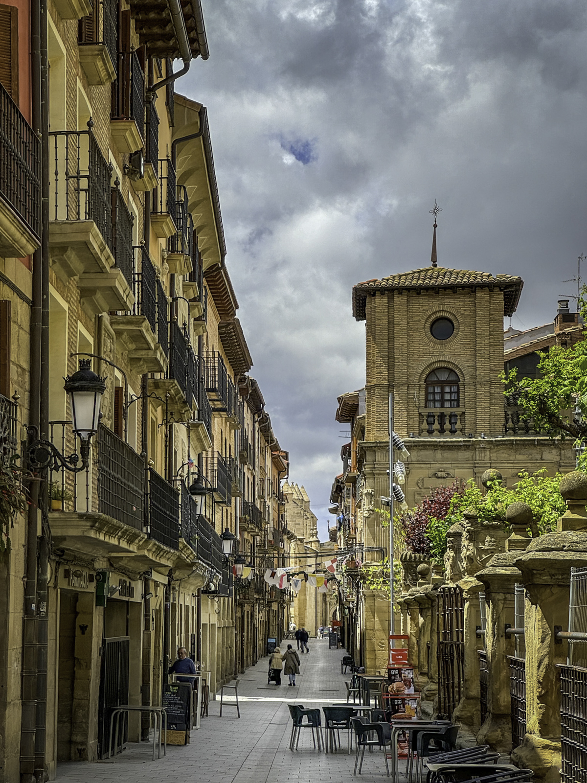 Continuing along the path we came to several prayer flags and momorials to loved ones who have passed, remembering them on their journey on the Camino. Soon we arrived at Viana, the Camino passes through its historical center, which is little changed, its architectural heritage still largely intact. We reflected on the ruins of the Church of St. Peter, San Pedro, despite being in ruins the church remains a hauntingly beautiful site. The remnants of its original grandeur visible in the surviving arches, columns, and walls, and the beautiful gardens that lead from it. Built in the early 13th century in a Gothic style, the church was one of the most important religious buildings in the area. We stopped for some afternoon tea in the Square before leaving the town through the medieval stone arch, Portal San Felice; we still had 9 km to go before reaching Logrono and a storm was brewing in the distance. Finally we arrived at our destination at 5:30 pm, and found Bob waiting for me in our room. We went out for dinner with Maggie and Gordon to Calle Del Laurel, a quaint street famous for it tapas bars and pintxos (small bites). It is our last dinner together, they are heading out tomorrow and we are taking a day of rest in Logrono. Click on thumbnail to view images