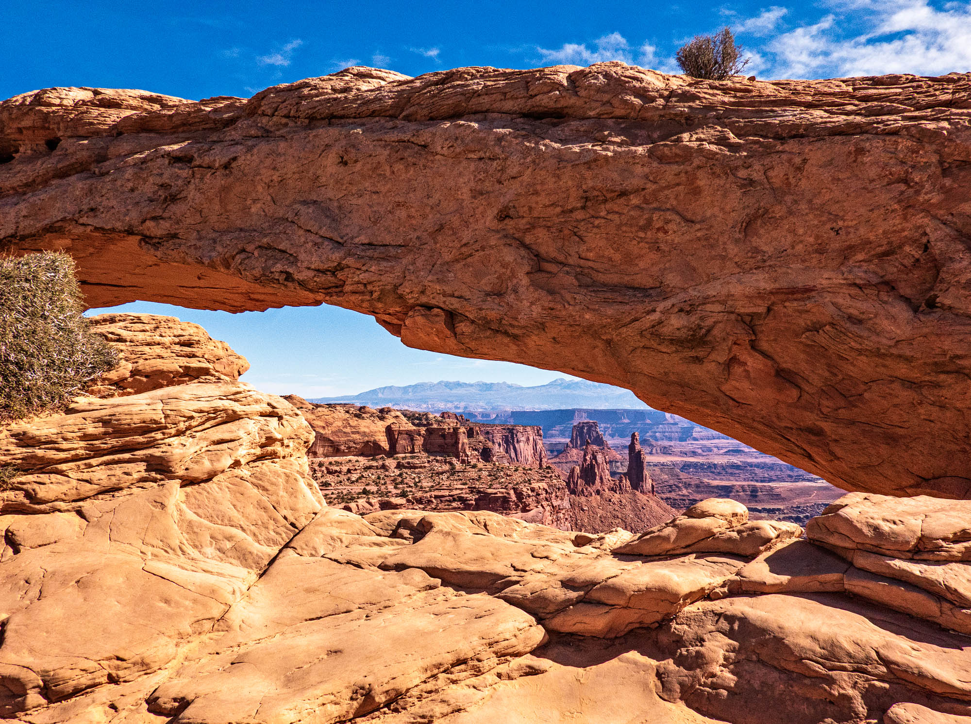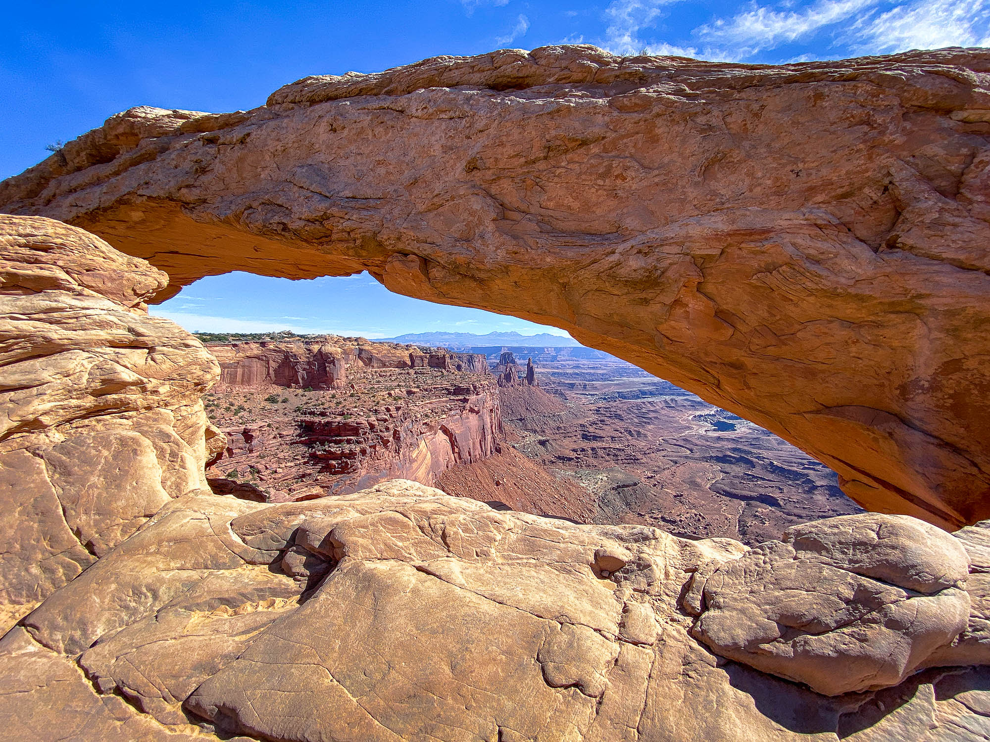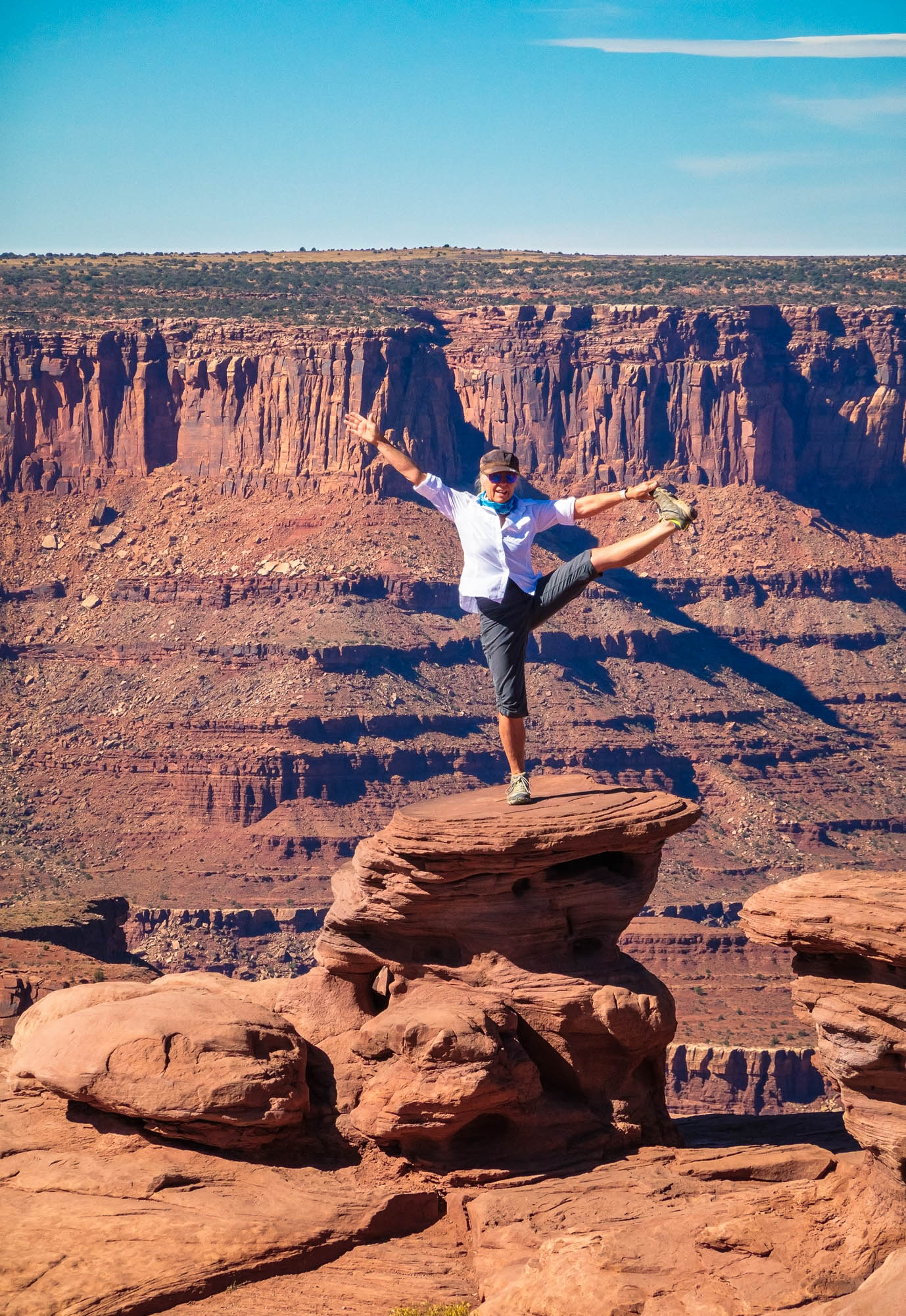 Another day in Canyonlands National Park we visited Mesa Arch and Dead Horse Point State Park. According to legend, the park is so named because of its use as a natural corral by cowboys in the 19th century, where horses often died of exposure. We drove to the overlook to get a dramatic view of the Colorado River and Canyonlands National Park. Mesa Arch is a spectacular stone arch perched at the edge of a cliff with vast views of the canyons, rock spires and the La Sal Mountains in the distance. You are not allowed to climb on top of the arches, like I did the last time we were here, so we took pictures of the views. Perched on the edge of a 500-foot cliff, Mesa Arch overlooks Buck Canyon and the dramatic Canyonlands landscape below, one of the iconic shots is the sunrise at Mesa Arch, which we have not seen yet. Save that for our next trip to Canyonlands National Park. Click on thumbnail to view images