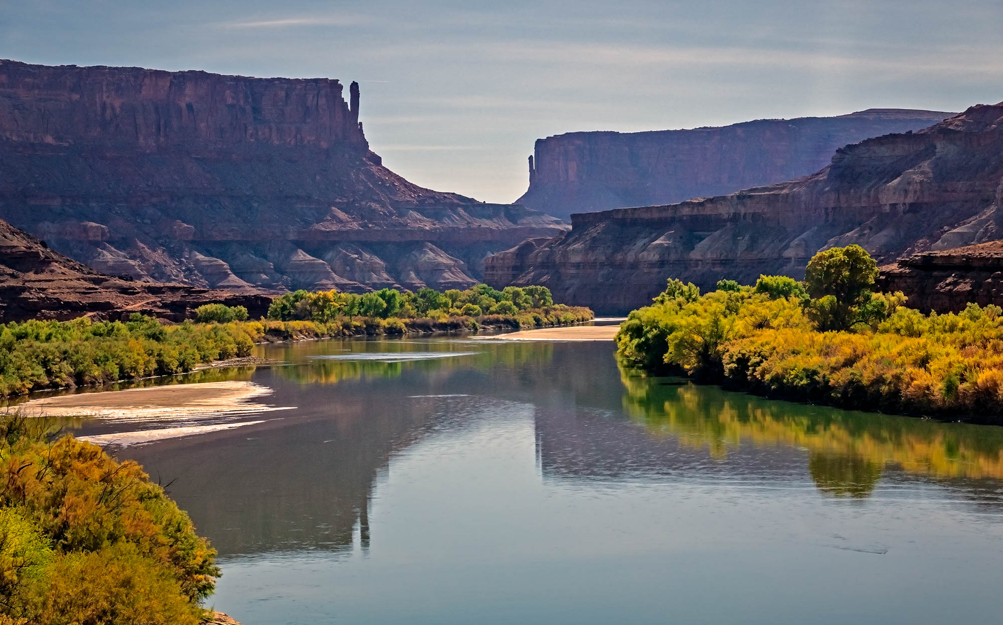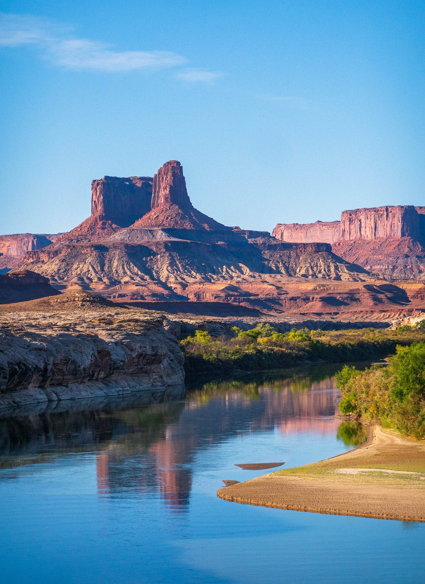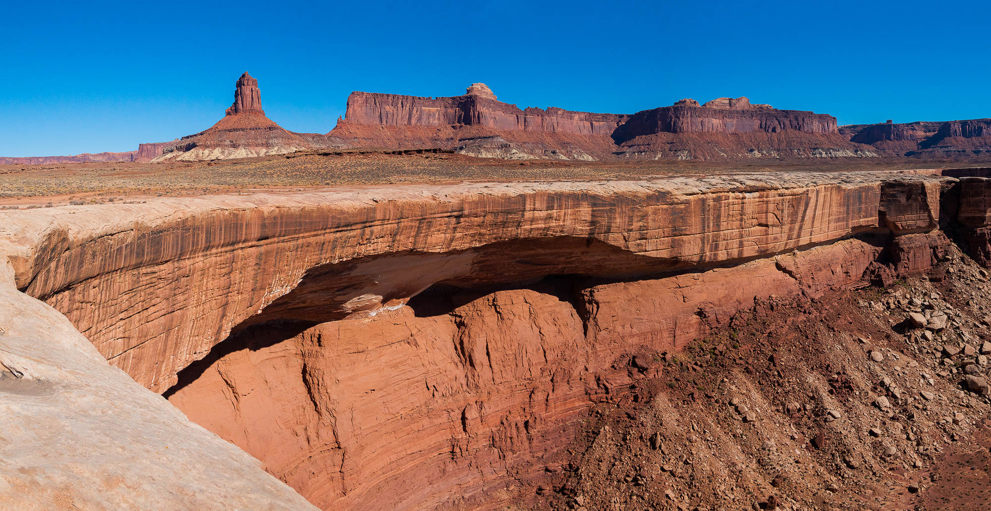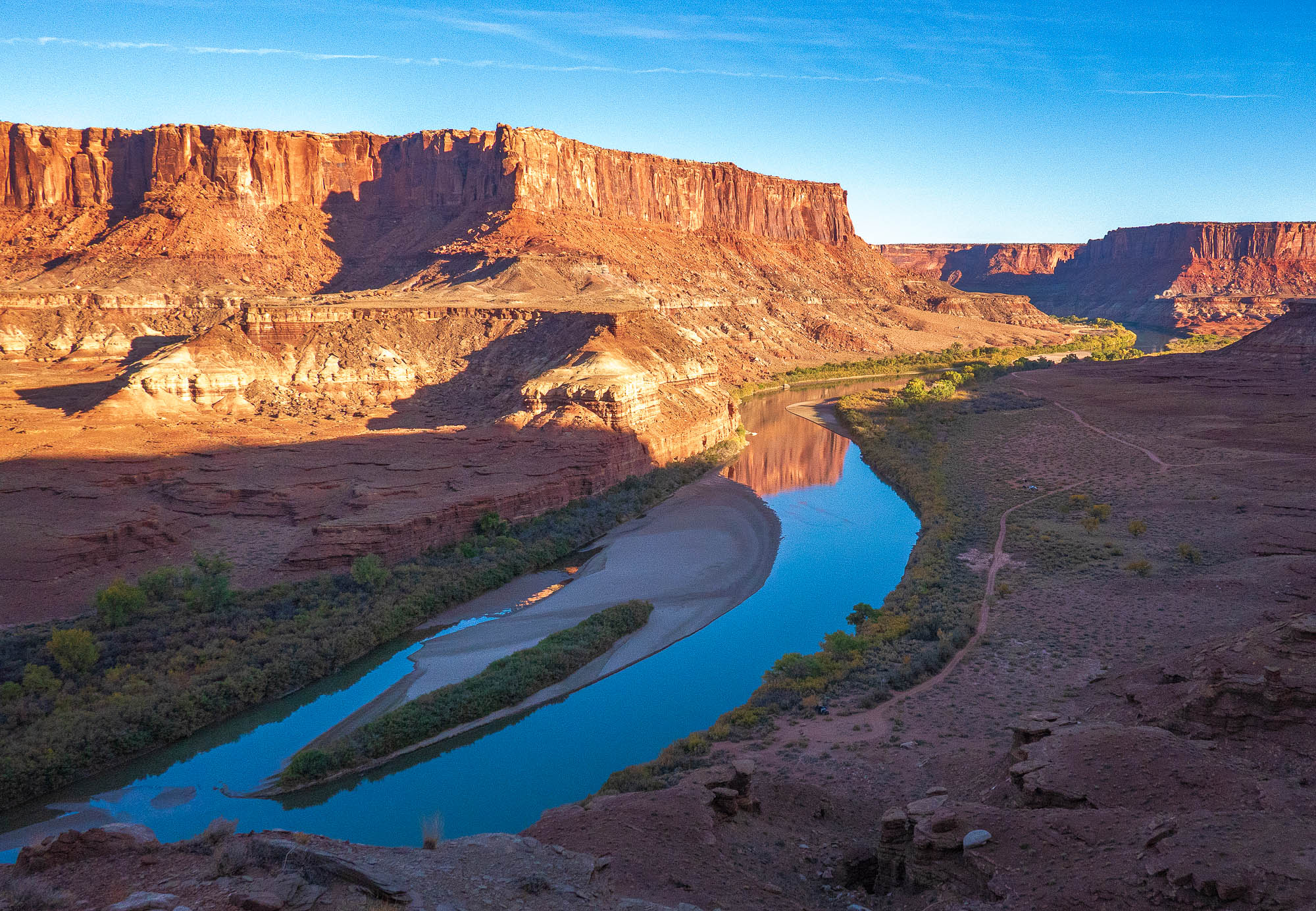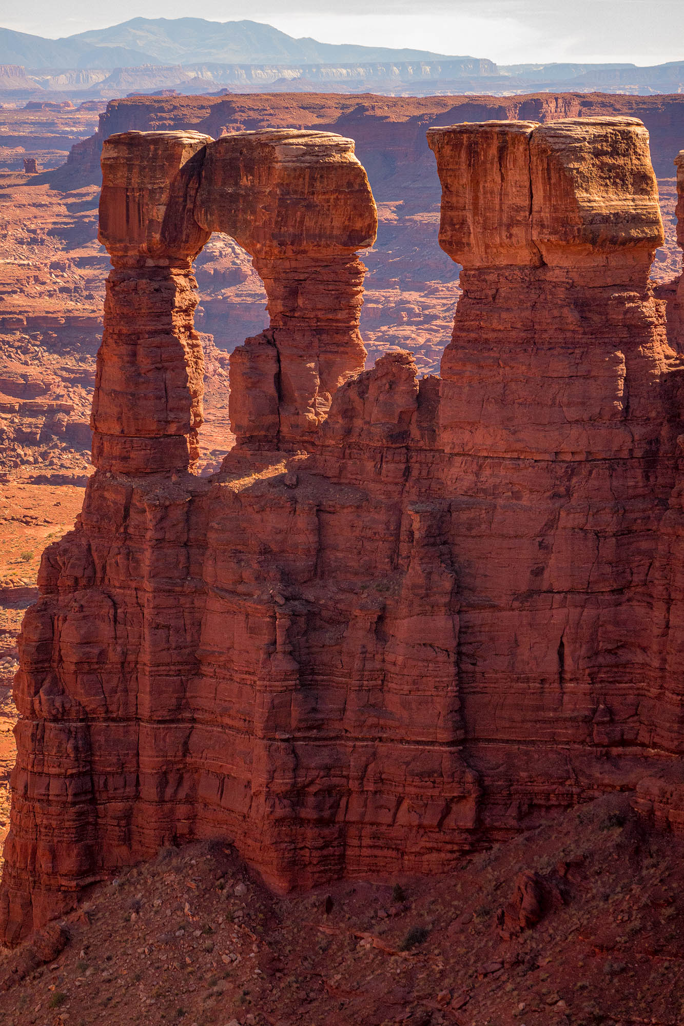 We reached the top without meeting another vehicle and stopped here for lunch talking to some mountain bikers who are riding the entire White Rim Trail in one day going the opposite way. They told us to drive out to view the White Crack and so that was our next stop. The view from atop this massive chunk of white rock was impressive. We continued on the White Rim Trail as we were only half way to the Shafer Road and it was late afternoon, but we stopped at Monument Basin and Buck Canyon to take pictures. Then we came to the Monster Tower and Washer Woman Tower, a 500-foot tall sandstone arch and tower. Washer Woman is so named because the feature gives the appearance of a washer woman bent over a washtub. Our final arch was Musselman Arch and I walked across the arch to get a better perspective of how large it is, and at its narrowest it is approximately three feet wide. In appearance Musselman Arch is more of a bridge than an arch as it is relatively flat and spans the canyon below. Finally we made it to a view point of the Colorado River as it was nearing dusk and we wanted to complete the White Rim Trail before dark.