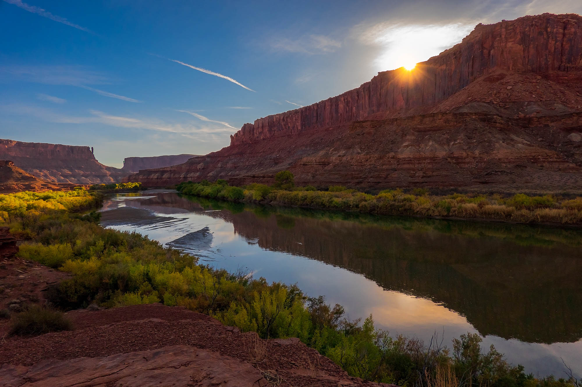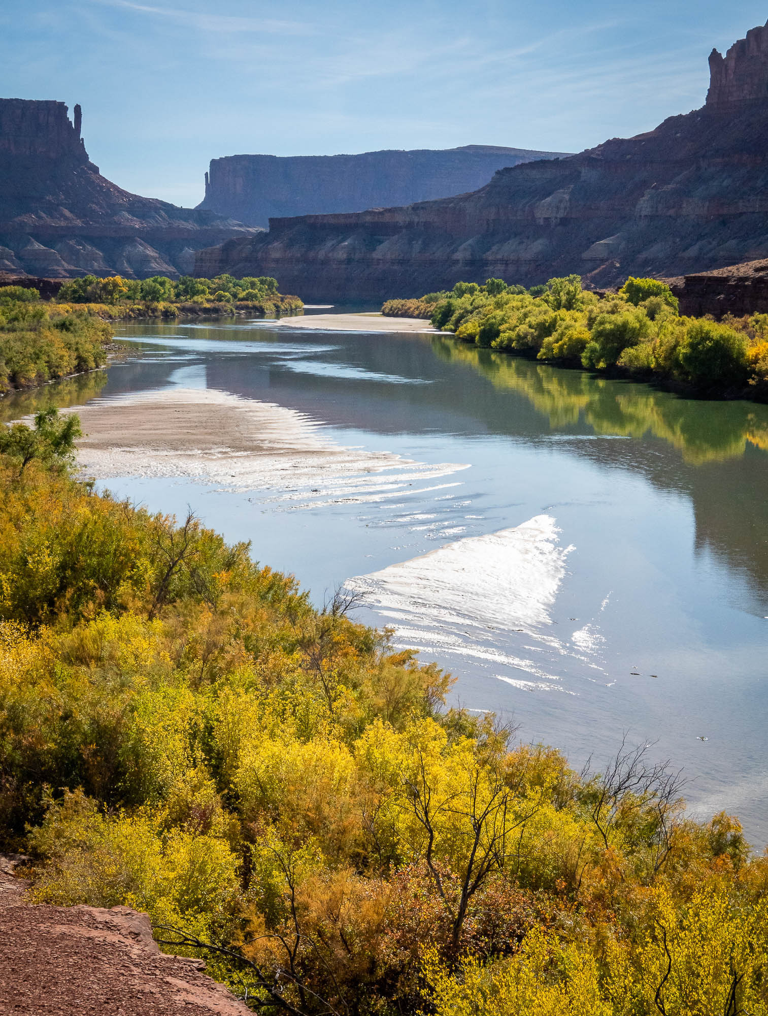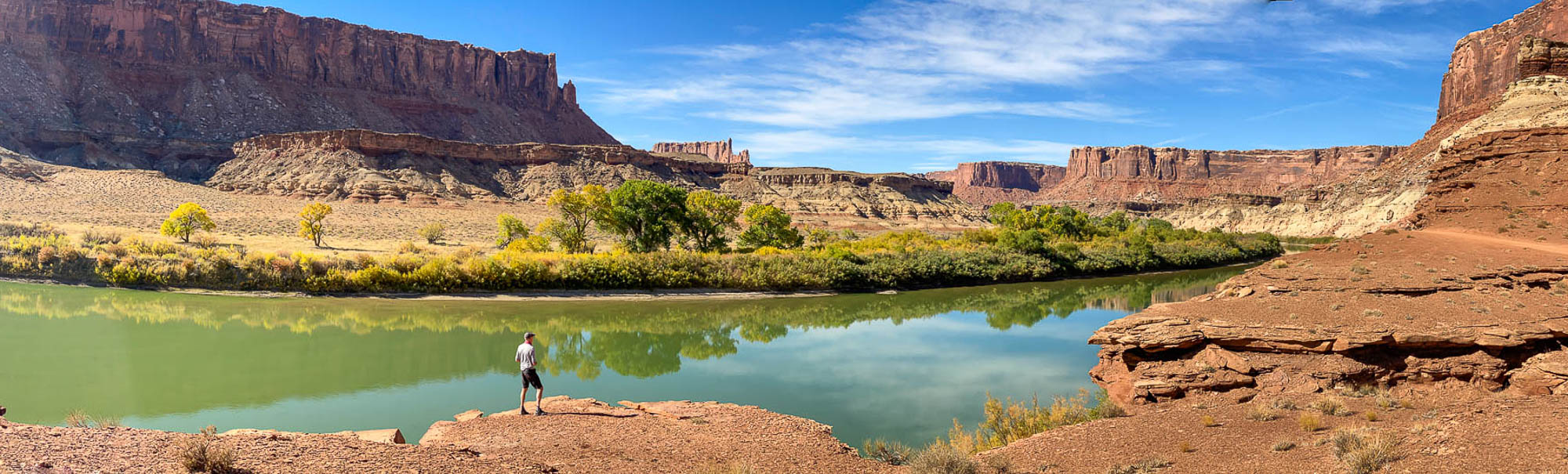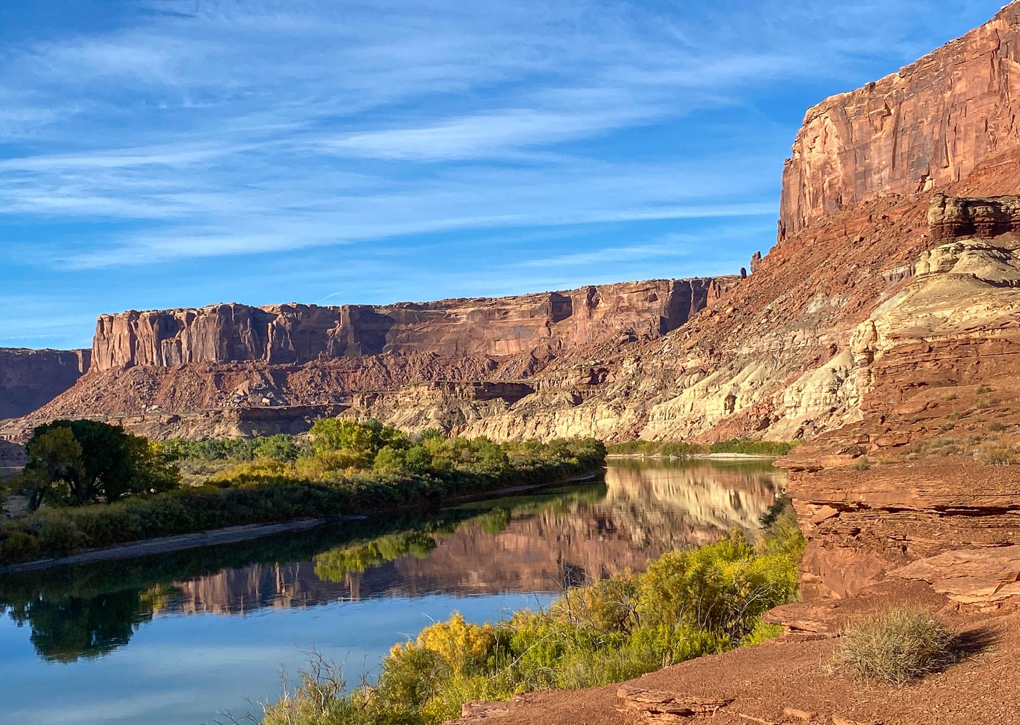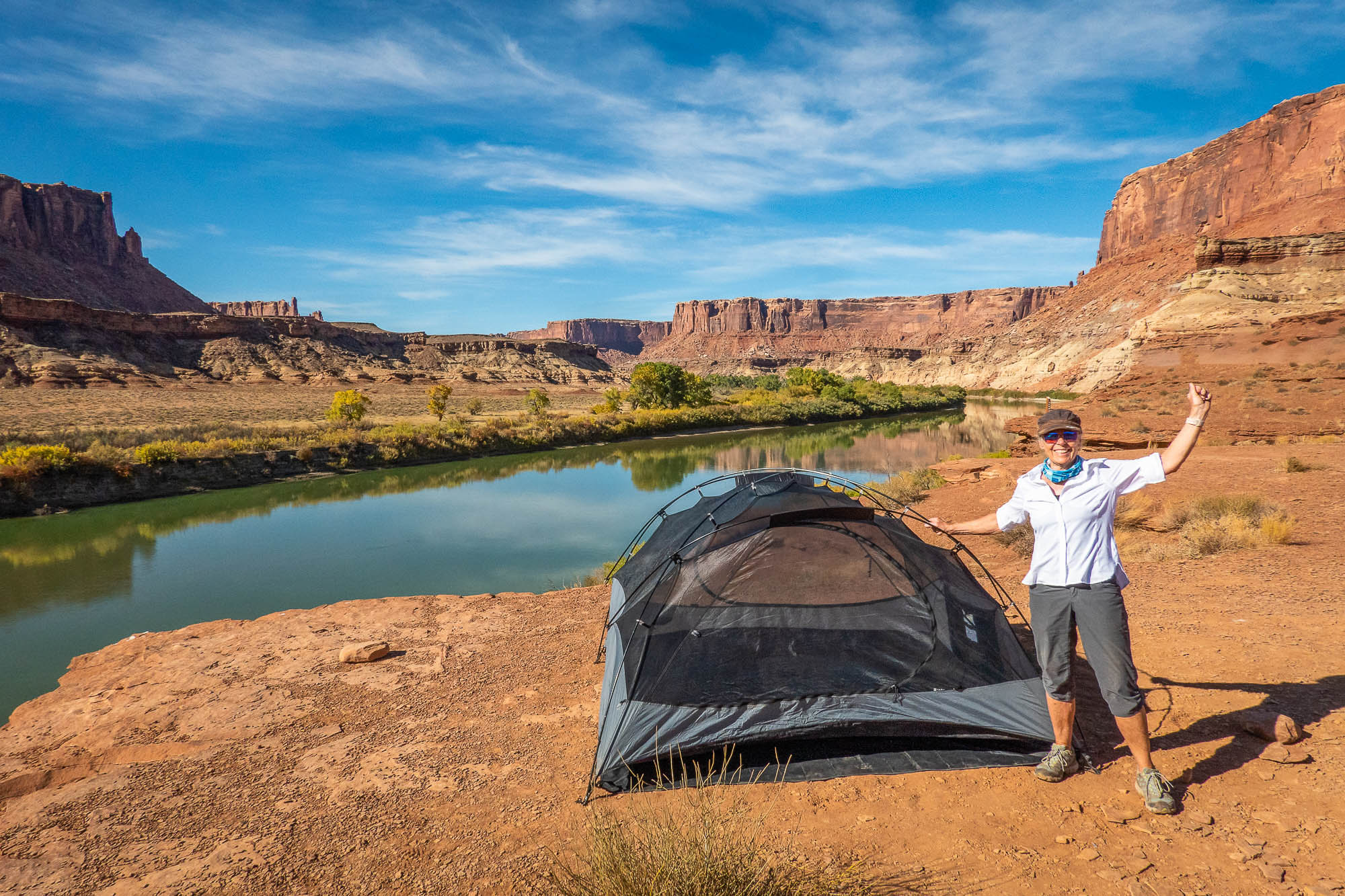 We were able to get only one overnight backcountry permit on the White Rim Road for October 20 to 21. The 100-mile White Rim Road loops around and below the Island in the Sky mesa top, and this road was on our bucket-list of adventures. The White Rim Road was constructed in the 1950’s by the Atomic Energy Commission to gain access to the uranium deposits in this area. However, the mines produced very little uranium and were soon abandoned. The road gets its name because it traverses the top of White Rim Sandstone, this is the layer of rock that sits right below the mesa of Island in the Sky. We started our adventure on the Mineral Springs switchbacks and drove along the Green River to the Labyrinth campsites, our stop for the night. The road along the Green River was very narrow with a drop off into the river. If you have a fear of heights, you might want to skip this drive. We made it to our campsite and set up camp next to the Green River, a spectacular setting and so surreal. We enjoyed a beautiful sunset before heading to bed. Click on thumbnail to view images