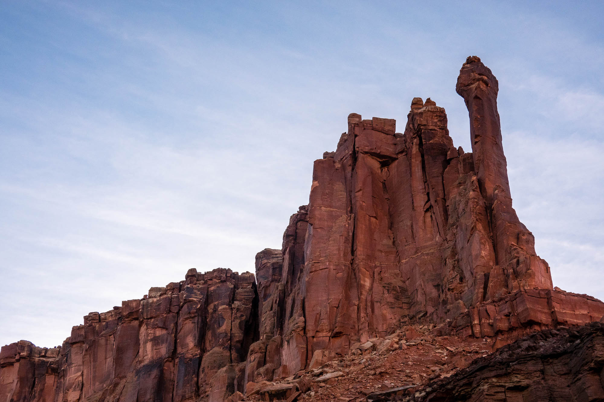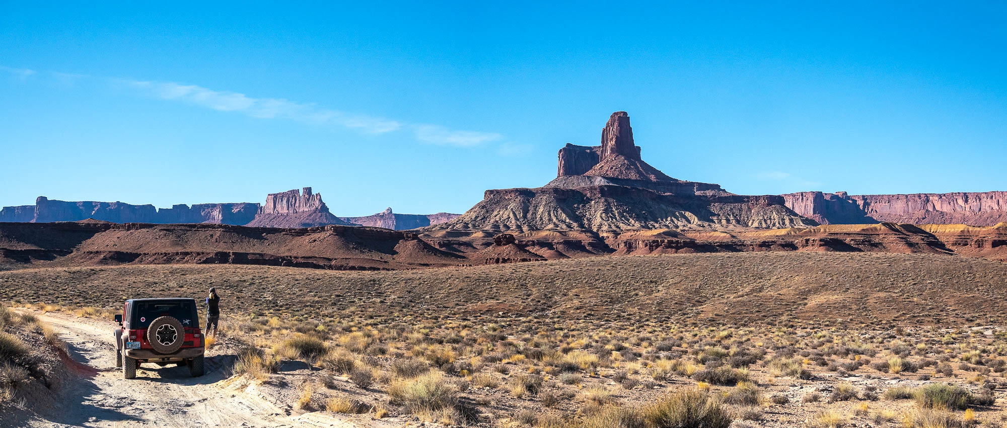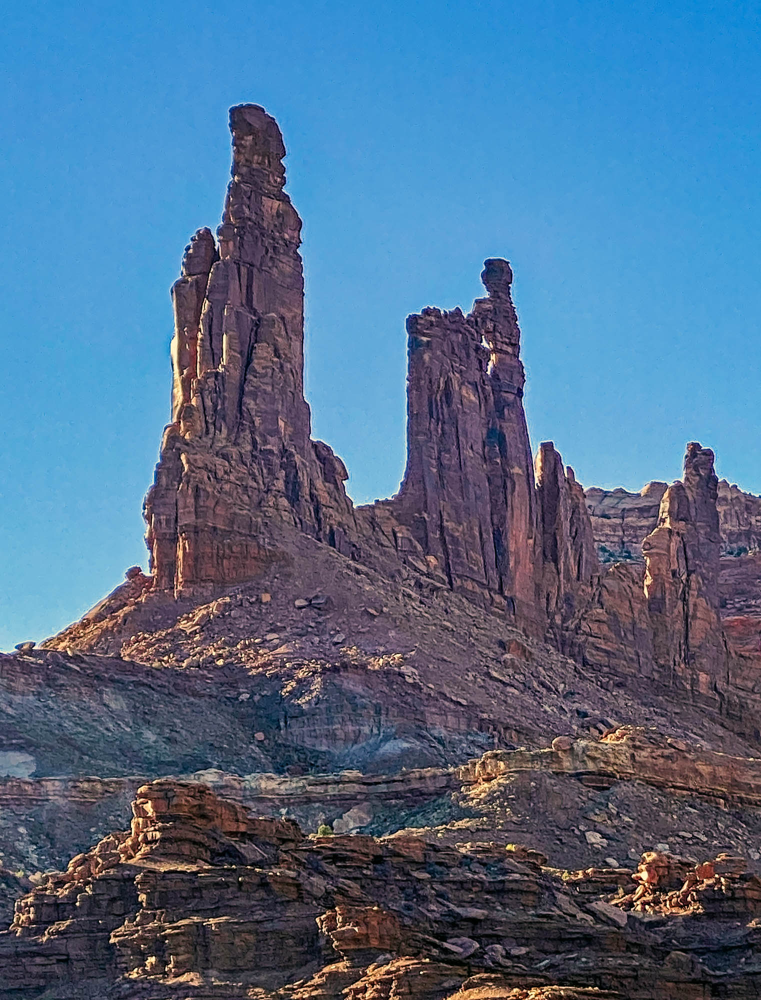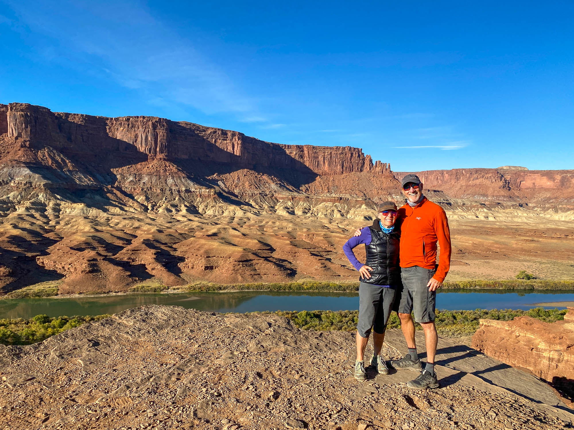 The sunrise while eating breakfast was as beautiful as the sunset. We left camp early because we had a lot of miles on the White Rim Road to complete. Our first challenge was climbing up Hardscrabble Bottom hill and we met mountain bikers who rode up the hill from the other direction. It’s a steep single lane road so you don’t want to meet another vehicle coming down or you have to back up. The view of the Green River from the hill was beautiful and we stayed here talking to the mountain bikers enjoying the vistas. Across the Green River we could see the Buttes of the Cross, two sandstone summits that align to form the shape of a cross, creating the appearance of a single butte. Continuing along the White Rim Trail stopping to get photos of the sandstone rock formations, when we saw Candlestick Tower in the distance, rising 1,400 feet above the White Rim Road, a 450-foot tall sandstone butte composed of Wingate Sandstone. Murphy Hogback was another hair-raising ascent, a steep climb with a drop off on one side and the rock wall on the other.
