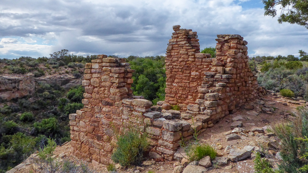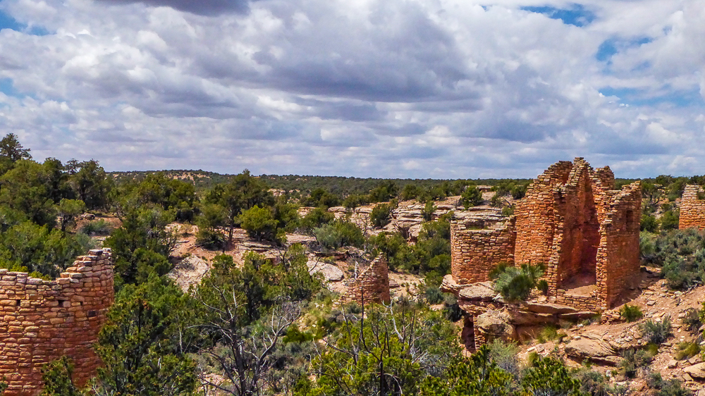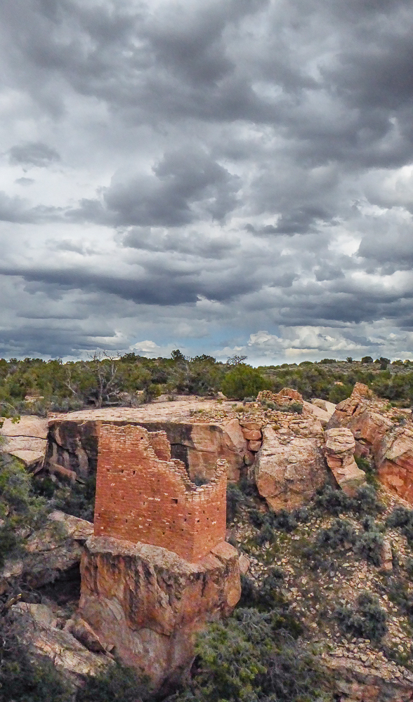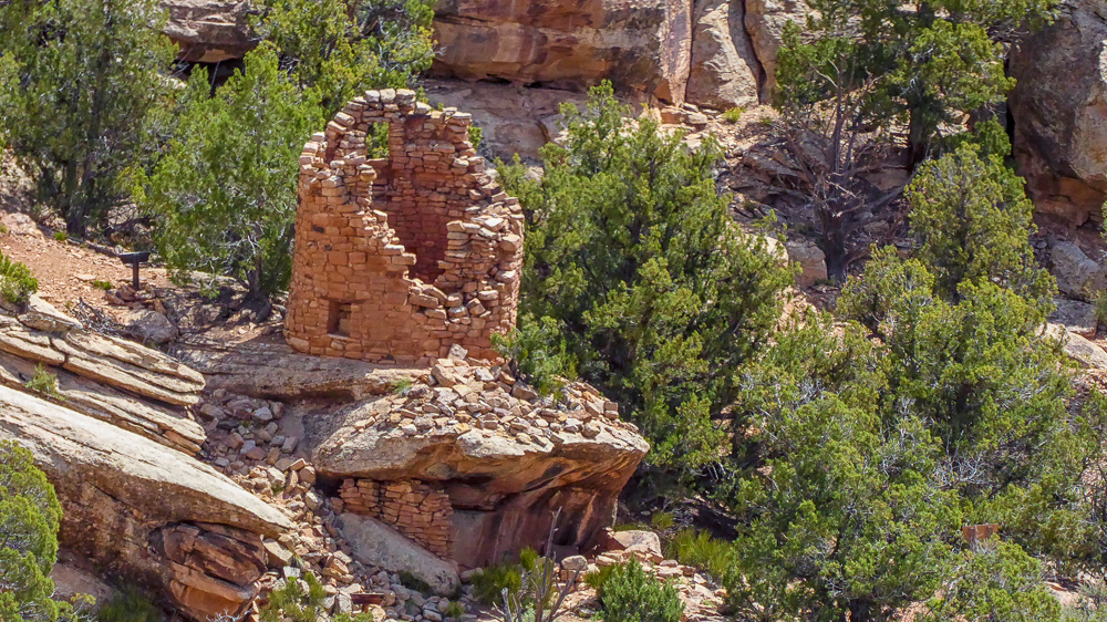 Then we continued on down the road to see the Painted Hand Pueblo, built in the AD 1200s, it was a small village of about 20 rooms that still include faint rock paintings, and we were able to find one of the faint hand paintings. We saw a sign to Cutthroat Castle Ruins, it was a four-wheel drive road, and well worth the drive to some fantastic ruins, part of the Hovenweep National Monument. The Cutthroat ruins were built approximately 800 years ago by the Ancestral Puebloans nestled in a forest of piñon and juniper trees that provided the Puebloans with a variety of useful material. After walking around these ruins we continued along the four-wheel drive road back to the paved road to the the visitor center of the Hovenweep National Monument. Click on thumbnail to view images