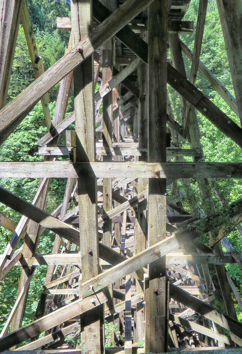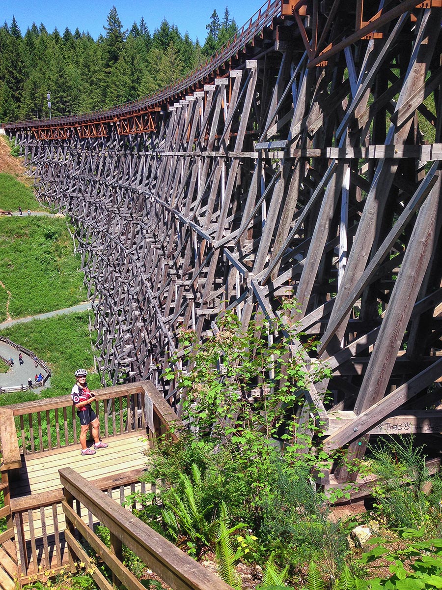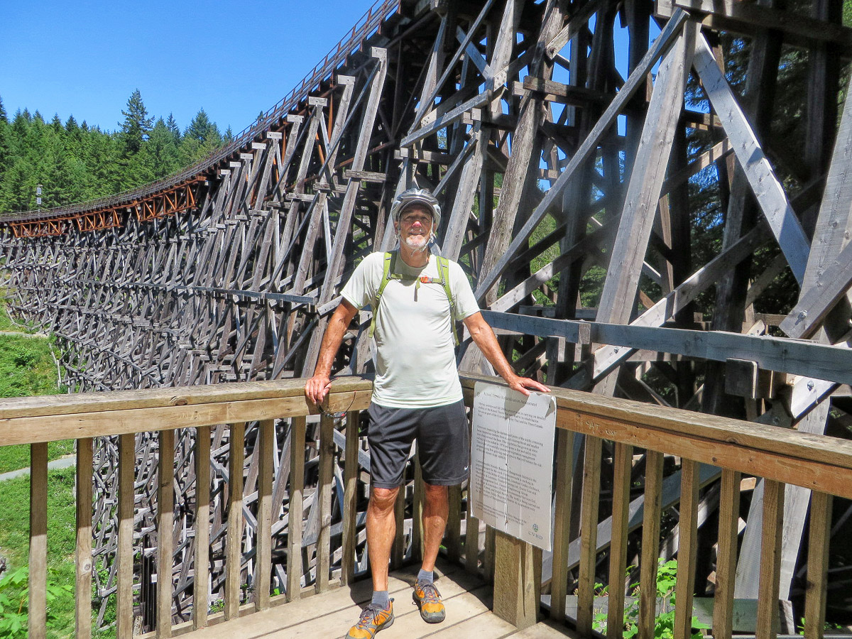 On June 30th we took the Vesuvius Ferry over to Crofton and drove south to the town of Lake Cowichan. Here we rode our bikes on the Cowichan Valley Trail all the way to the south end of Shawnigan Lake. The trail follows the gentle grade of the former turn of the century CN railway line that served pioneer logging and settlement communities. It was a pleasant ride through the trees and over eight trestles, with the largest one at the end called the Kinsol Trestle, here we turned around. The historic Kinsol Trestle is one of the tallest free-standing and most spectacular timber rail trestle structures in the world. At 614 feet in length and standing 145 feet above the Koksilah River, it is an incredible structure. Coming back was harder and longer than going and we were happy when we got back to the car, not sure of the mileage but it had to be at least 60 miles.