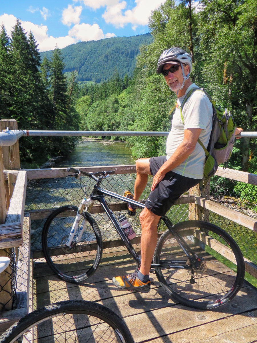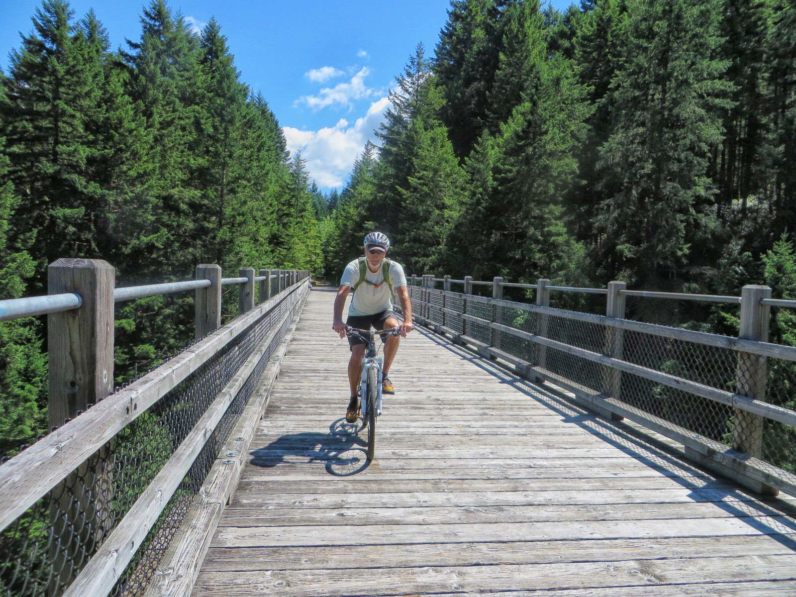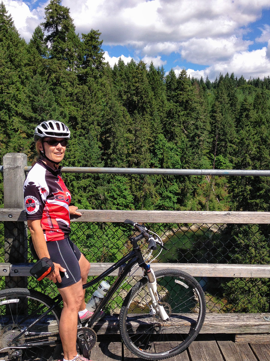 On June 30th we took the Vesuvius Ferry over to Crofton and drove south to the town of Lake Cowichan. Here we rode our bikes on the Cowichan Valley Trail all the way to the south end of Shawnigan Lake. The trail follows the gentle grade of the former turn of the century CN railway line that served pioneer logging and settlement communities. It was a pleasant ride through the trees and over eight trestles, with the largest one at the end called the Kinsol Trestle, here we turned around. The historic Kinsol Trestle is one of the tallest free-standing and most spectacular timber rail trestle structures in the world. At 614 feet in length and standing 145 feet above the Koksilah River, it is an incredible structure. Coming back was harder and longer than going and we were happy when we got back to the car, not sure of the mileage but it had to be at least 60 miles.