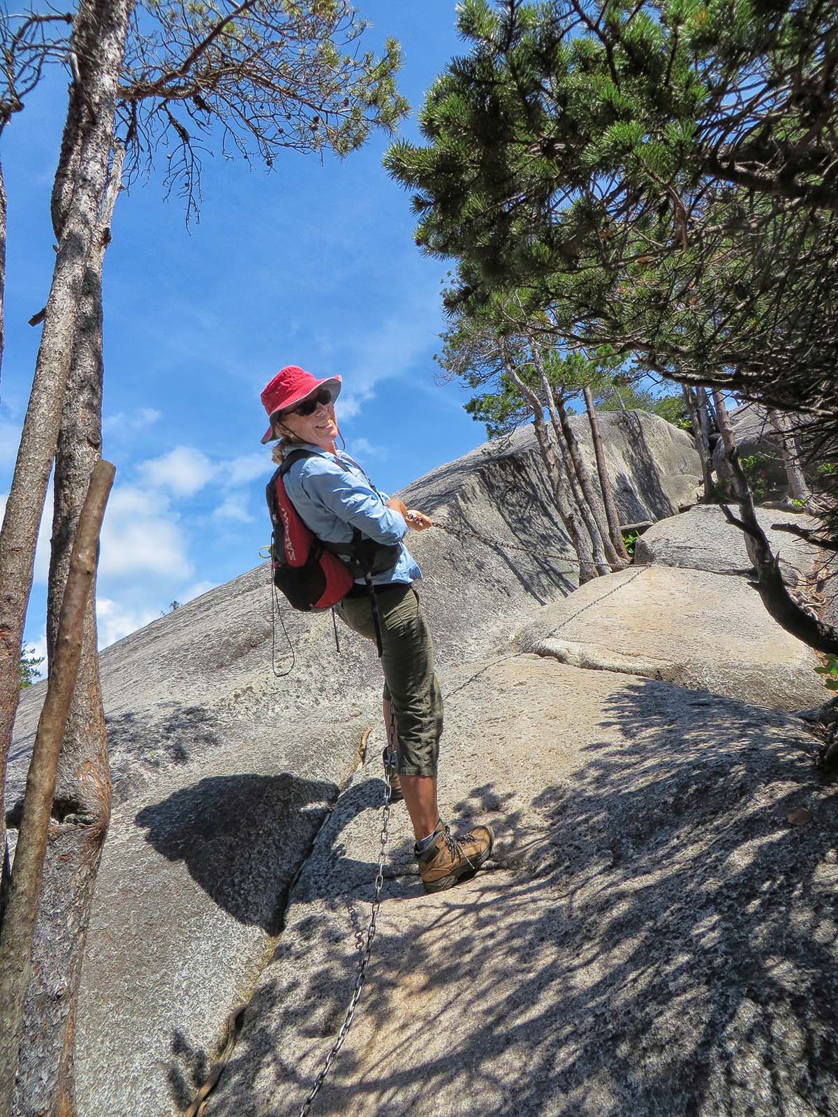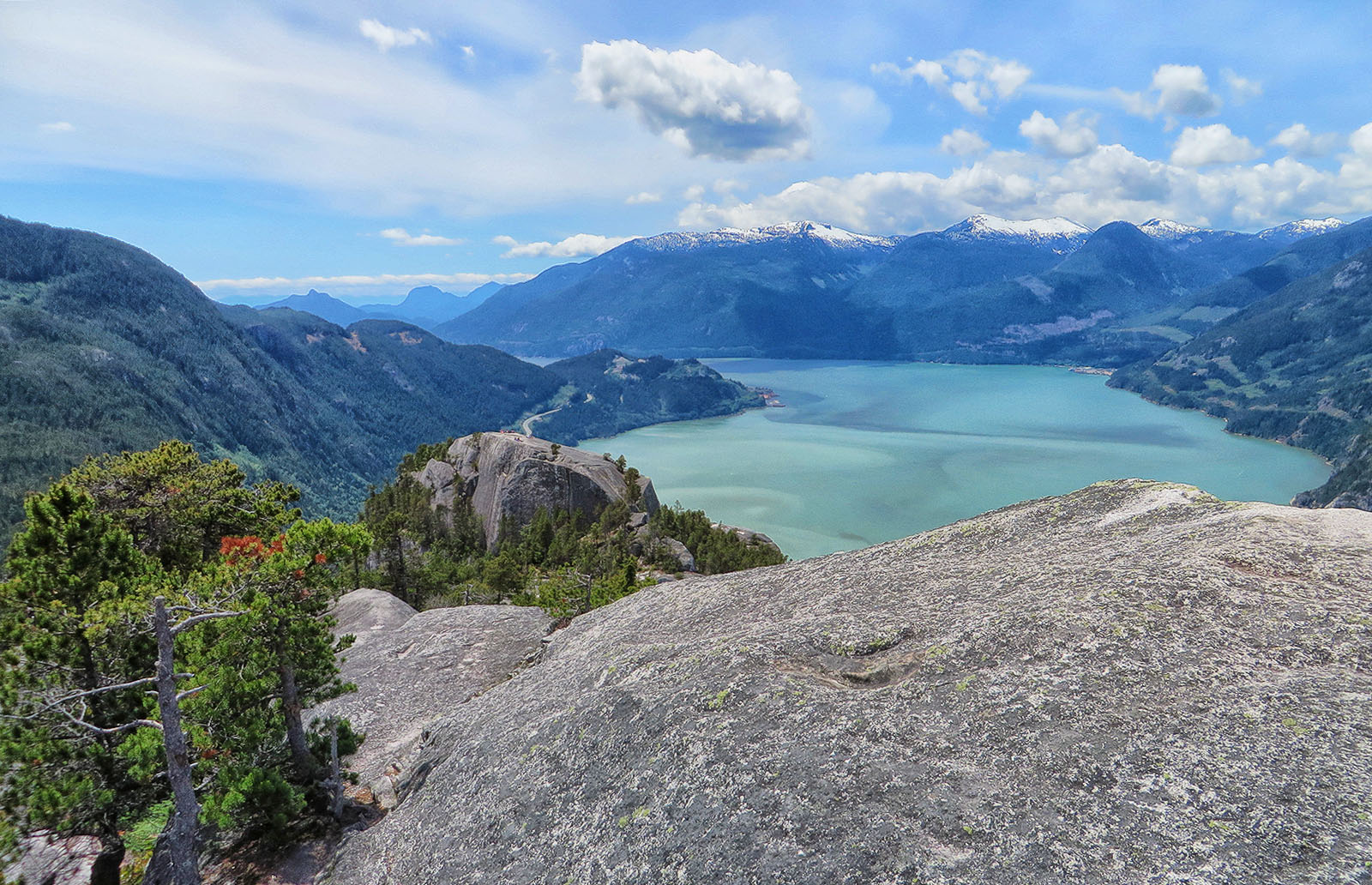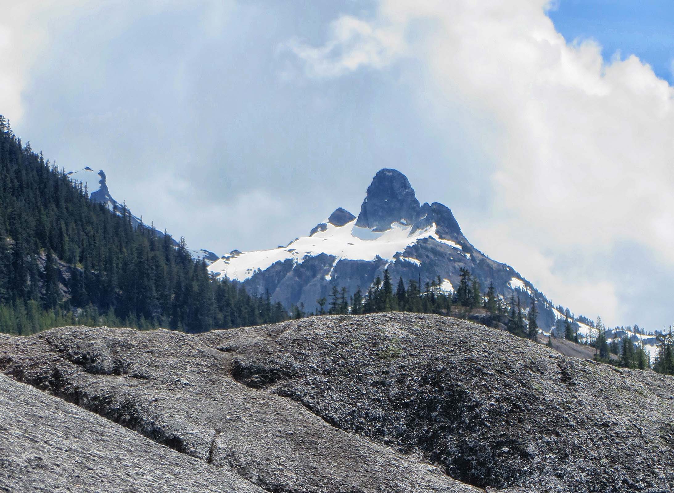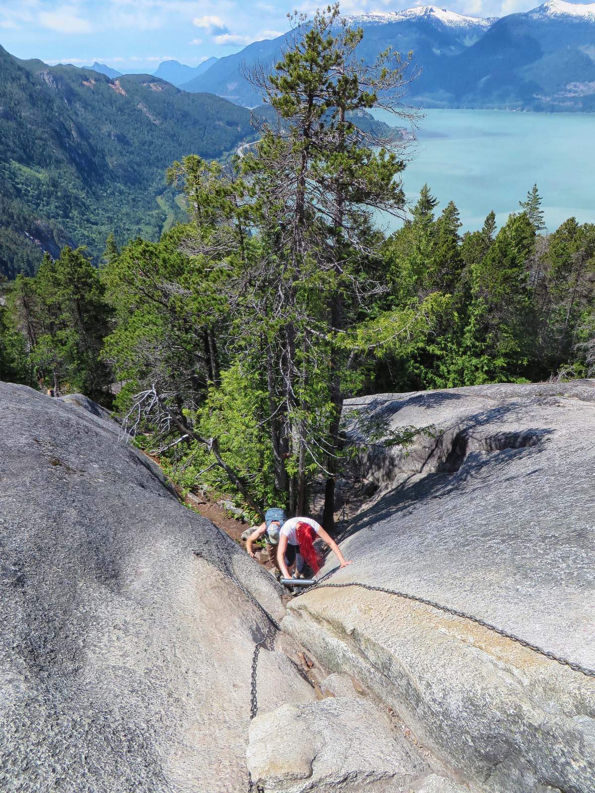 On June 9th, we drove north up the Sea to Sky Highway from West Vancouver to Squamish to hike The Stawamus Chief, well known for its climbing and hiking trails. It was a beautiful sunny day with brilliant blue sky, affording spectacular views of the coast and Howe Sound. Arriving at Shannon Falls Provincial Park around 10:30am we began our hike from the base of the falls. Shannon Falls is composed of series of cliffs, rising 1100ft, making it the third largest falls in the province. The hike to the First Peak was through the beautiful forest of Hemlocks and Douglas Firs, and then ascending steep rocky cliffs to the top, at (610m) 2001ft. We enjoyed wonderful 360 degree views of the mountains and Howe Sound below. Back to the trail we continued on to the Second Peak with even steeper rocky cliffs where we used chains and ladders to help pull us up the cliff face. On the Second Peak at (655m) 2150ft, we stayed and ate lunch with the chipmunks who would not leave me alone, and took in the wonderful views. Then it was on to the Third Peak, passing by a rock ledge where the climbers rappel down hundreds of feet to the base of the mountain. The Third Peak at (702m) 2300ft, was the final peak, and we could see Mt Garibaldi rising high above the valley covered in clouds, and great views of Squamish nestled at the end of Howe Sound.