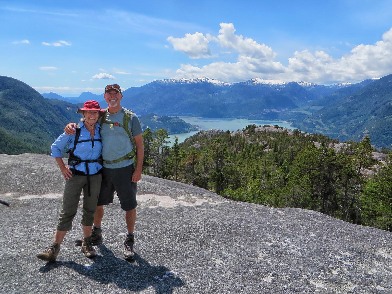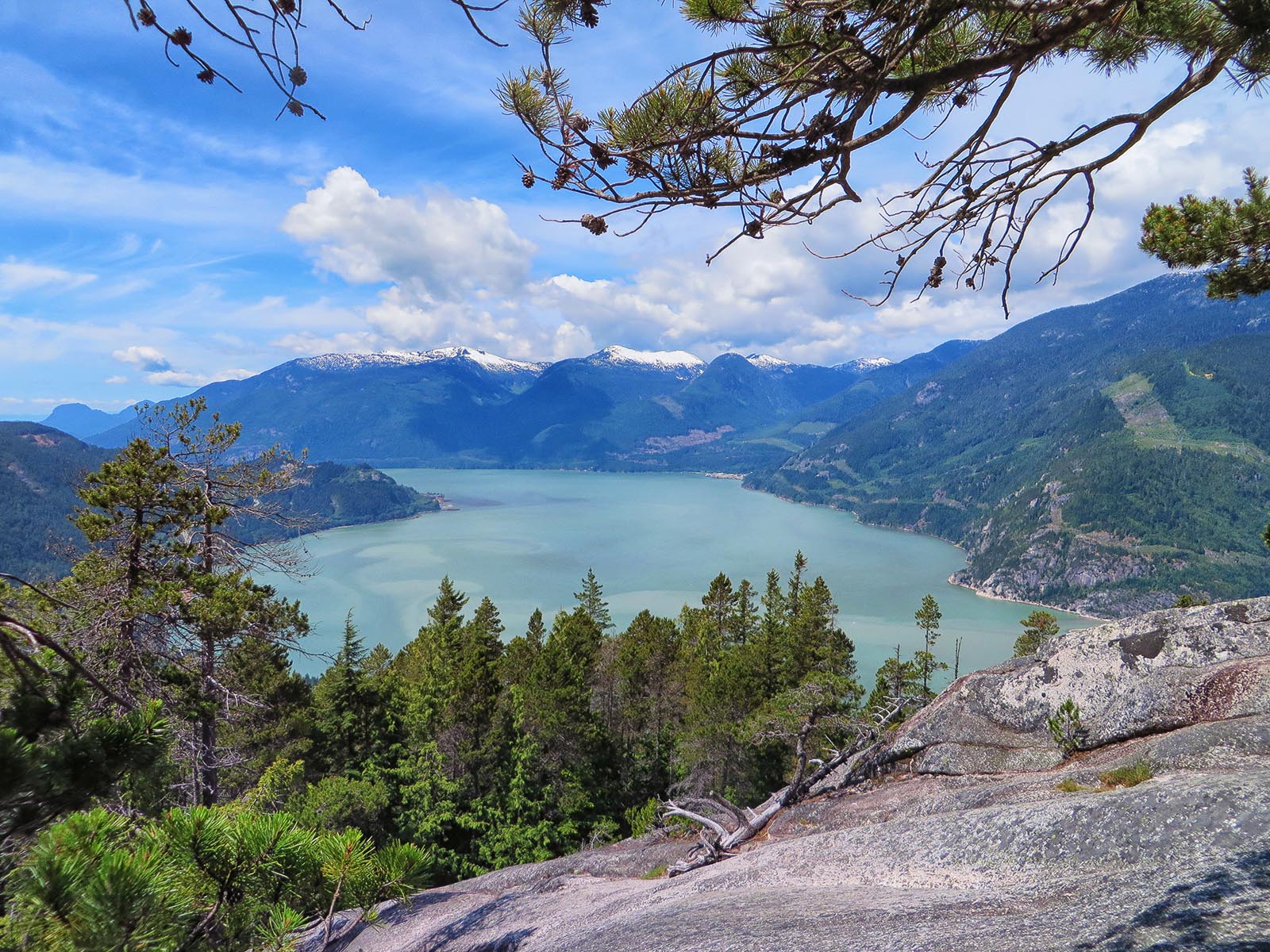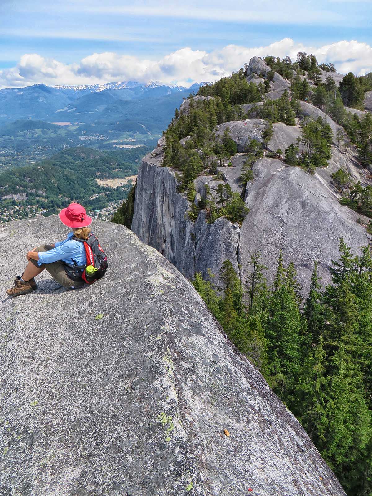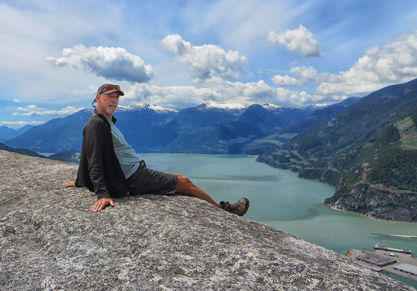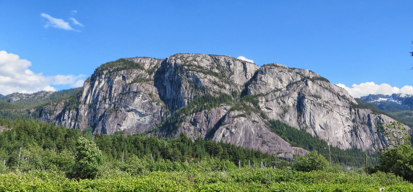 On June 9th, we drove north up the Sea to Sky Highway from West Vancouver to Squamish to hike The Stawamus Chief, well known for its climbing and hiking trails. It was a beautiful sunny day with brilliant blue sky, affording spectacular views of the coast and Howe Sound. Arriving at Shannon Falls Provincial Park around 10:30am we began our hike from the base of the falls. Shannon Falls is composed of series of cliffs, rising 1100ft, making it the third largest falls in the province. The hike to the First Peak was through the beautiful forest of Hemlocks and Douglas Firs, and then ascending steep rocky cliffs to the top, at (610m) 2001ft. We enjoyed wonderful 360 degree views of the mountains and Howe Sound below. Back to the trail we continued on to the Second Peak with even steeper rocky cliffs where we used chains and ladders to help pull us up the cliff face. On the Second Peak at (655m) 2150ft, we stayed and ate lunch with the chipmunks who would not leave me alone, and took in the wonderful views. Then it was on to the Third Peak, passing by a rock ledge where the climbers rappel down hundreds of feet to the base of the mountain. The Third Peak at (702m) 2300ft, was the final peak, and we could see Mt Garibaldi rising high above the valley covered in clouds, and great views of Squamish nestled at the end of Howe Sound.