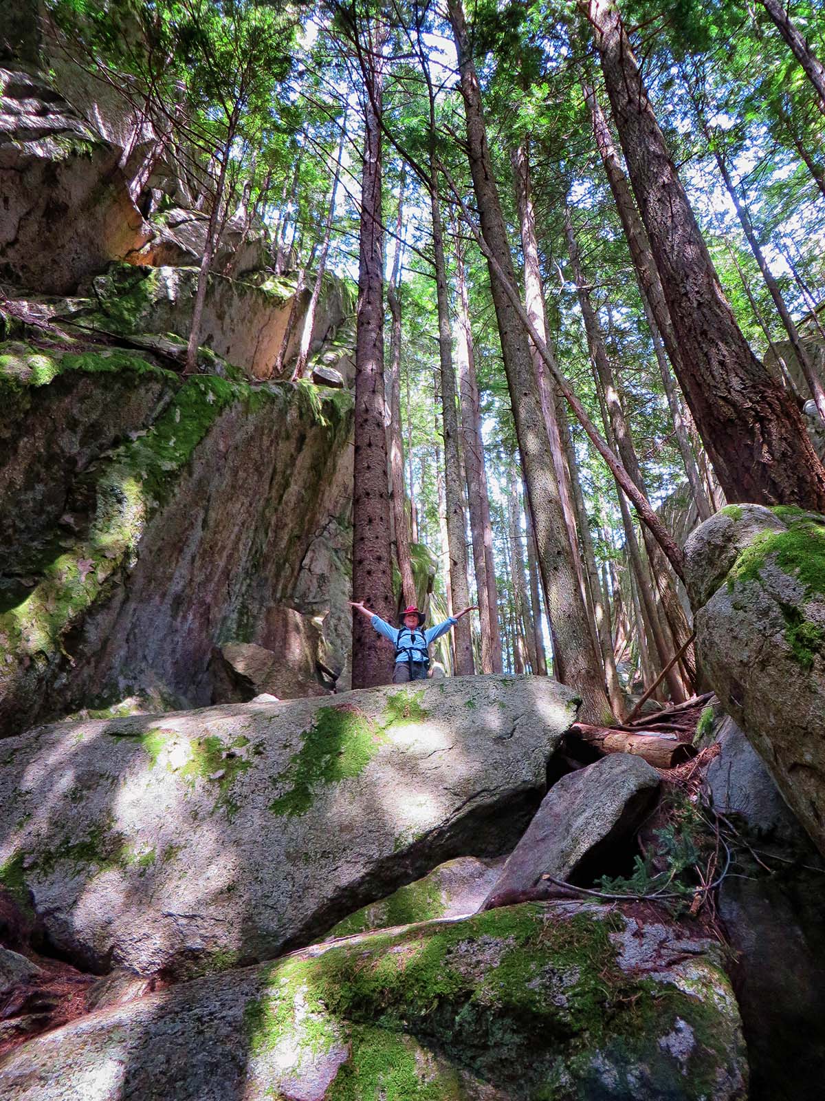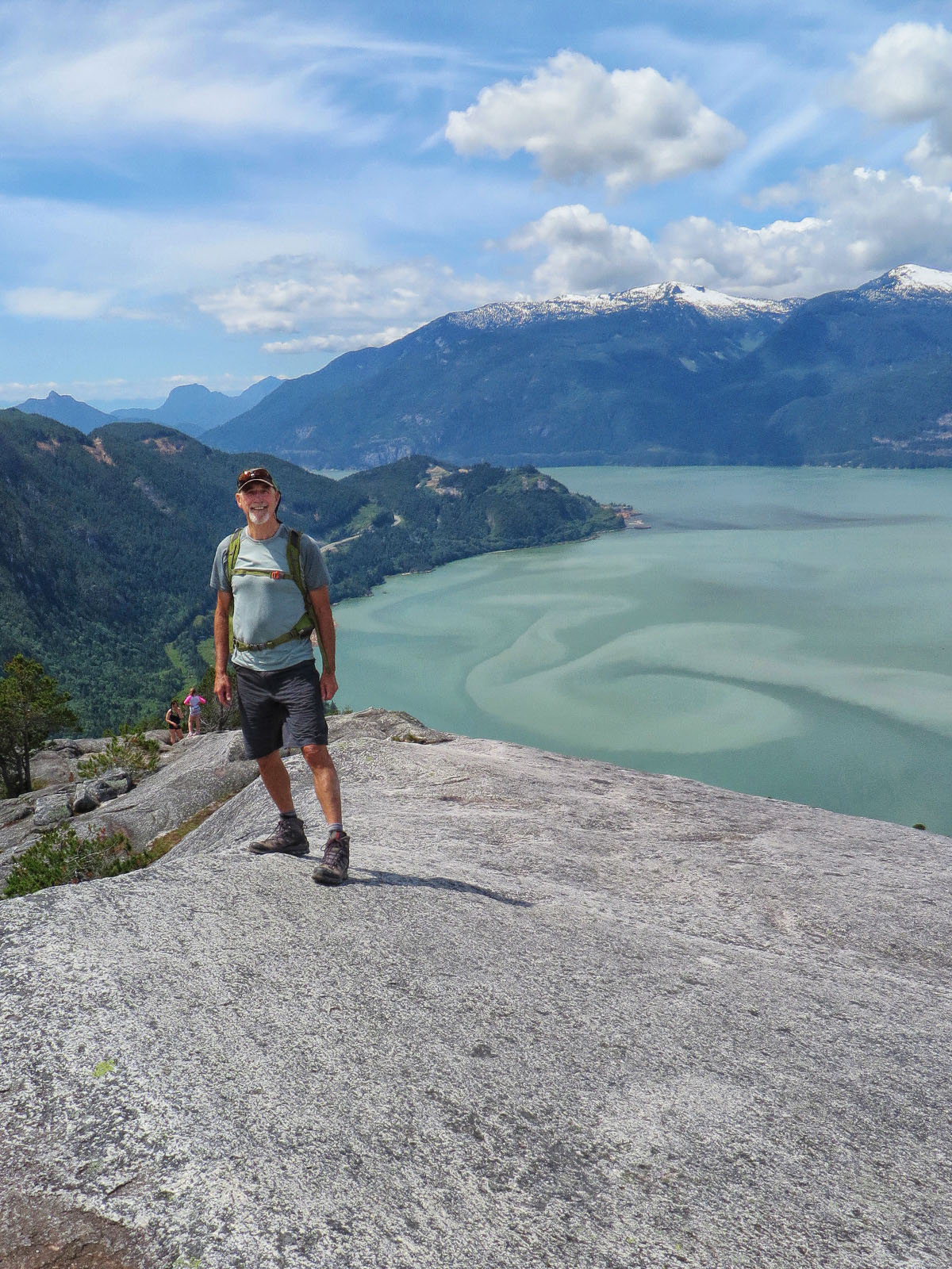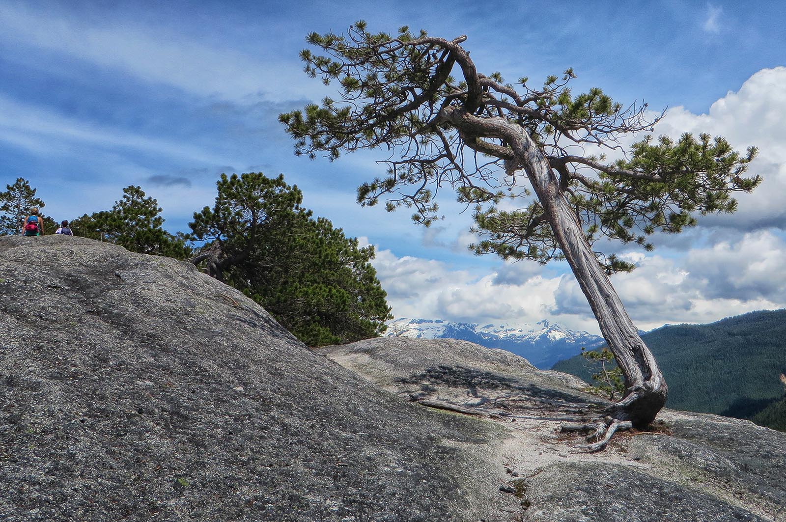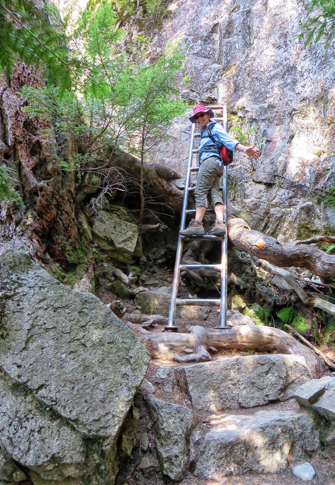 On June 9th, we drove north up the Sea to Sky Highway from West Vancouver to Squamish to hike The Stawamus Chief, well known for its climbing and hiking trails. It was a beautiful sunny day with brilliant blue sky, affording spectacular views of the coast and Howe Sound. Arriving at Shannon Falls Provincial Park around 10:30am we began our hike from the base of the falls. Shannon Falls is composed of series of cliffs, rising 1100ft, making it the third largest falls in the province. The hike to the First Peak was through the beautiful forest of Hemlocks and Douglas Firs, and then ascending steep rocky cliffs to the top, at (610m) 2001ft. We enjoyed wonderful 360 degree views of the mountains and Howe Sound below. Back to the trail we continued on to the Second Peak with even steeper rocky cliffs where we used chains and ladders to help pull us up the cliff face. On the Second Peak at (655m) 2150ft, we stayed and ate lunch with the chipmunks who would not leave me alone, and took in the wonderful views. Then it was on to the Third Peak, passing by a rock ledge where the climbers rappel down hundreds of feet to the base of the mountain. The Third Peak at (702m) 2300ft, was the final peak, and we could see Mt Garibaldi rising high above the valley covered in clouds, and great views of Squamish nestled at the end of Howe Sound.