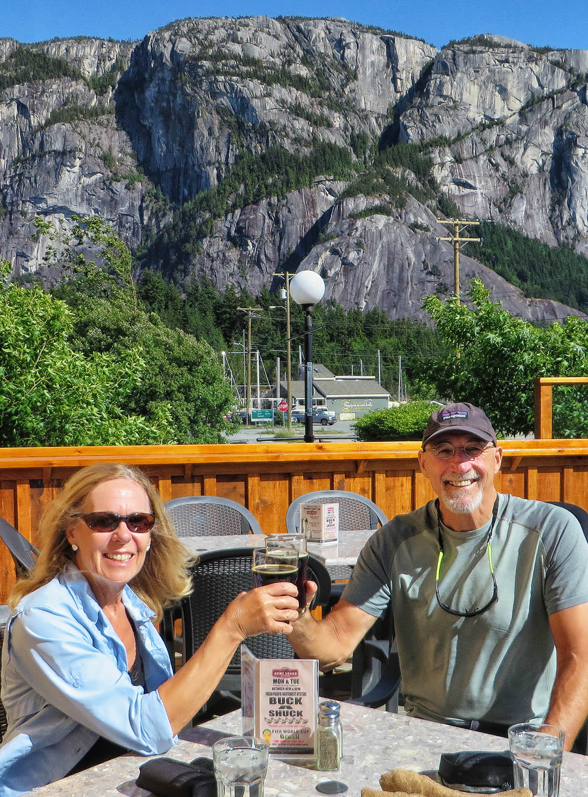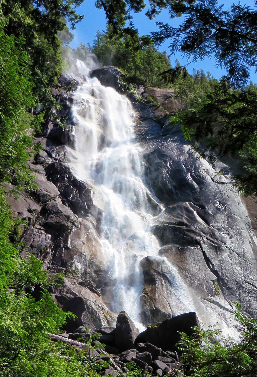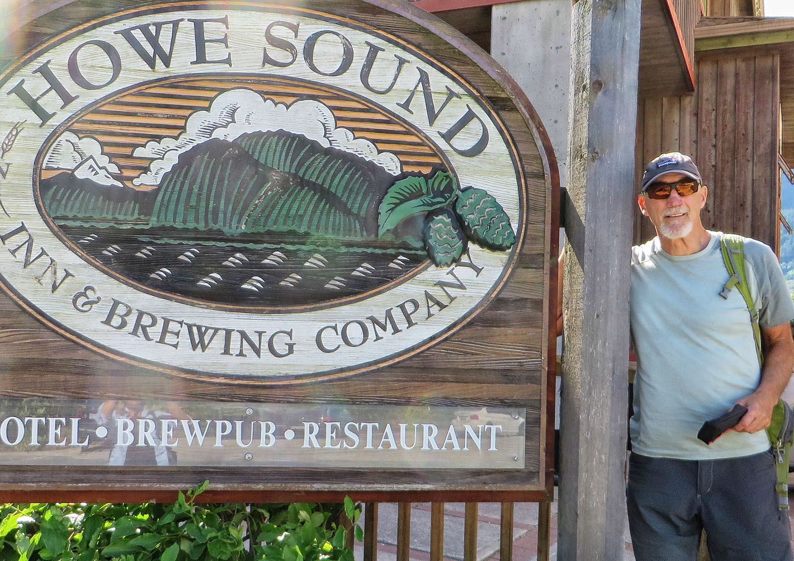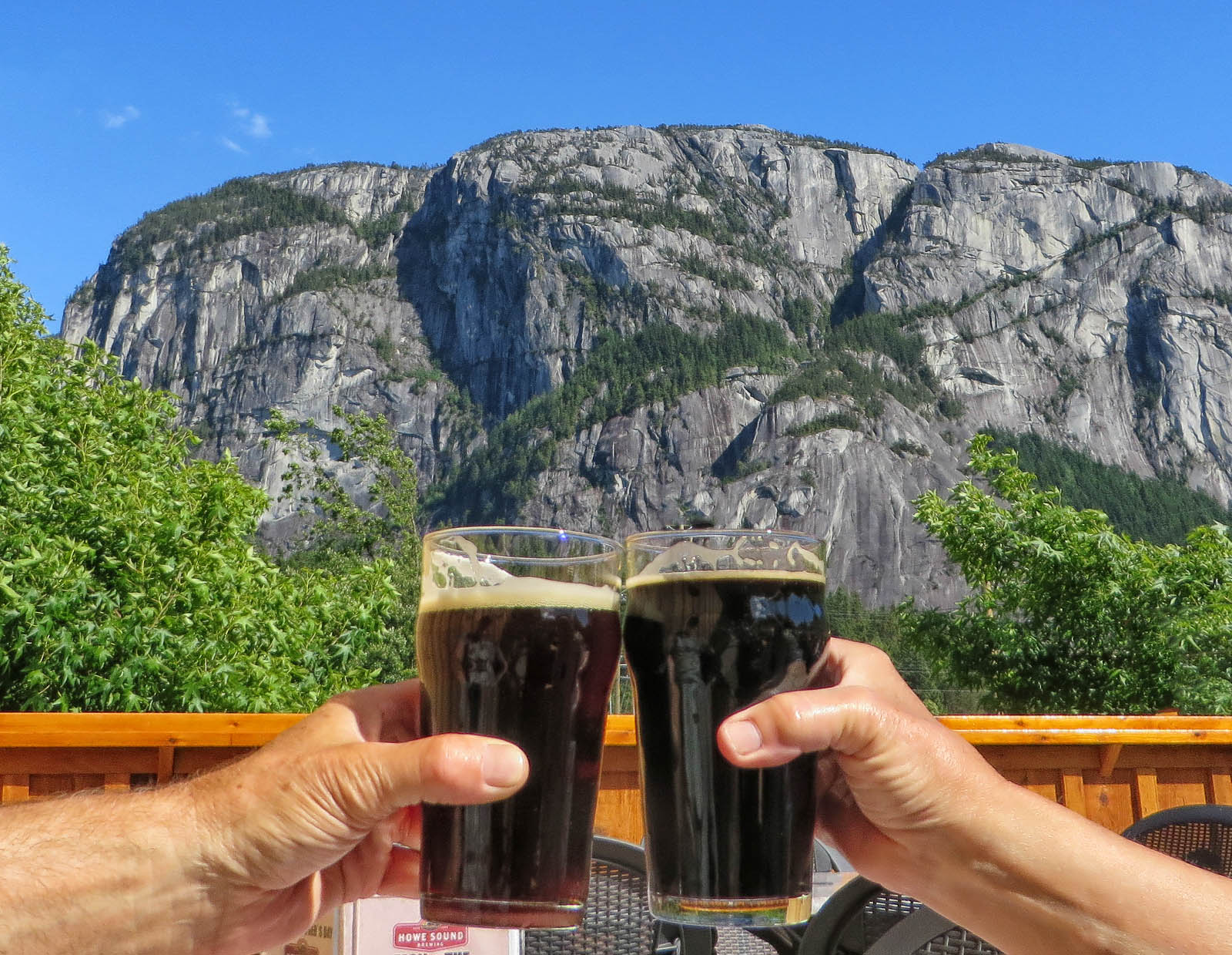 The trail down was different than the one we took coming up so we did not have to descend the chains and ladders. However, it was very steep with plenty of rocks and roots to trip you up or down! Finally we made it back to Shannon Falls where we took more photos of the water falls glistening in the sunshine. Driving into Squamish for some number one recovery drink at the Howe Sound Brewery, we had a great overall view of the (700m) 2296ft granite monolith, the Stawamus Chief. It is the second largest granite monolith in the world and provides a good nesting habitat for the Peregrine Falcon, which we did not see today. A spectacular day once again in beautiful British Columbia.