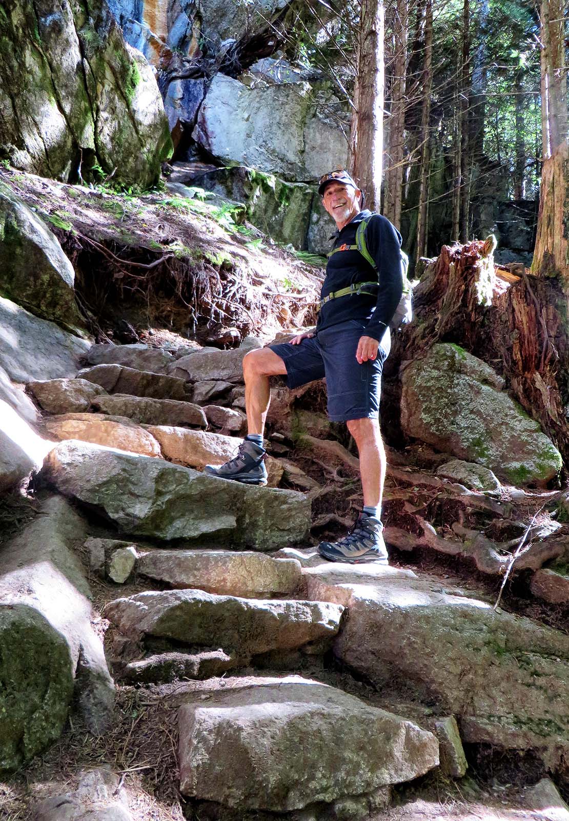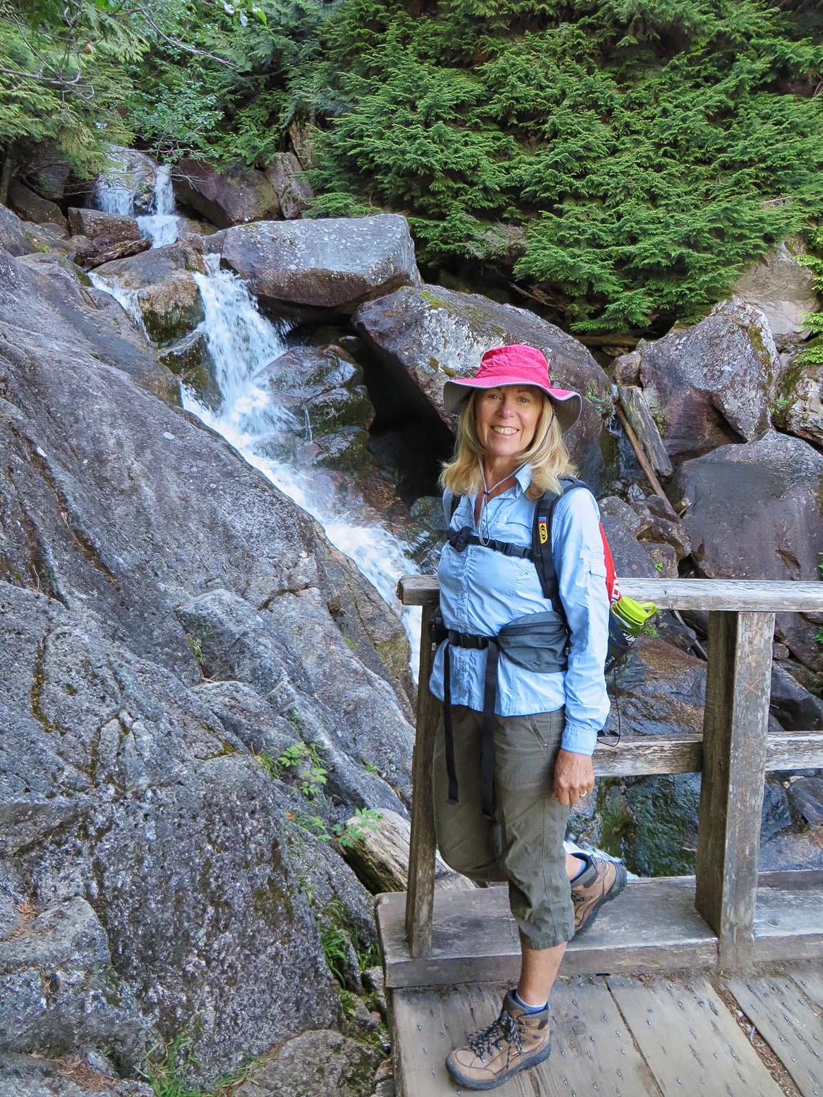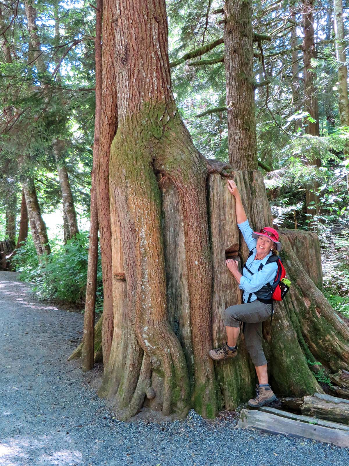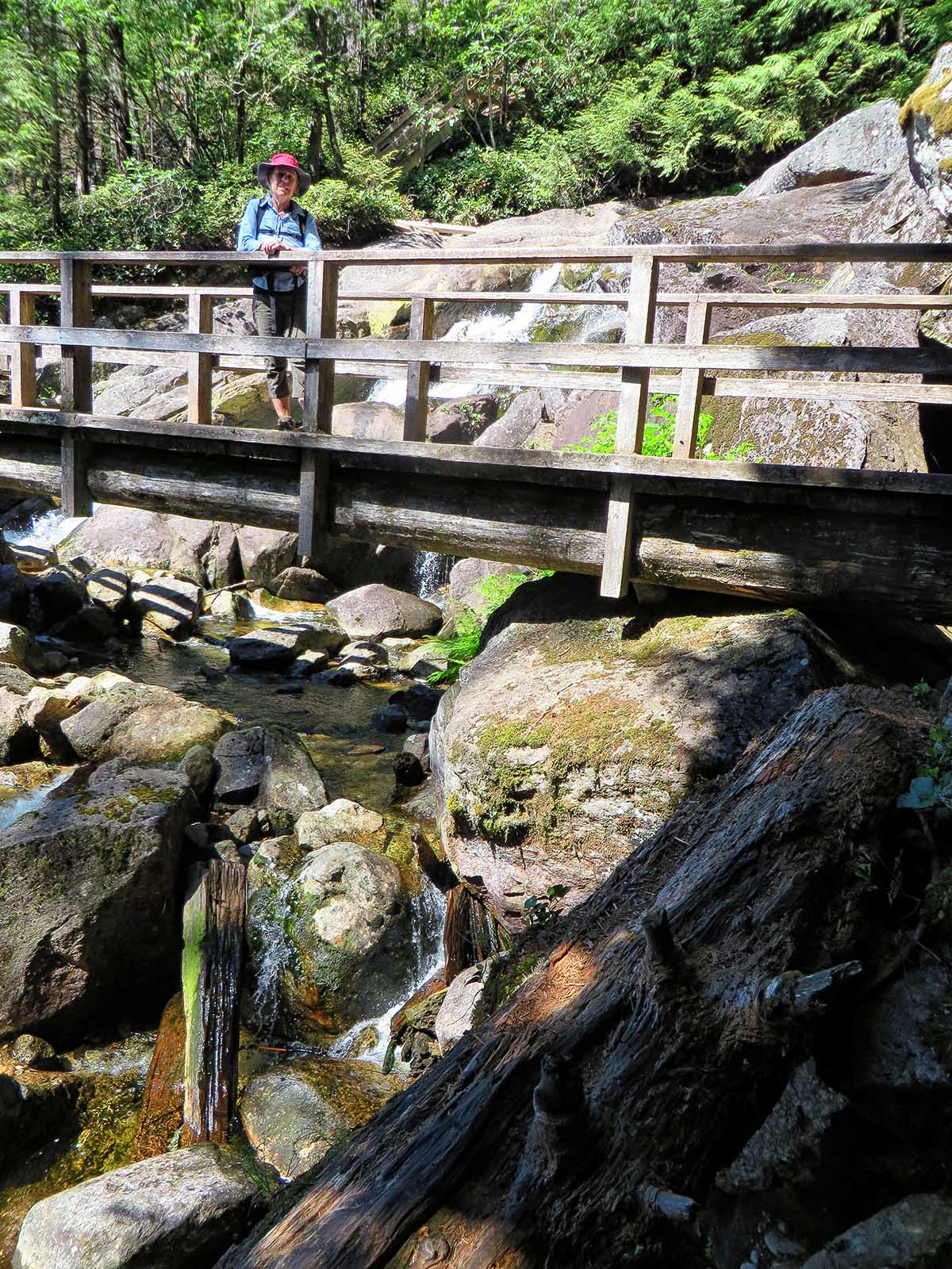 The trail down was different than the one we took coming up so we did not have to descend the chains and ladders. However, it was very steep with plenty of rocks and roots to trip you up or down! Finally we made it back to Shannon Falls where we took more photos of the water falls glistening in the sunshine. Driving into Squamish for some number one recovery drink at the Howe Sound Brewery, we had a great overall view of the (700m) 2296ft granite monolith, the Stawamus Chief. It is the second largest granite monolith in the world and provides a good nesting habitat for the Peregrine Falcon, which we did not see today. A spectacular day once again in beautiful British Columbia.