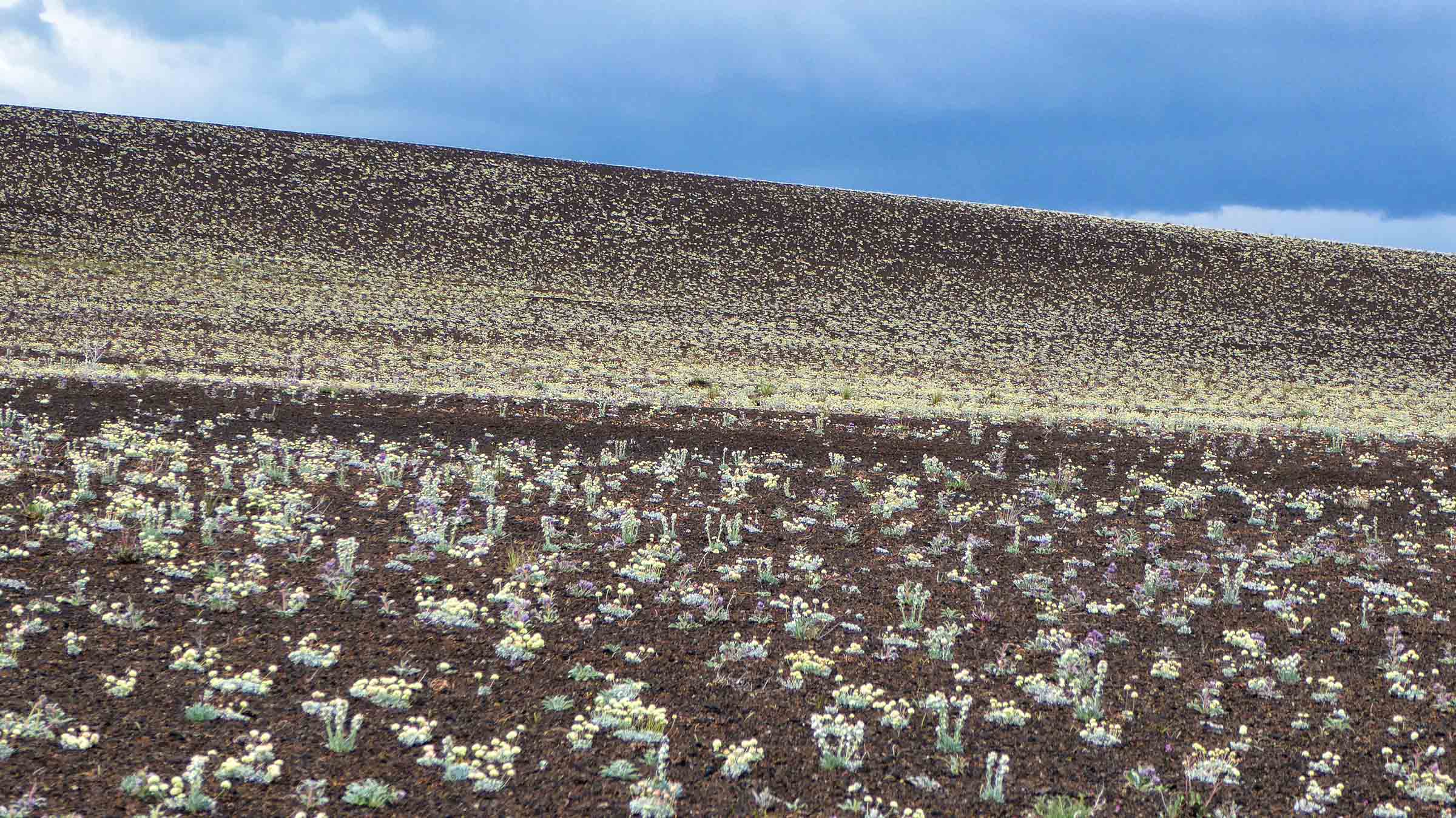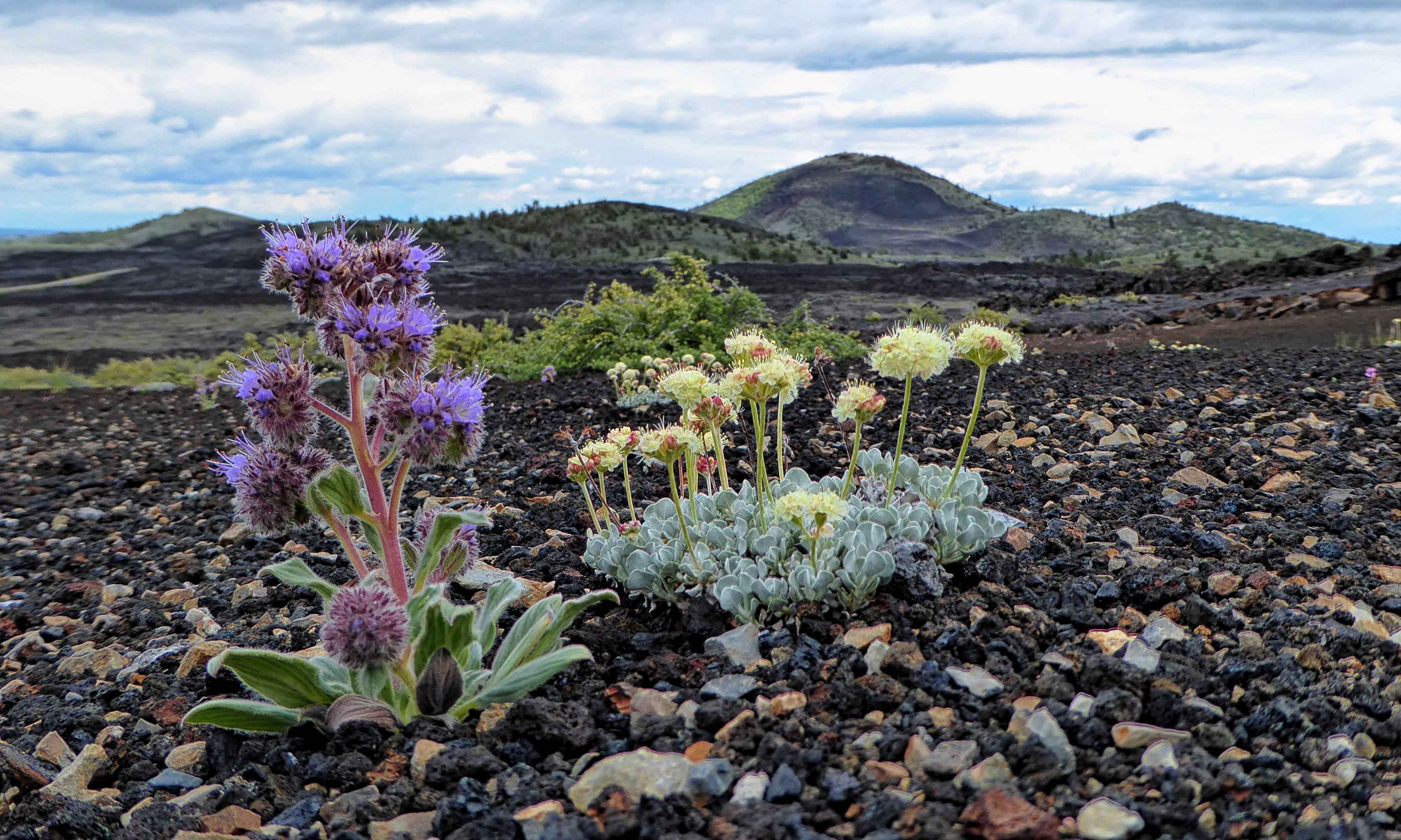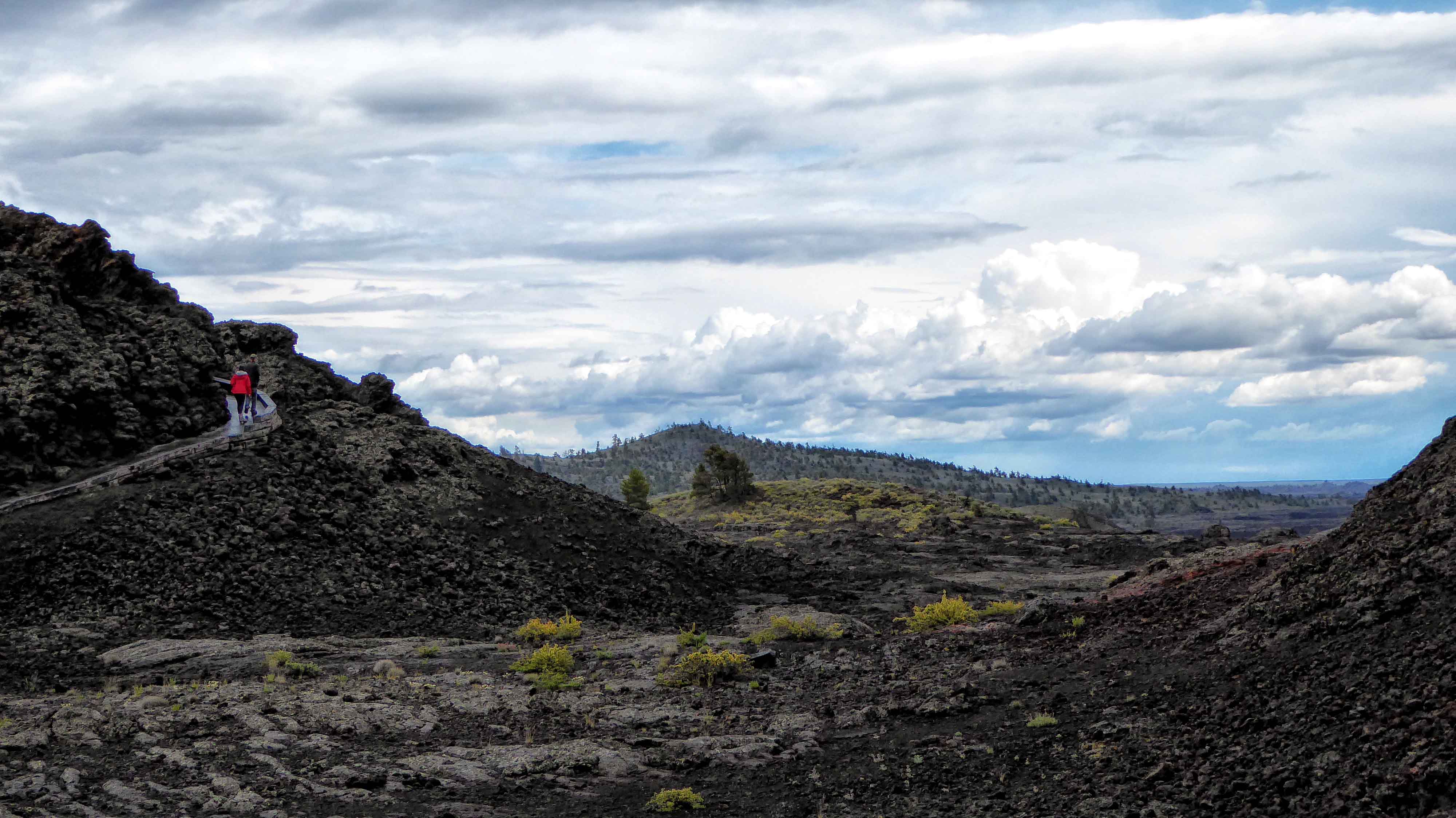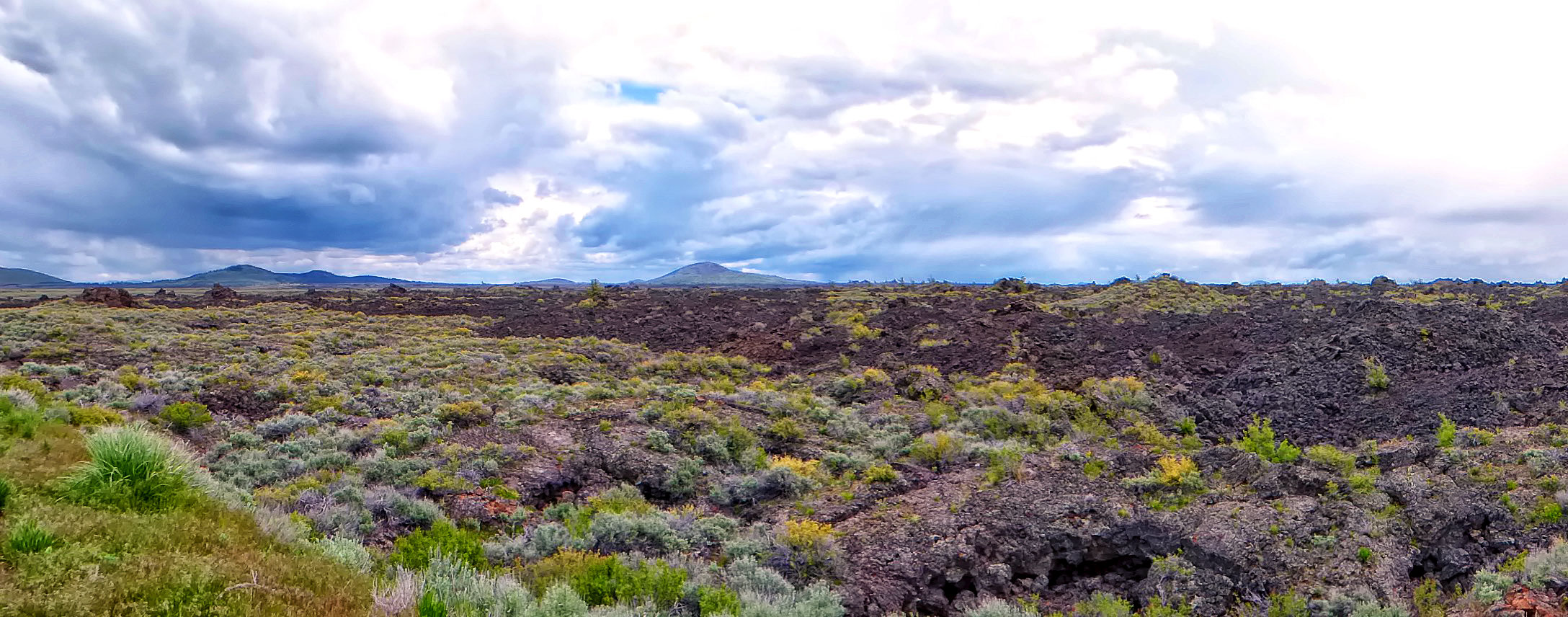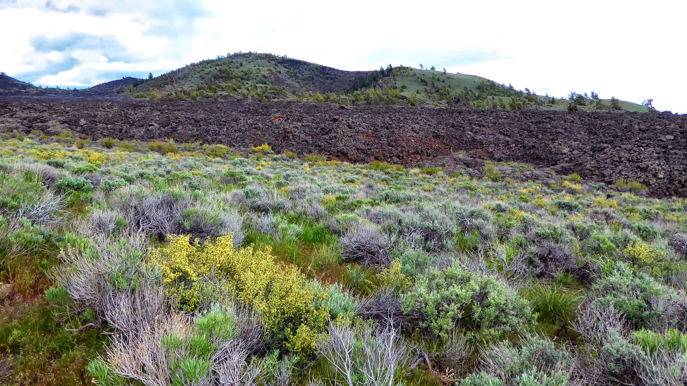 On our way back we drove out to see the Craters of the Moon National Monument and Preserve, established in 1924, and encompass three major lava fields that lie along the Great Rift of Idaho, where lava flowed from a series of deep fissures. Beginning 15,000 years ago lava welled up from the Great Rift to produce this vast ocean of rock. We stopped at the Visitor Center at 5,900′, and picked up a map of the area, there is only one road to follow, a Loop Drive, 7 miles long. We stopped at the Devils Orchard, an island-like lava fragments stand in a sea of cinders. The Inferno Cone Viewpoint where we walked to look down the cone of a volcano. The landscape was definitely barren, resembling a moonscape, but from the the blackness of the hills beautiful wild flowers were in bloom.