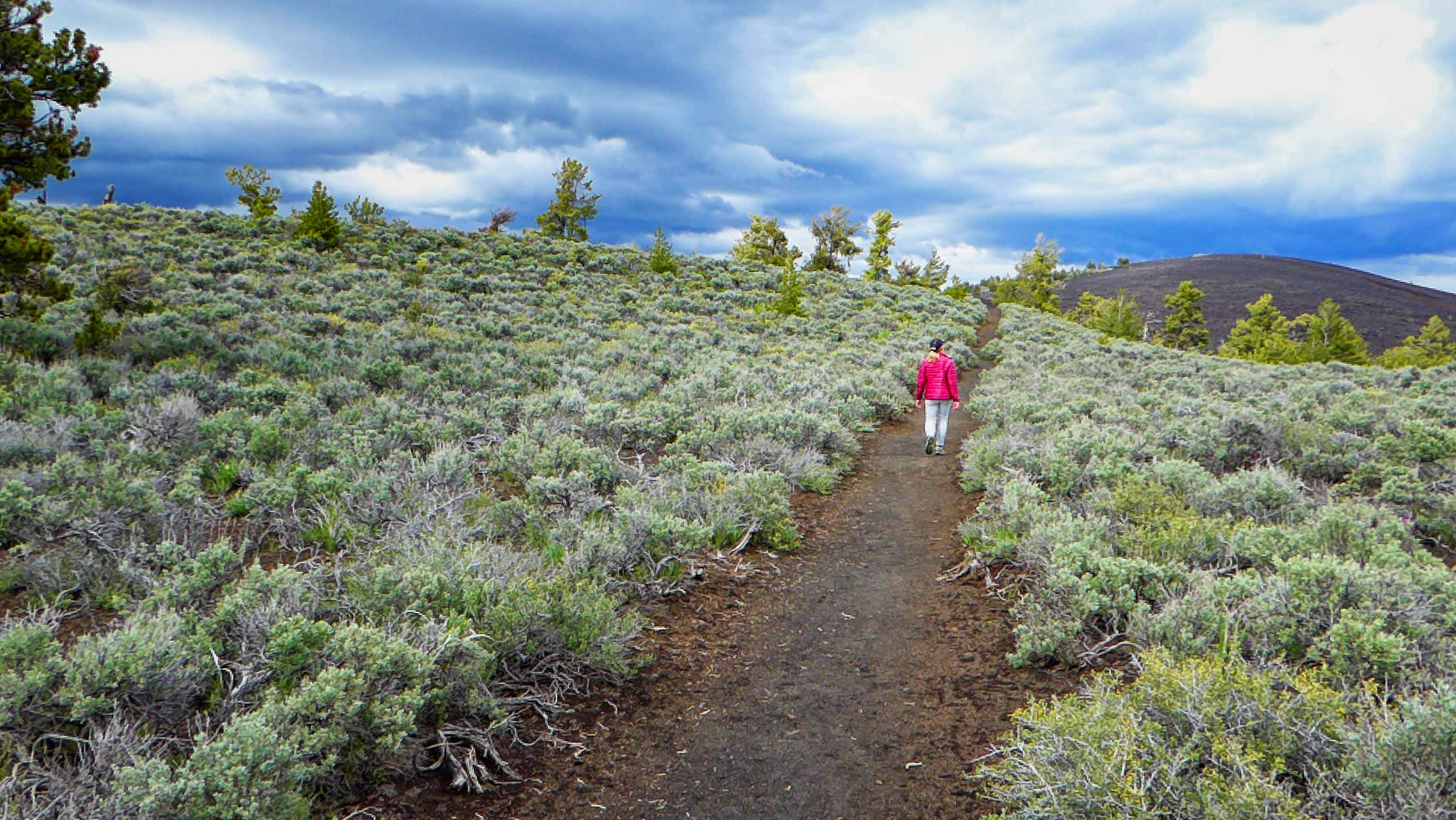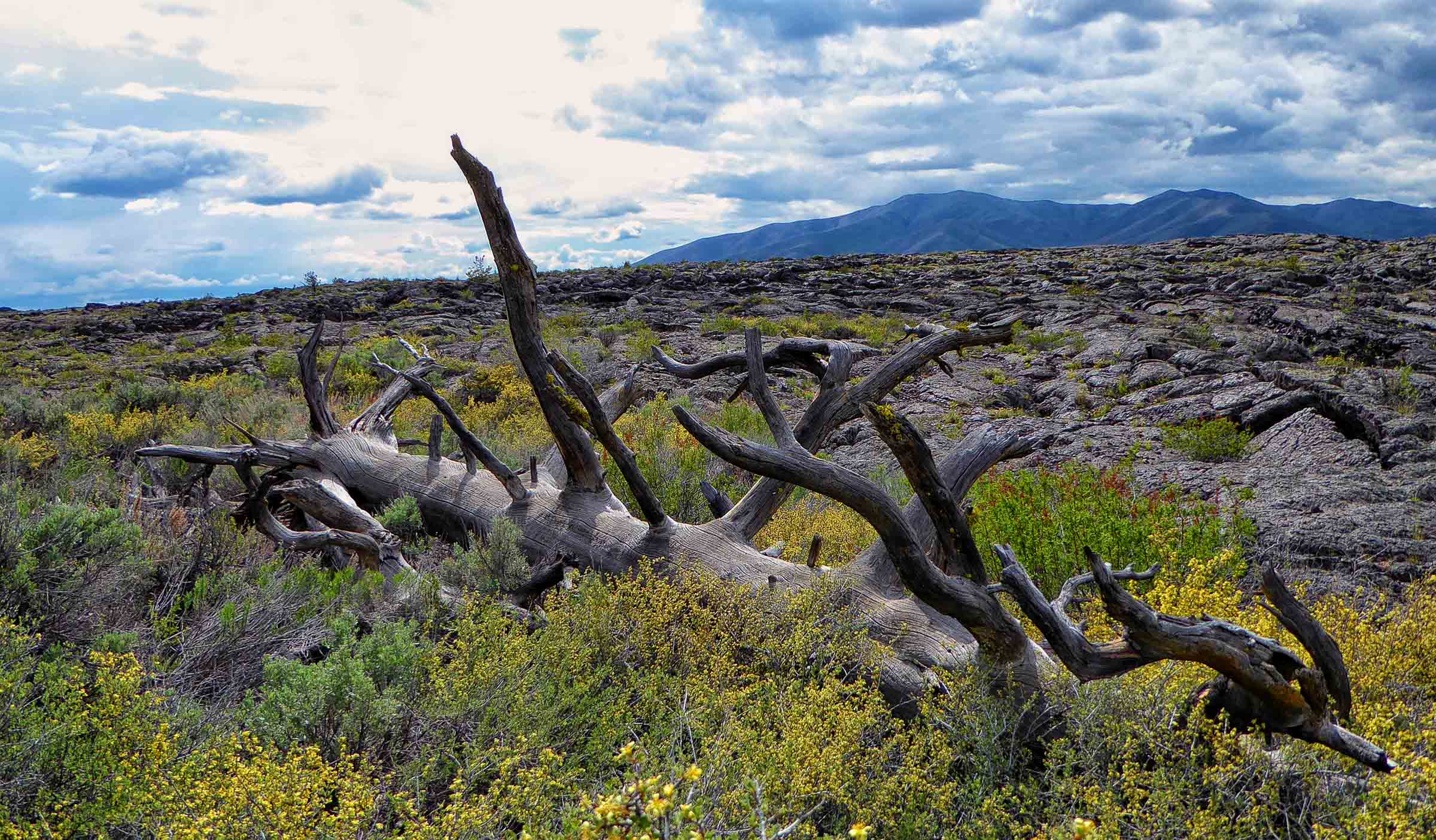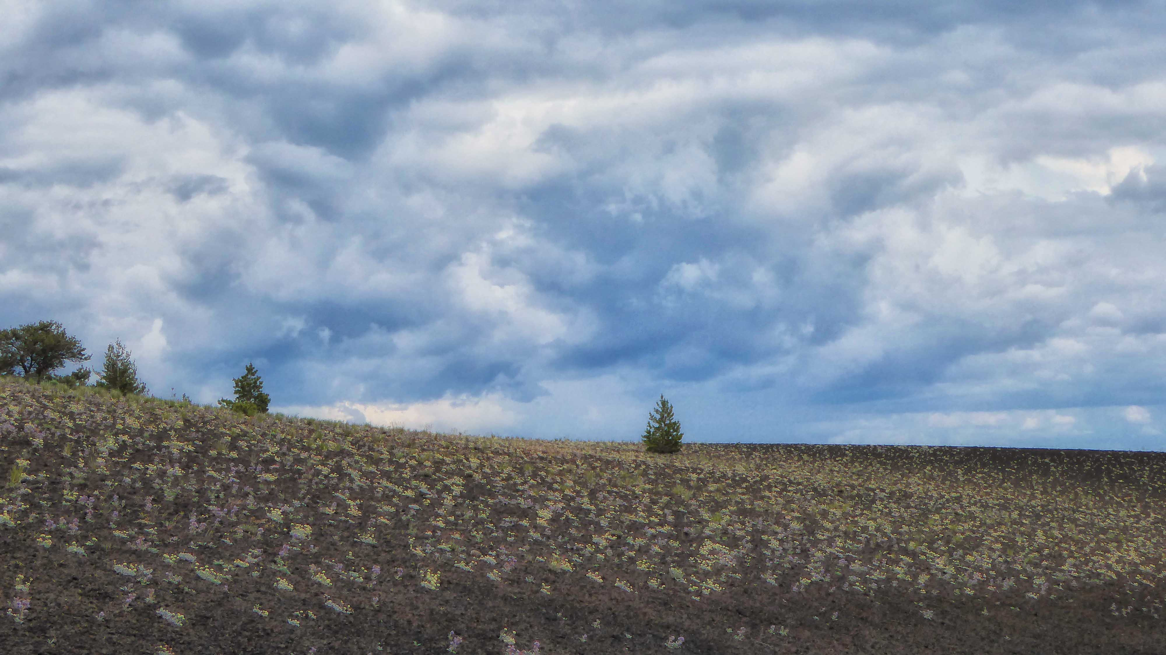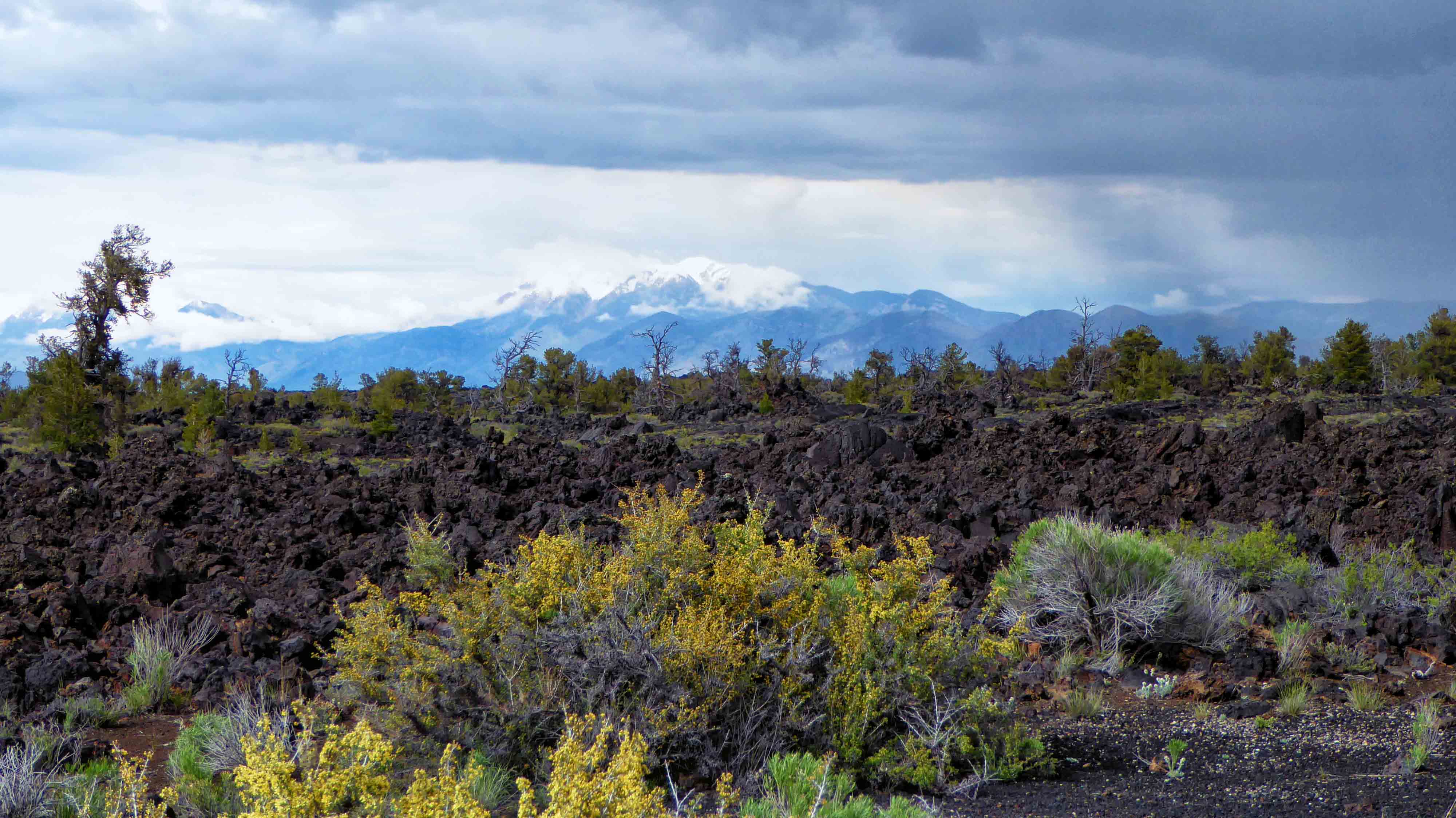 On our way back we drove out to see the Craters of the Moon National Monument and Preserve, established in 1924, and encompass three major lava fields that lie along the Great Rift of Idaho, where lava flowed from a series of deep fissures. Beginning 15,000 years ago lava welled up from the Great Rift to produce this vast ocean of rock. We stopped at the Visitor Center at 5,900′, and picked up a map of the area, there is only one road to follow, a Loop Drive, 7 miles long. We stopped at the Devils Orchard, an island-like lava fragments stand in a sea of cinders. The Inferno Cone Viewpoint where we walked to look down the cone of a volcano. The landscape was definitely barren, resembling a moonscape, but from the the blackness of the hills beautiful wild flowers were in bloom.
