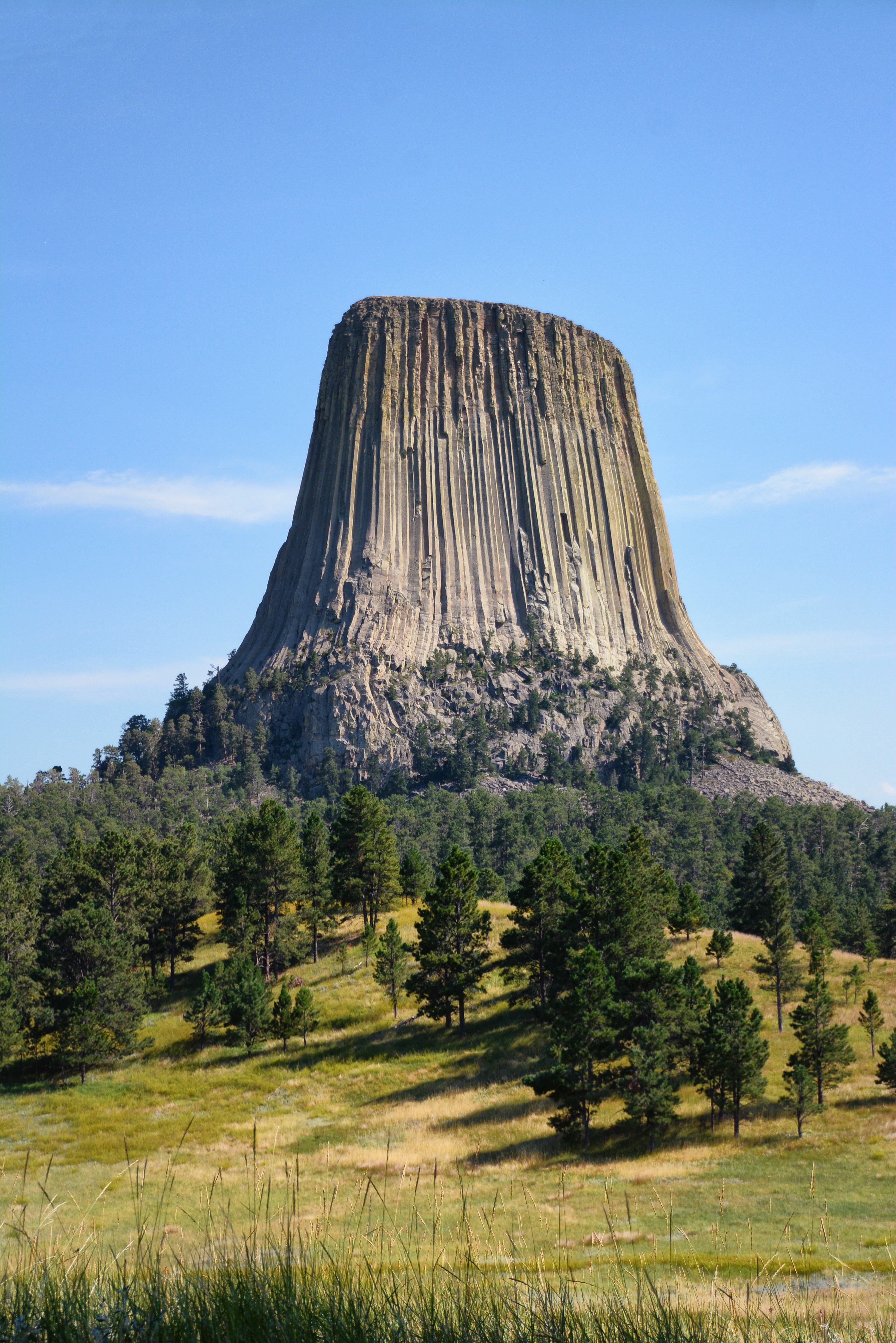 Sunday, August 10th, we drove the 121 mile round trip to Devils Tower in Wyoming. In 1906, President Theodore Roosevelt created Devils Tower National Monument, the first national monument. It was established as our first national monument because of its scientific and geological importance. Geologists agree that “Devils Tower was formed by an intrusion, the forcible entry of magma into or between other rock formations, of igneous material”. From miles away our first sighting of Devils Tower was magnificent, rising dramatically 1,267 feet above the surrounding terrain and the summit is 5,114 feet above sea level. When we arrived at the parking lot we went to see the Visitor Center that was built in the 1930s by the CCC, and both it’s buildings are listed on the National Register of Historic Places. Then we took the 1.3 mile walk around the base of the Tower to get closer, what makes it striking is its shape, near-vertical cliffs with regular, furrows and flattened top, the size of a football field. As we approached the Tower we noticed climbers on the sheer cliff, half way up the wall. The first climb was in 1893, it was done using a series of wooden ladders held to the mountain by pegs driven into some of the vertical cracks running between the columns. William Rogers on July 4th ascended the ladder for the first “official” climb. We could still see portions of the ladder that remain on the rock wall. It has become one of the finest traditional crack climbing areas in North America.