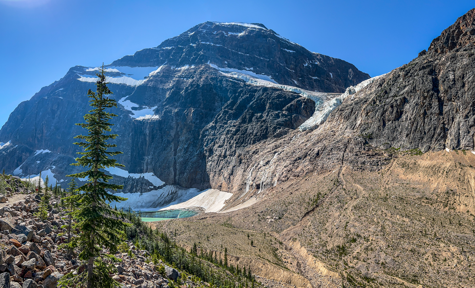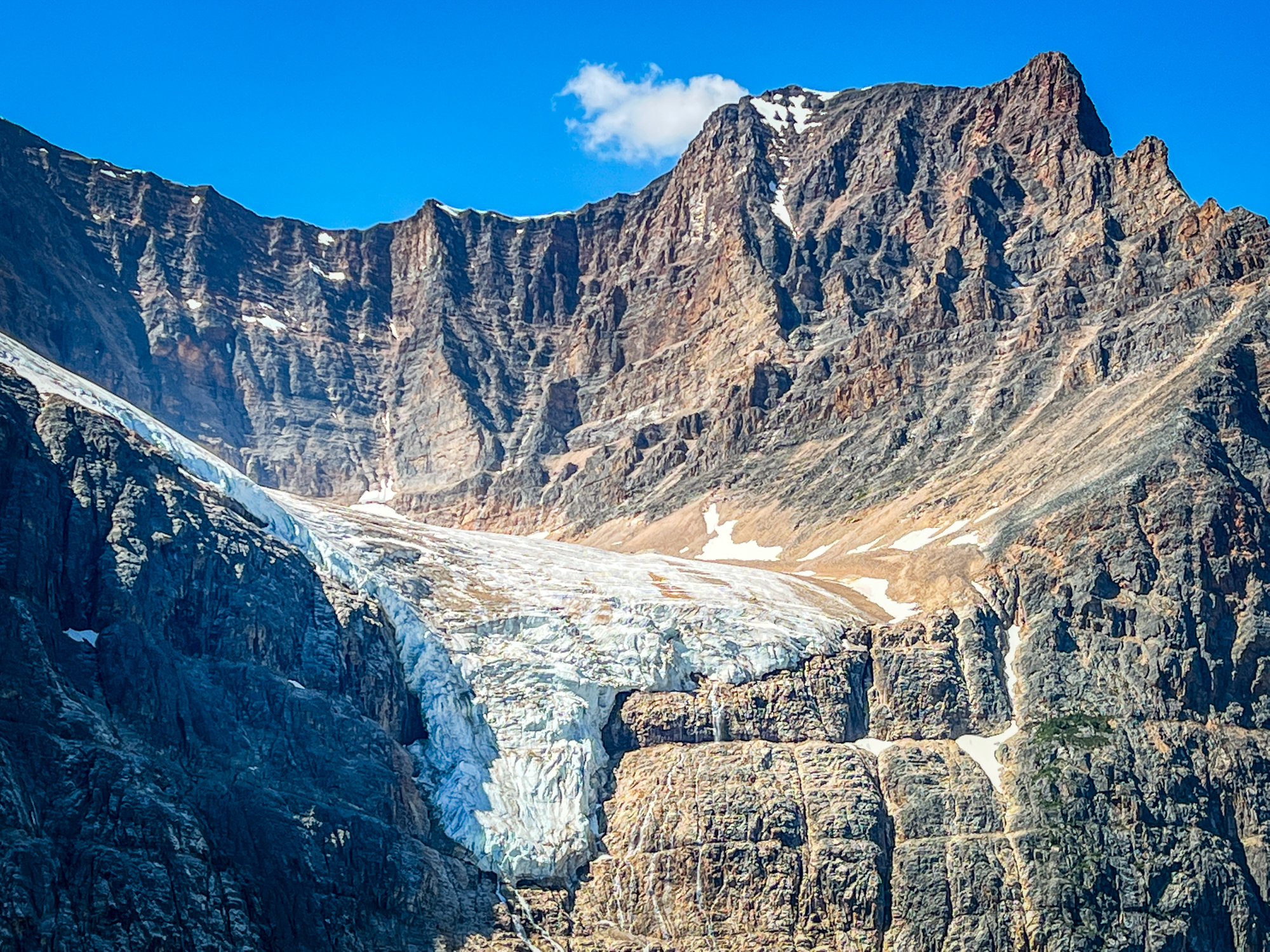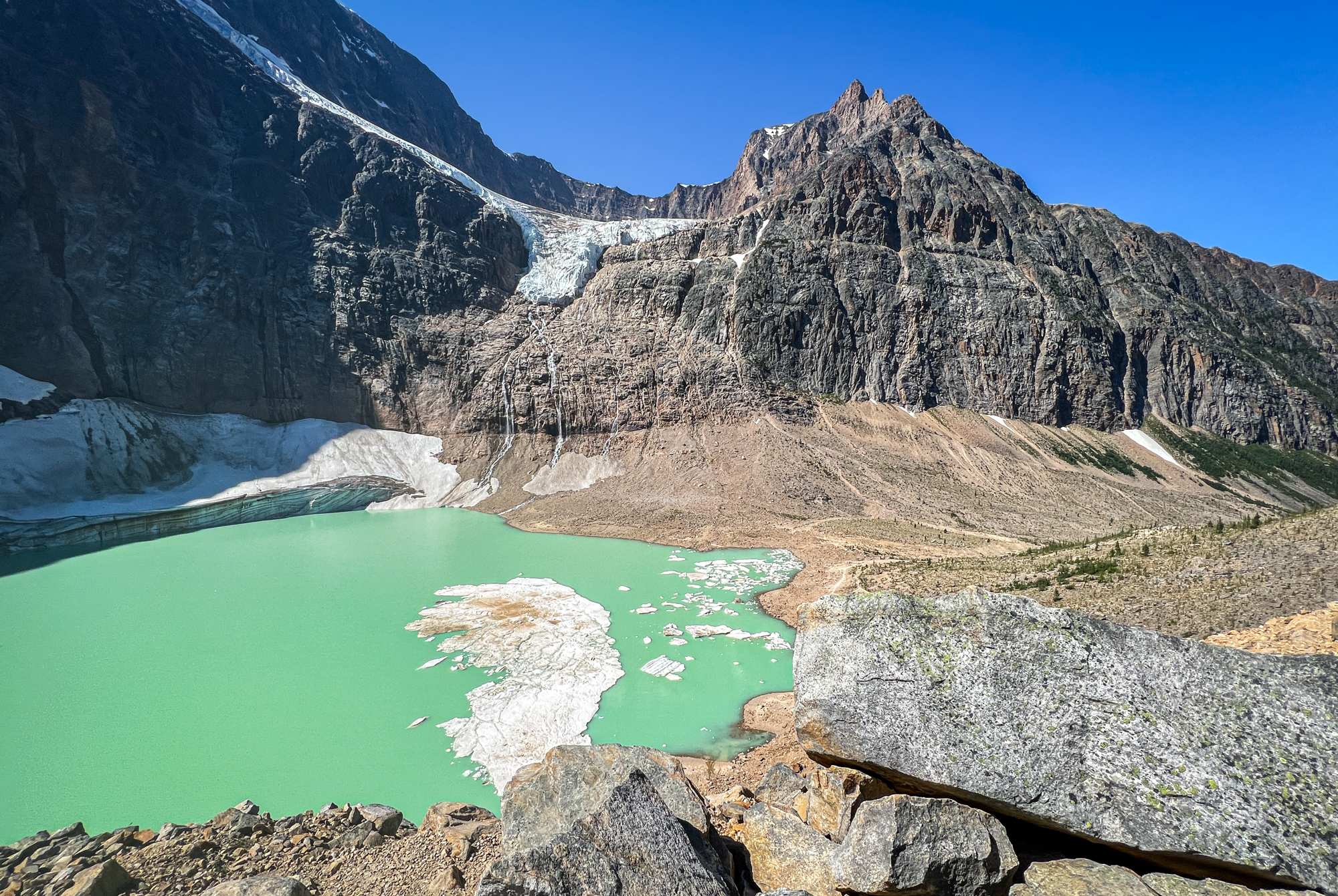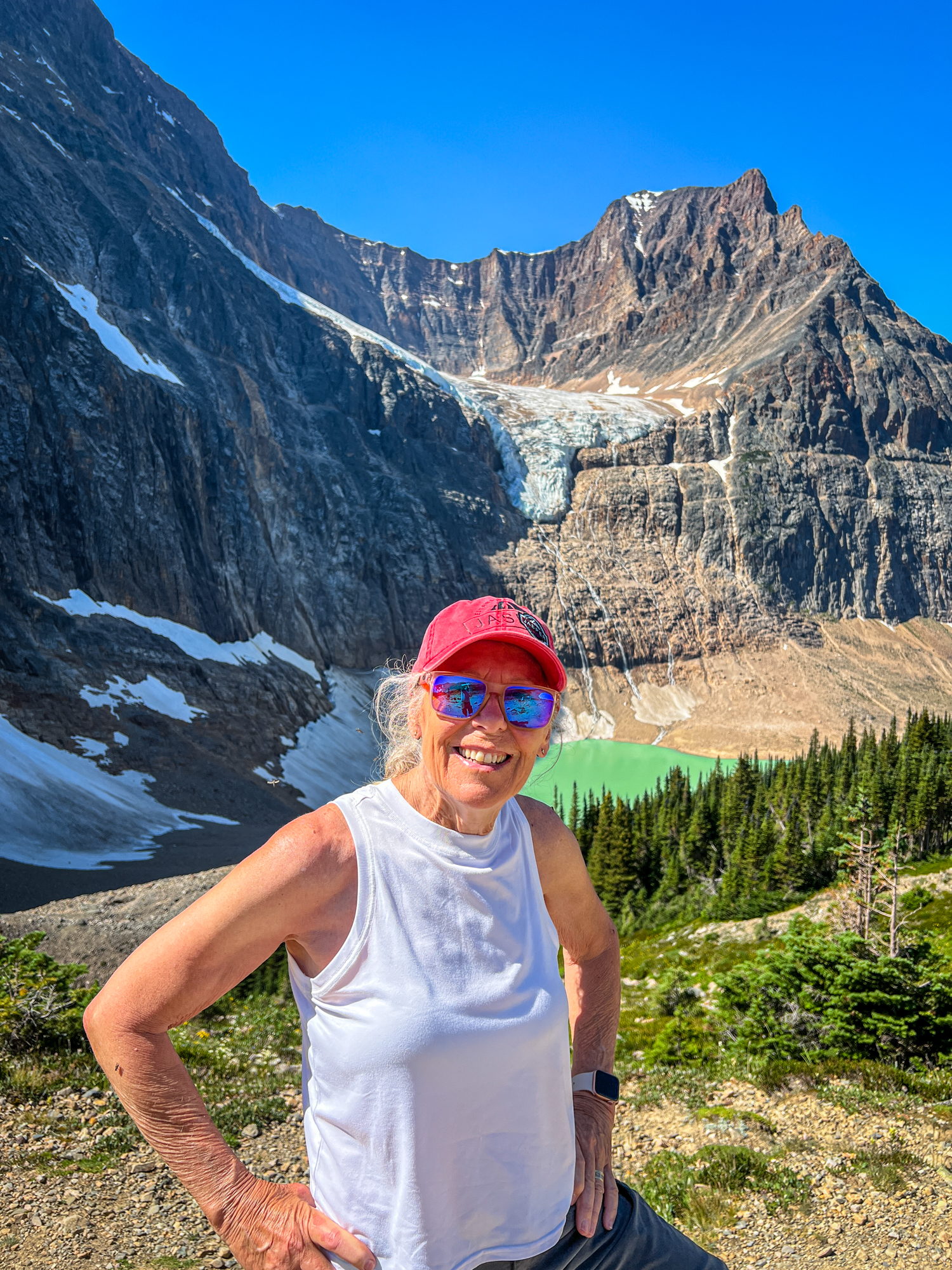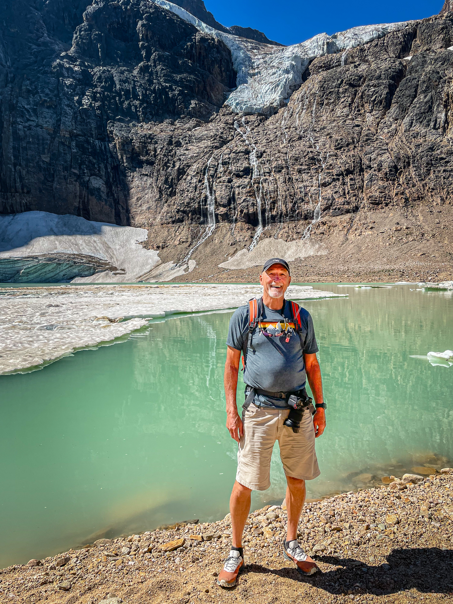 I took the side hike to the lake at the foot of the glacier while Patty continued on up to the actual meadows, The lake hike offered different but still impressive views of the glacier and the surrounding peaks. The trail is steep and rocky, and it descends down to the shore of a glistening glacial lake. The lake is fed by meltwater from the Angel Glacier and is a beautiful, green color. The trail continues along the shore of the lake, offering even more stunning views of the glacier across the lake which is dotted with small icebergs.