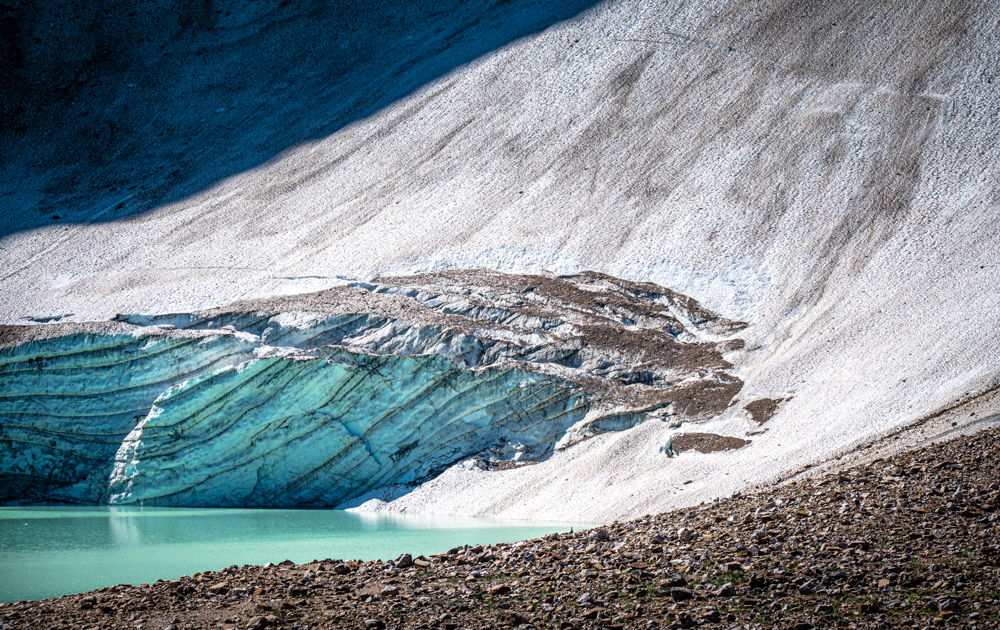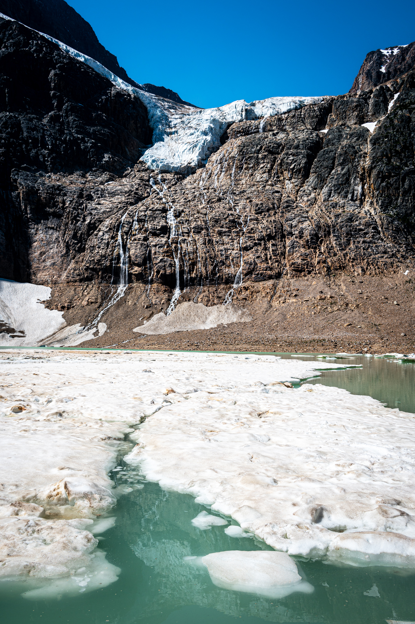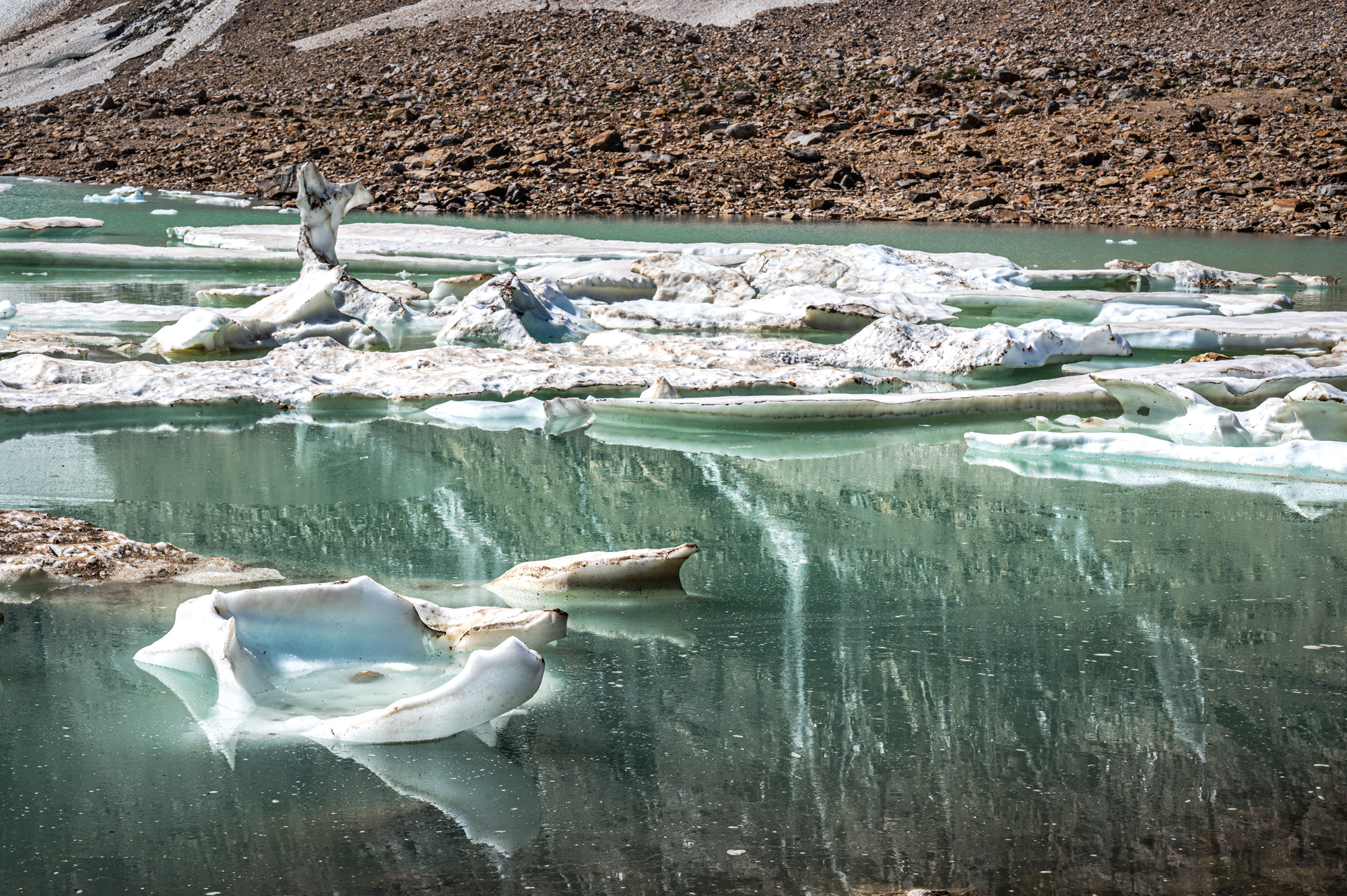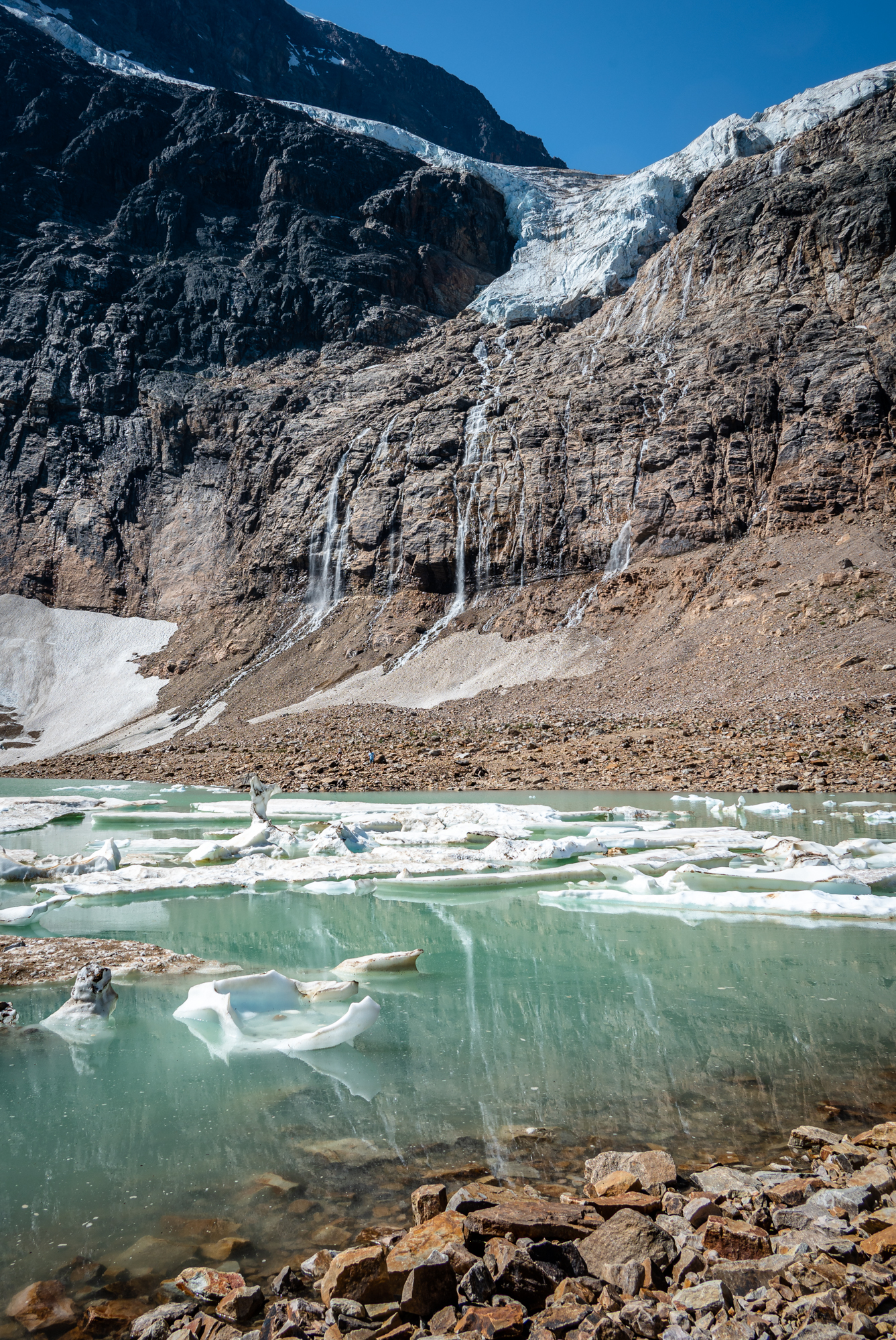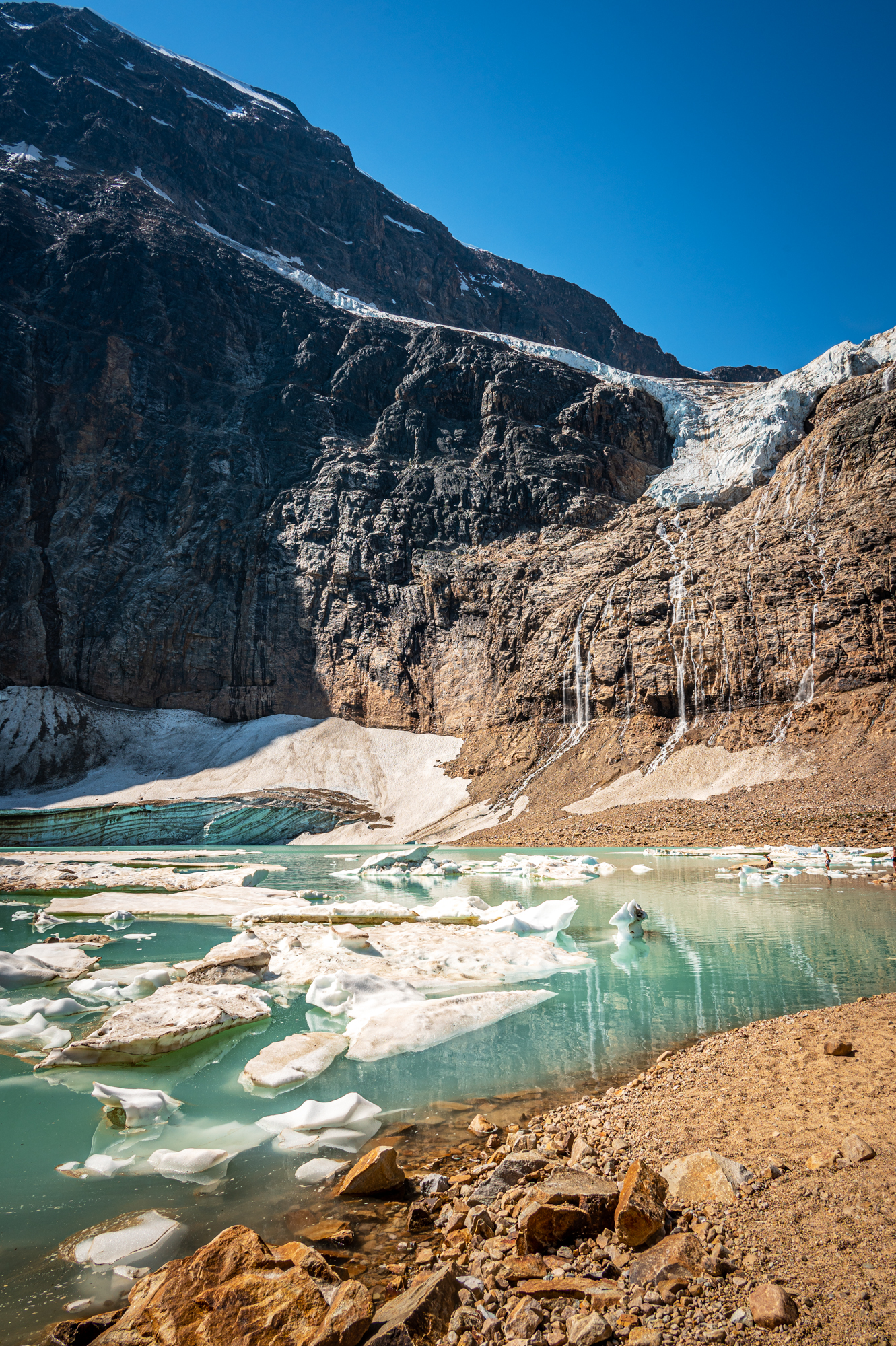I took the side hike to the lake at the foot of the glacier while Patty continued on up to the actual meadows, The lake hike offered different but still impressive views of the glacier and the surrounding peaks. The trail is steep and rocky, and it descends down to the shore of a glistening glacial lake. The lake is fed by meltwater from the Angel Glacier and is a beautiful, green color. The trail continues along the shore of the lake, offering even more stunning views of the glacier across the lake which is dotted with small icebergs.
