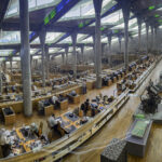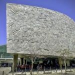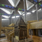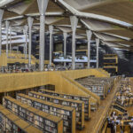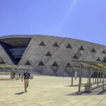 celebrated center of learning in the classical world. Designed by the Norwegian firm Snøhetta, the building’s distinctive sun-disc shape and slanted granite façade evoke a rising sun, symbolizing knowledge emerging from the sea. Its vast circular reading room, one of the largest in the world, cascades downward in tiers beneath a glass roof that floods the space with natural light.