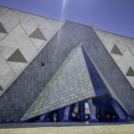 civilization. Conceived in the 1990s and built over two decades, the museum represents Egypt’s most ambitious cultural project. Its modern, angular design—created by Heneghan Peng Architects—aligns visually with the pyramids and features expansive glass and alabaster walls that echo the geometry of the desert landscape.