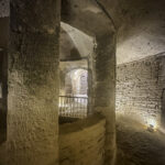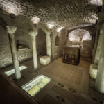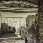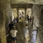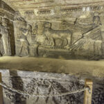 Visitors descend a spiral staircase into chambers carved from solid rock, where wall reliefs display an unusual fusion of styles—Roman banquet scenes appear alongside Egyptian deities depicted with Hellenistic features. The Hall of Caracalla, which may contain the remains of soldiers massacred during the reign of Emperor Caracalla, adds to the site’s historical mystery.