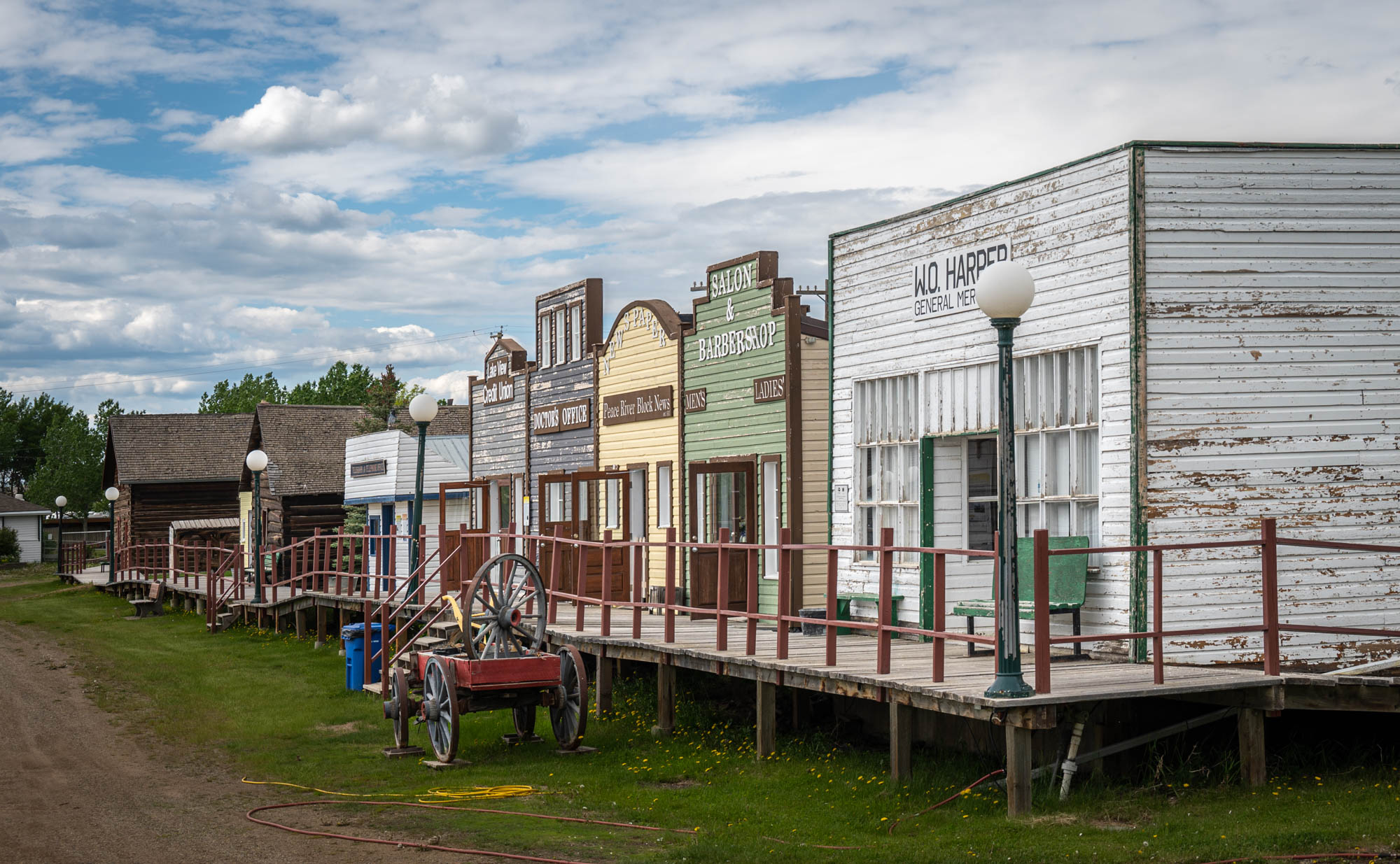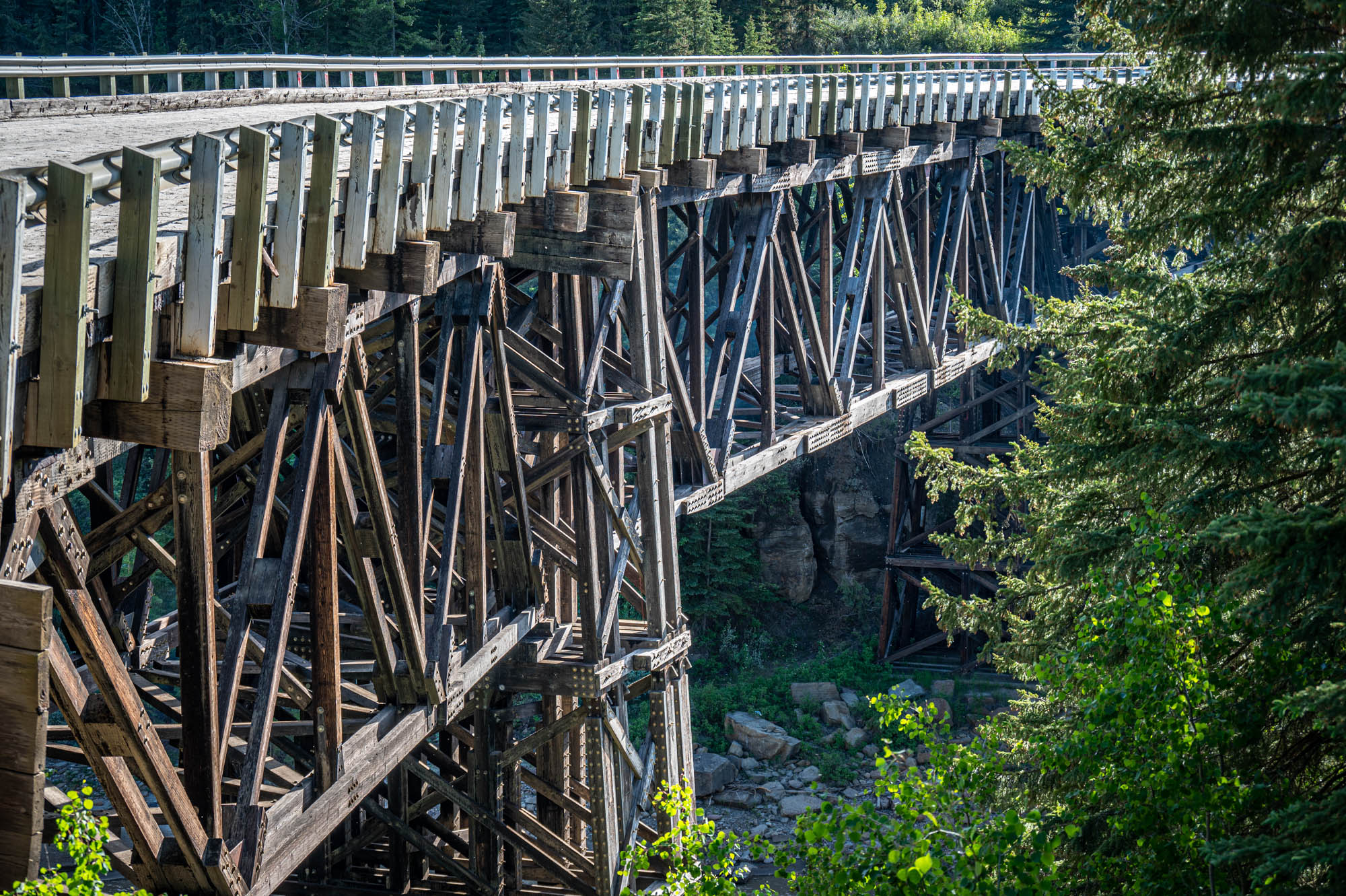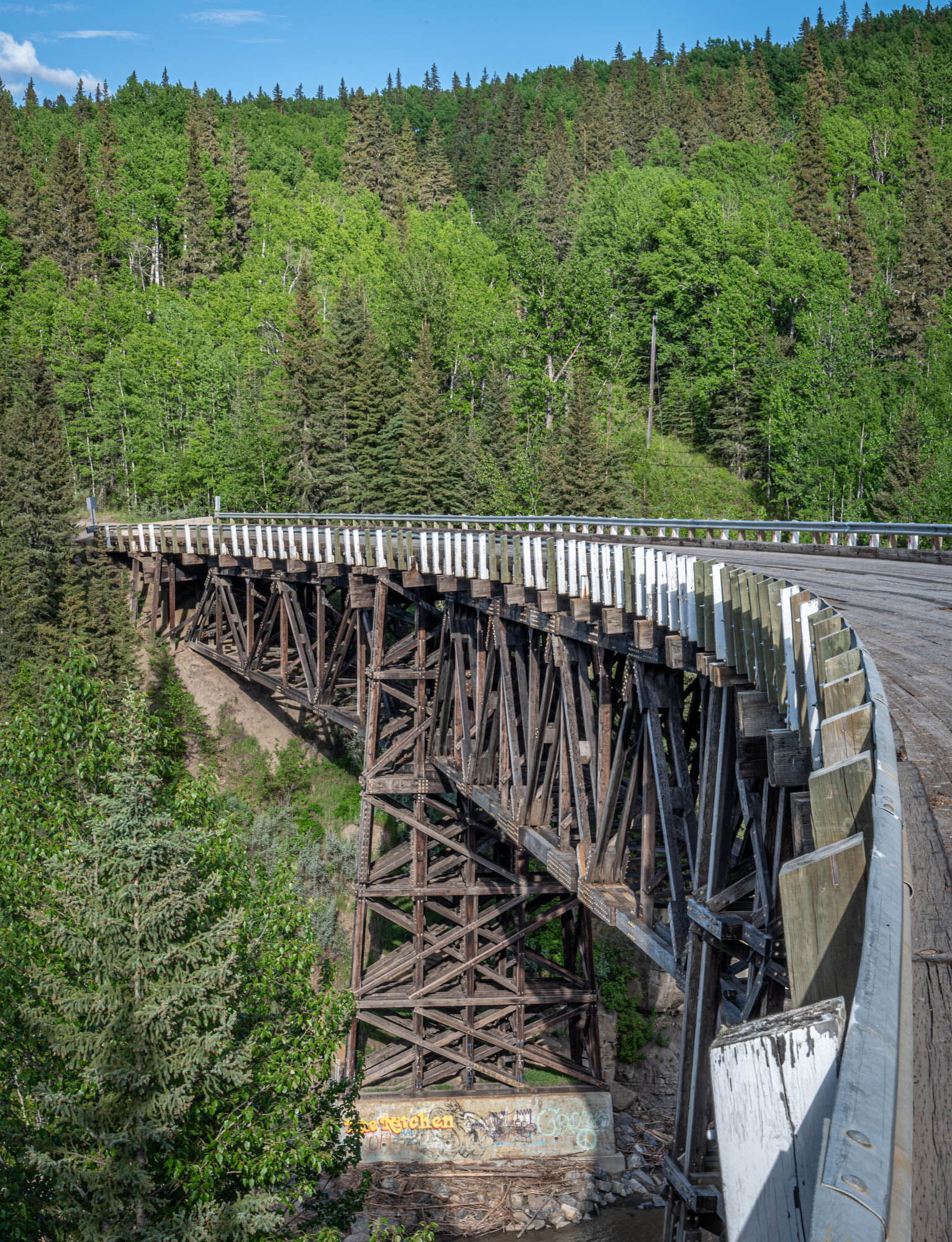 While in Dawson Creek, we made sure to take a drive out to see the Kiskatinaw River Bridge. This bridge, which is now located off the current highway, was an important part of the original Alaska Highway. The Kiskatinaw River Bridge was built in 1942, this three-span timber bridge has an amazing nine-degree curve, but it was soon replaced by a more permanent steel truss bridge. The steel truss bridge was in use until the 1960s, when it was replaced by a newer, wider concrete bridge. The steel truss bridge was then moved to its current location next to the Kiskatinaw River.