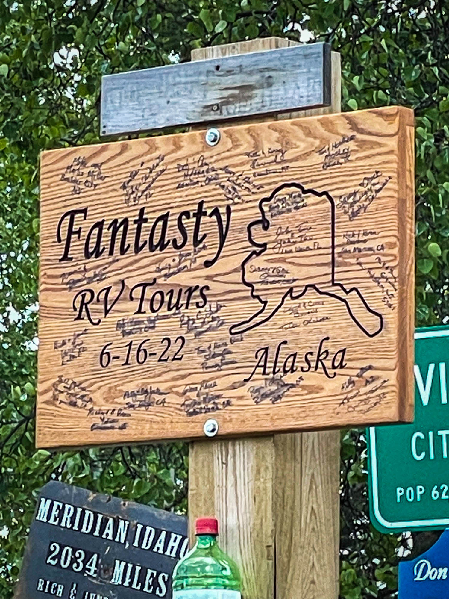 Once we arrived in Watson Lake, we went to the famous Signpost Forest. The Signpost Forest is a unique attraction that began in 1942 by a homesick US soldier, named Carl K Lindley of Danville, IL, who put up a sign with the name of his hometown. Today, it has more than 88,000 signs from around the world. The Signpost Forest was designated a Yukon Historic Site on August 30, 2013. We also hung our RV tour sign, it was a fun and unique way to commemorate our journey on the Alaska Highway. After hanging our sign, we went to the Northern Lights show, which was truly amazing. We were able to witness the colorful and mesmerizing display of the aurora borealis. It was an unforgettable experience and something we won’t forget. Click on thumbnail to view image