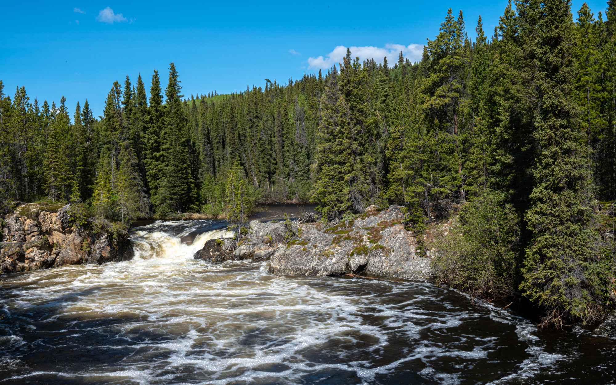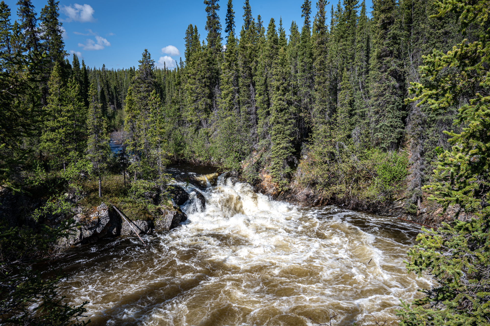 On our way to Whitehorse, we crossed the continental divide, which is a geographical term that refers to the point at which the direction of water flow changes from flowing towards the Pacific Ocean to flowing towards the Arctic Ocean. We also stopped at Rancheria Falls Recreation Site to view the picturesque waterfalls that were a short hike from the road, the views were stunning.