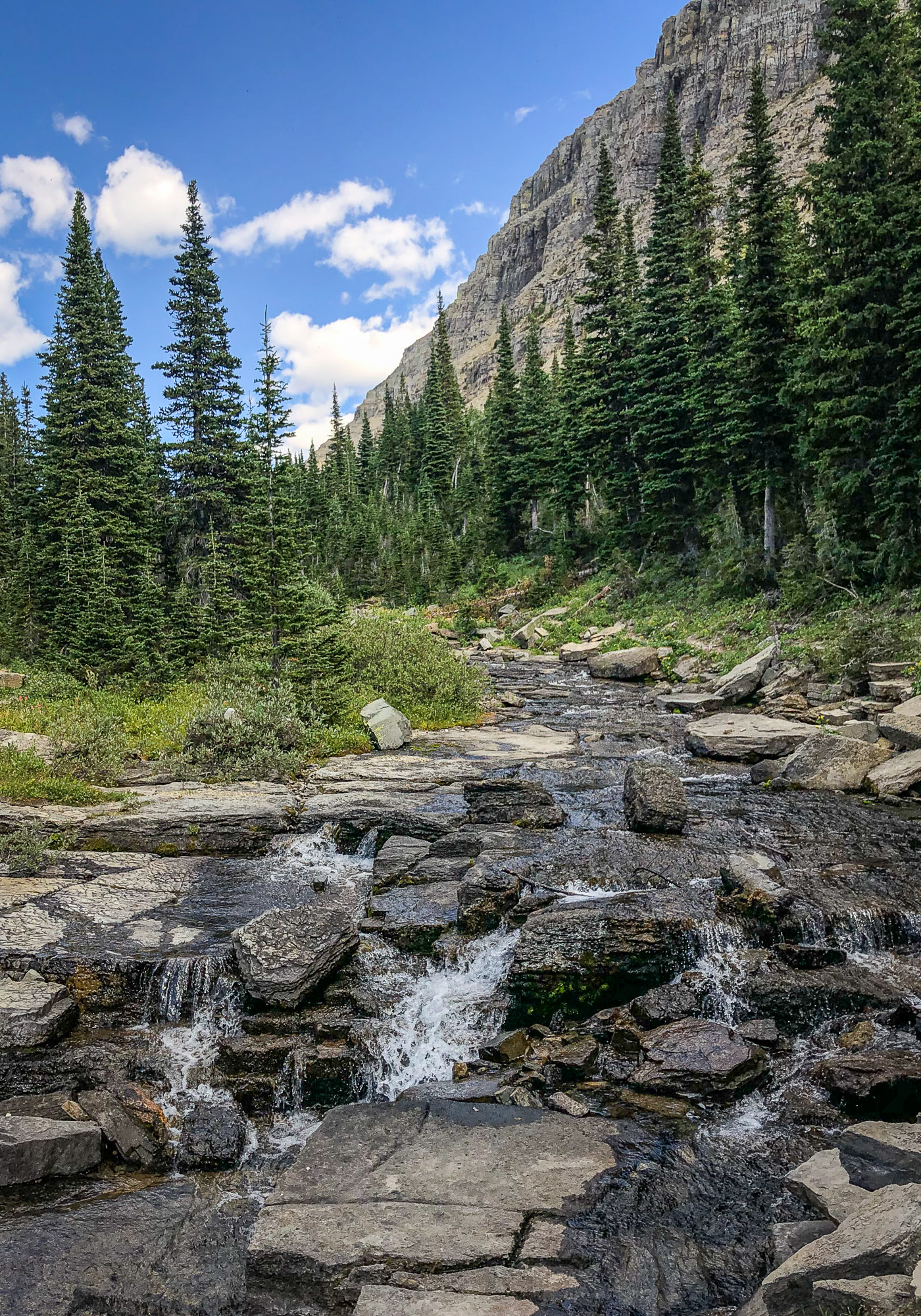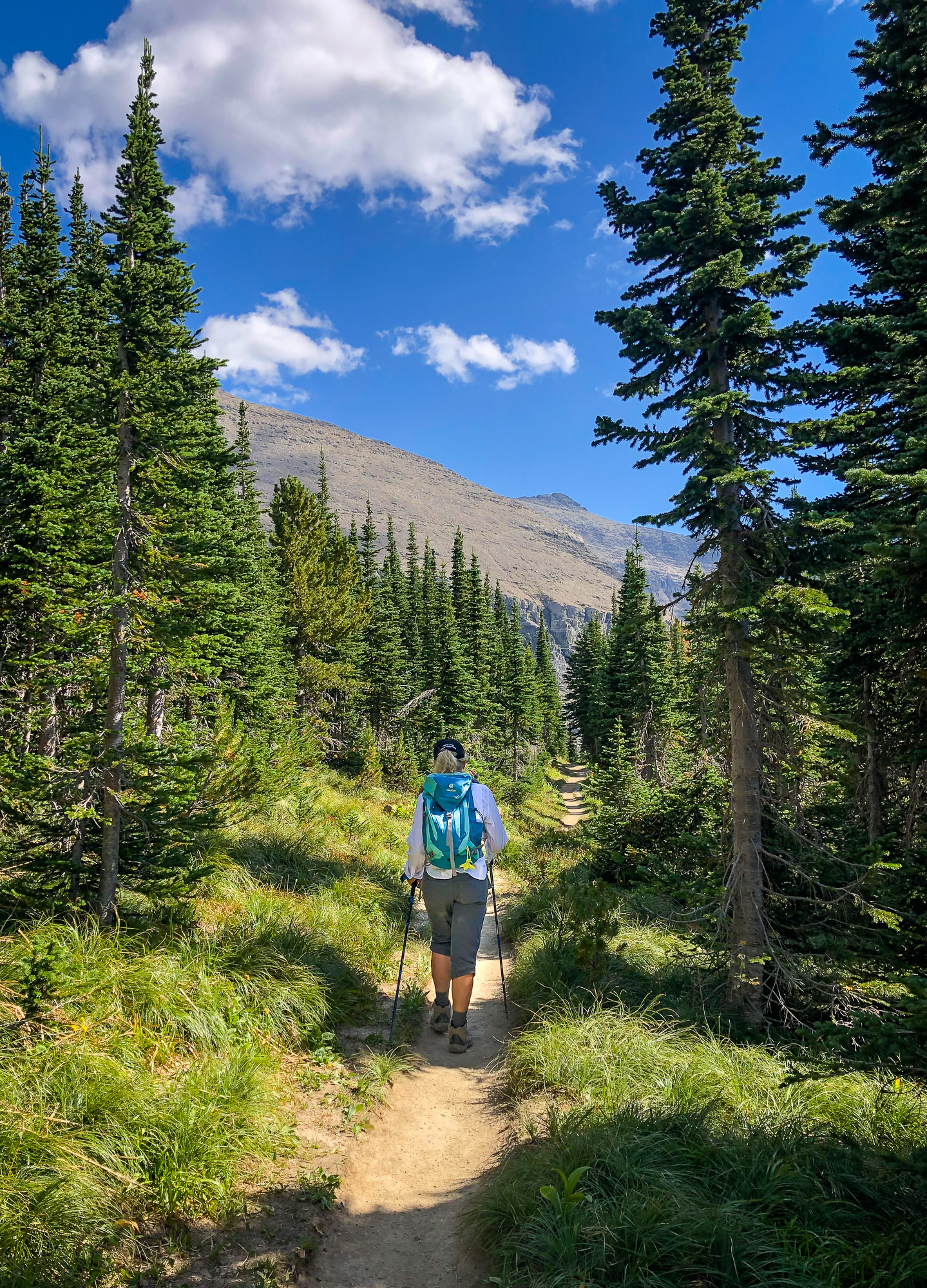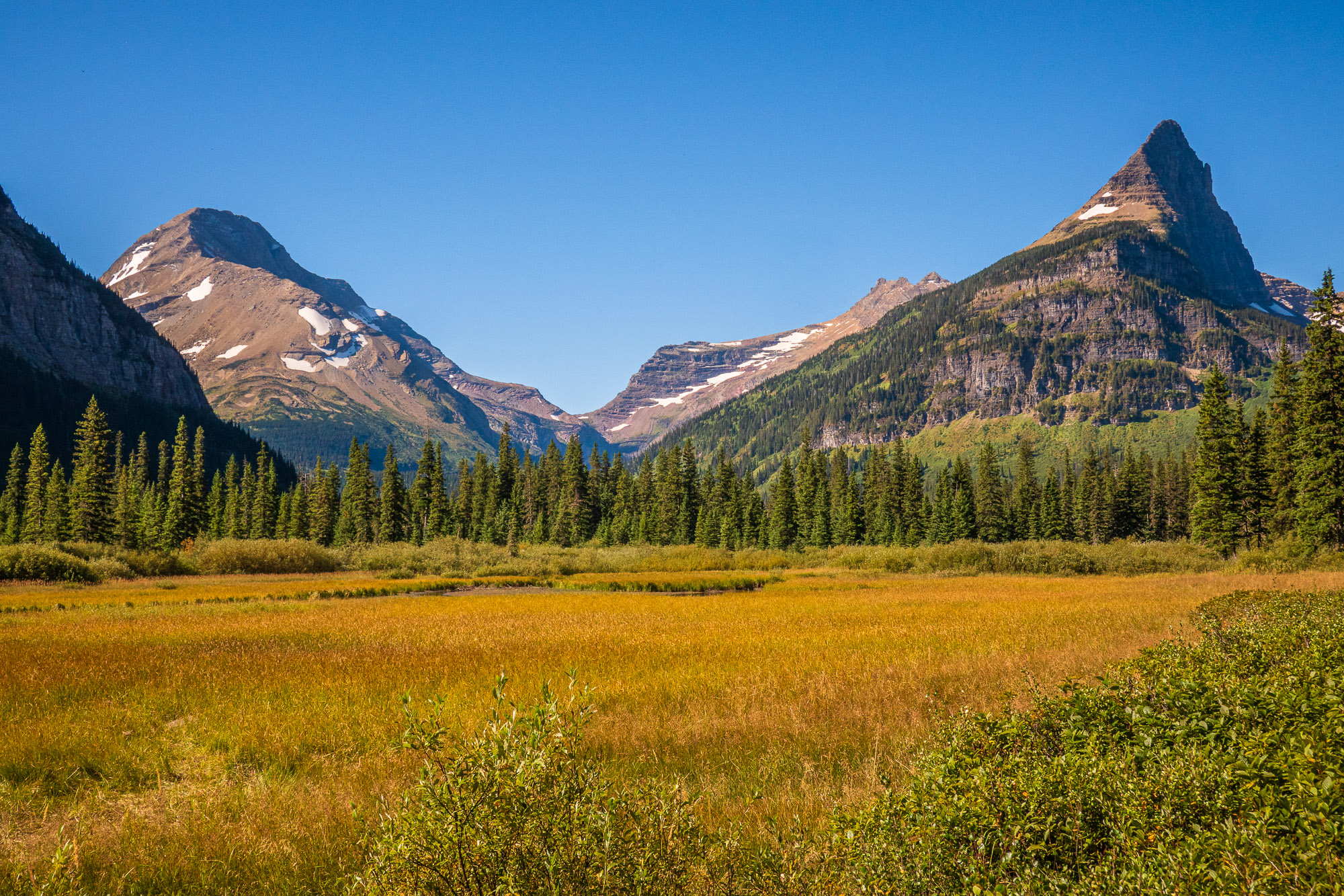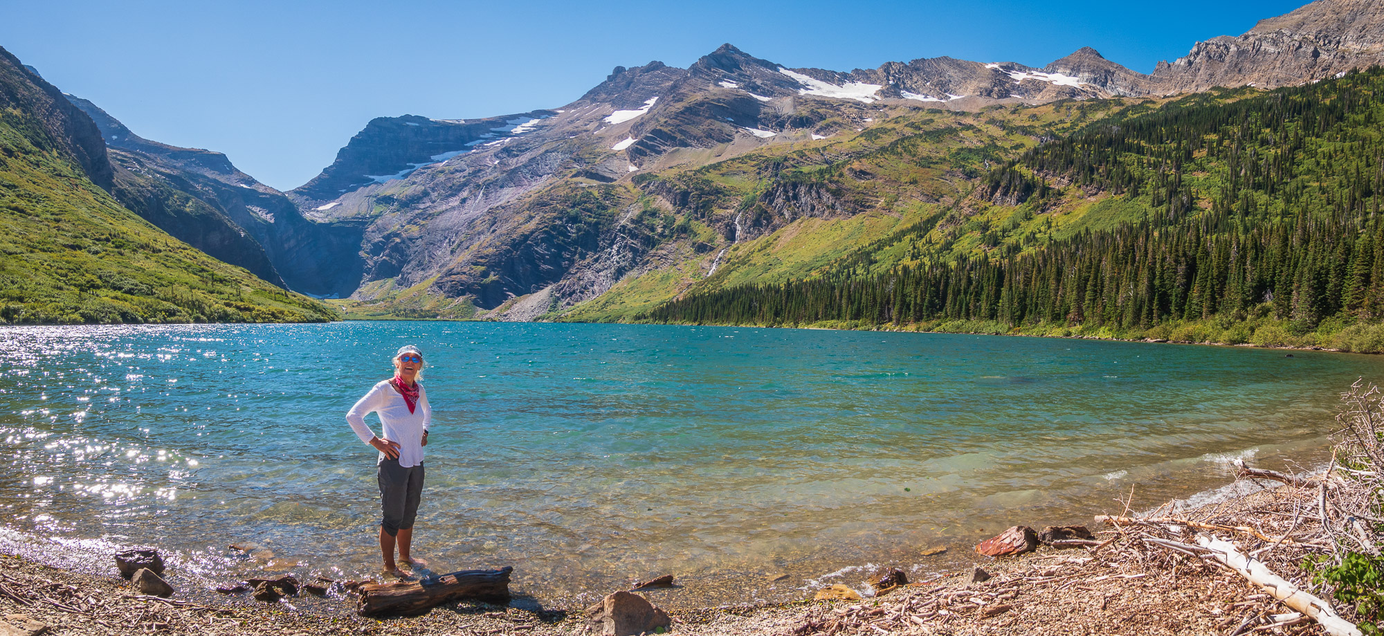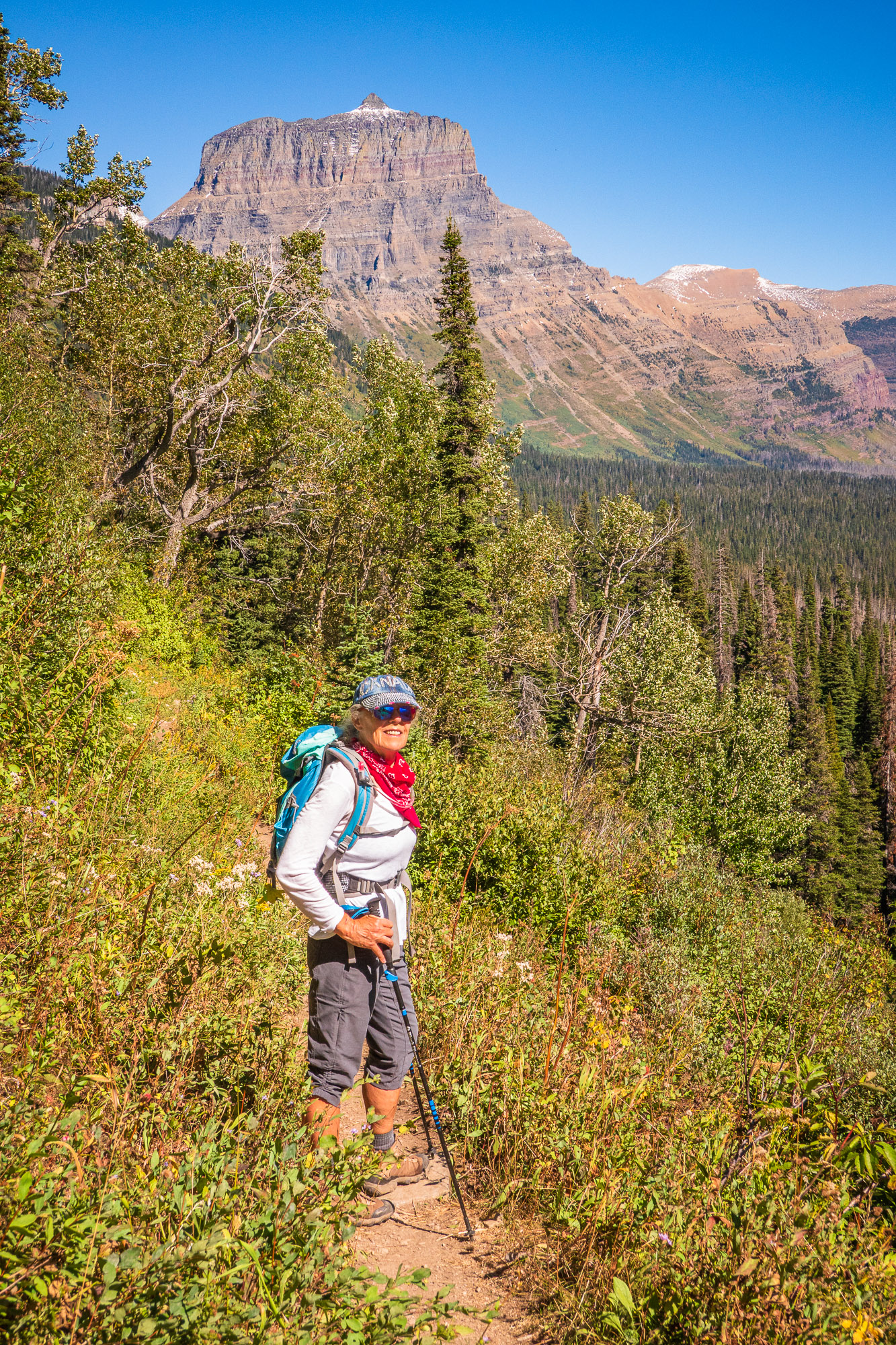 Two more wonderful day hikes that we had not done before while at Glacier National Park, the first was to Gunsight Lake from the Gunsight Pass Trailhead on the Going-to-the-Sun Road east of Logan Pass. The trail started in a gradual descent for about a mile when we came to Deadwood Falls, a beautiful 10-foot waterfall with deep crystal clear pools of water above and below the falls. We continued on for about 2 miles to the St Mary River and the beautiful valley where we were hoping to spot a moose that some hikers had seen earlier. No luck this time. A little further along we came to an opening in the canopy that provided us with one of the most magnificent views in Glacier. In the foreground is an open grassy meadow alongside Mirror Pond and framing the background is Mount Jackson, Gunsight Mountain and Fusillade Mountain, as well as Gunsight Pass.